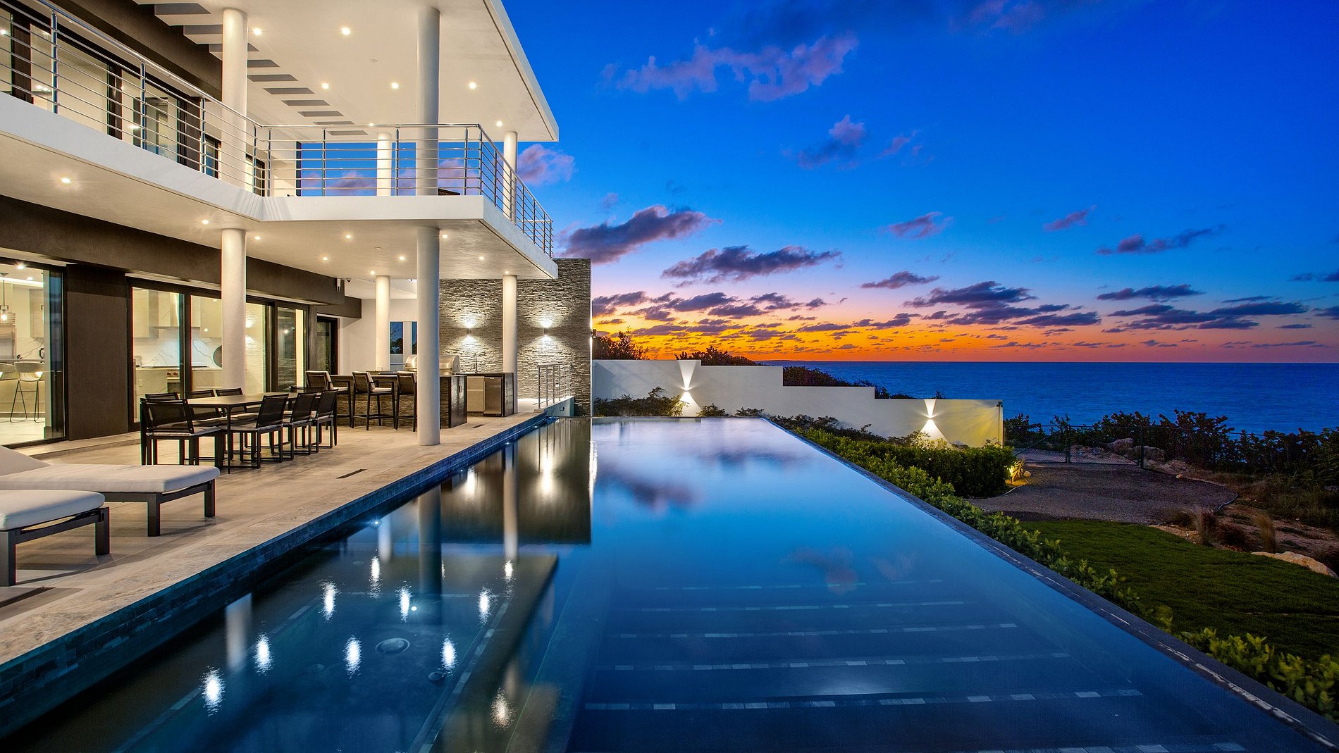 Son architecture audacieuse se caractérise par des lignes géométriques épurées, une palette de tons neutres et de larges baies vitrées qui s’intègrent parfaitement à l’environnement naturel. À l’extérieur, une piscine à débordement spectaculaire semble se fondre dans l’horizon turquoise. Plusieurs terrasses meublées, une piscine chauffée (sur demande) et des espaces repas extérieurs permettent de se détendre tout en profitant de la beauté intacte de Black Garden.