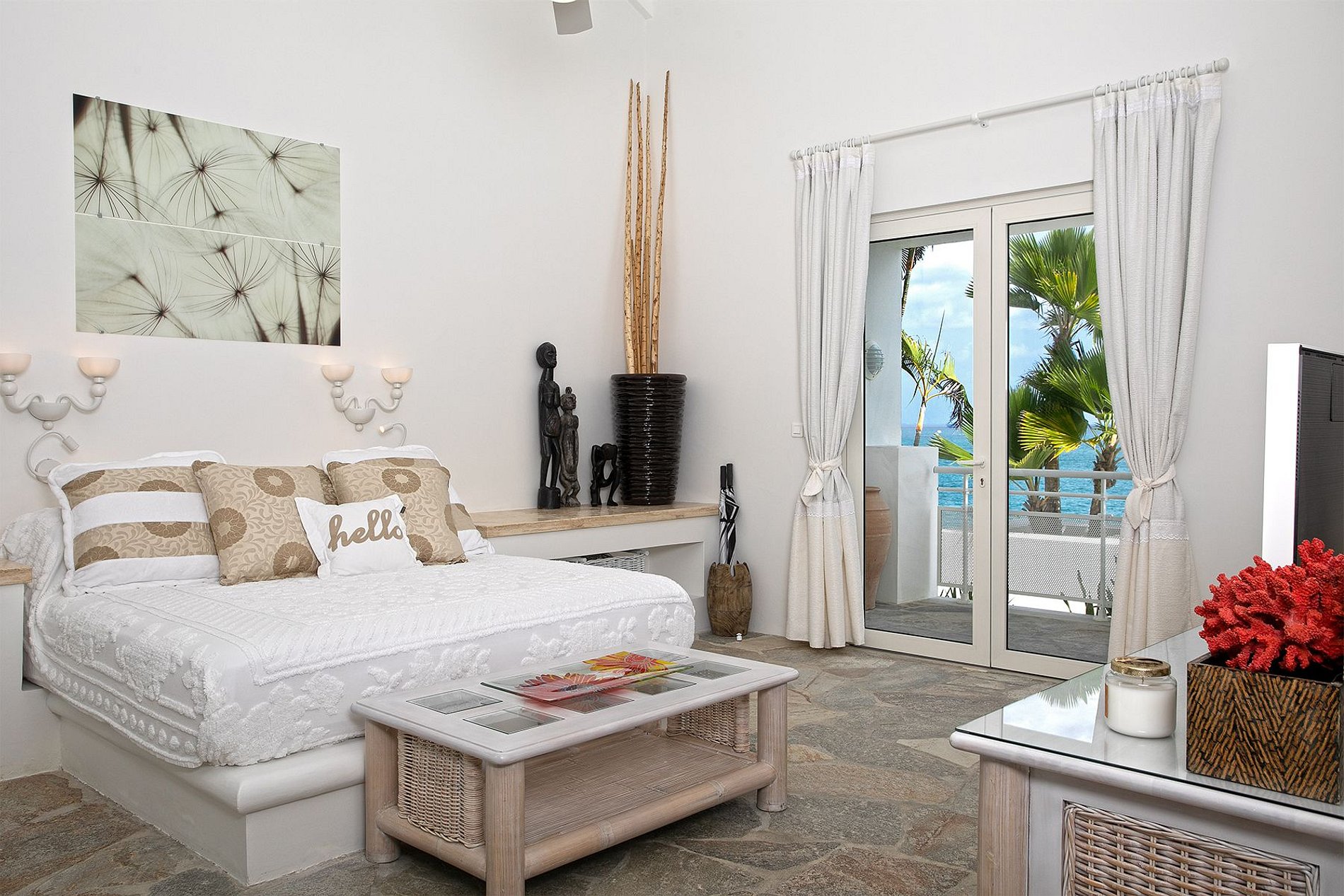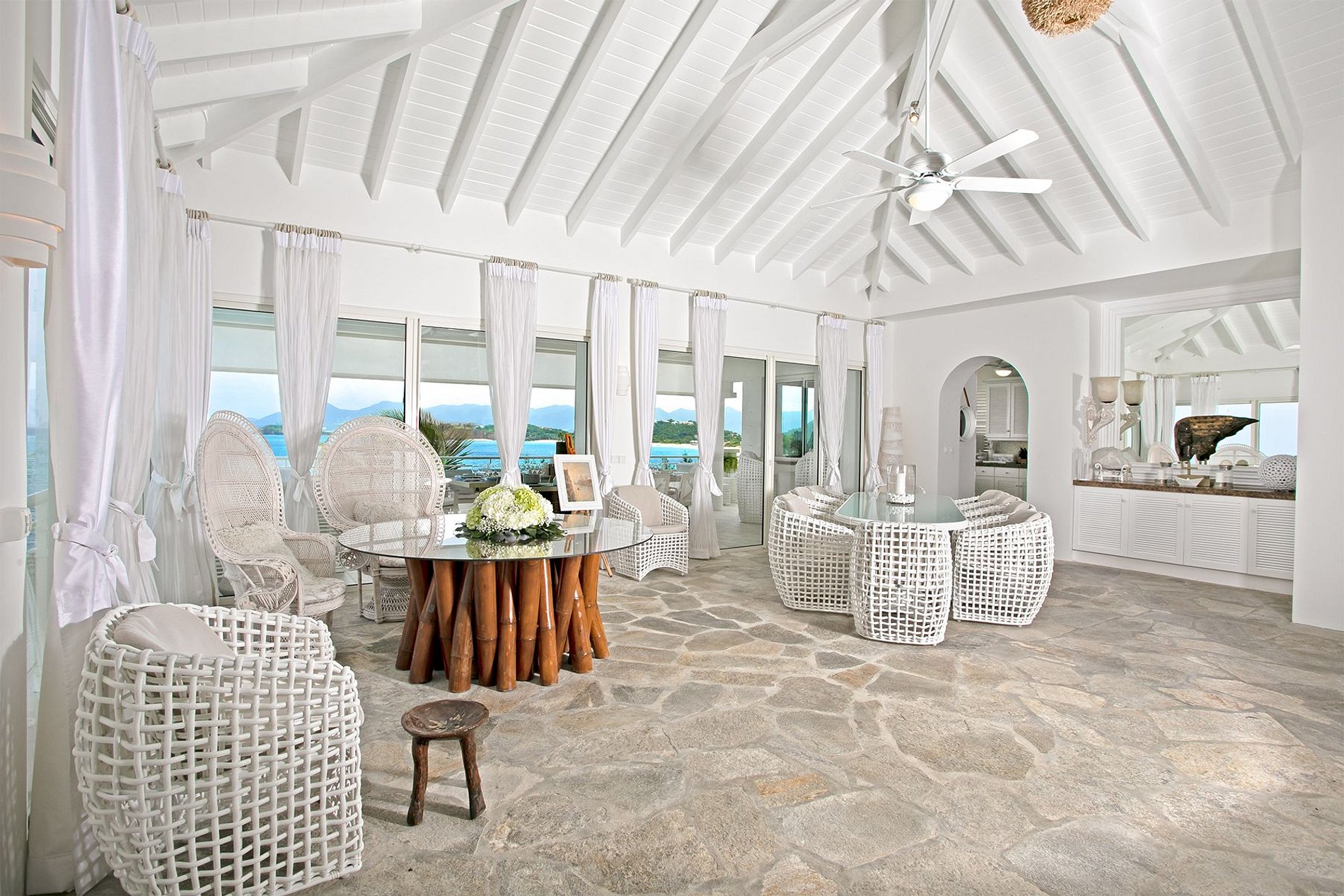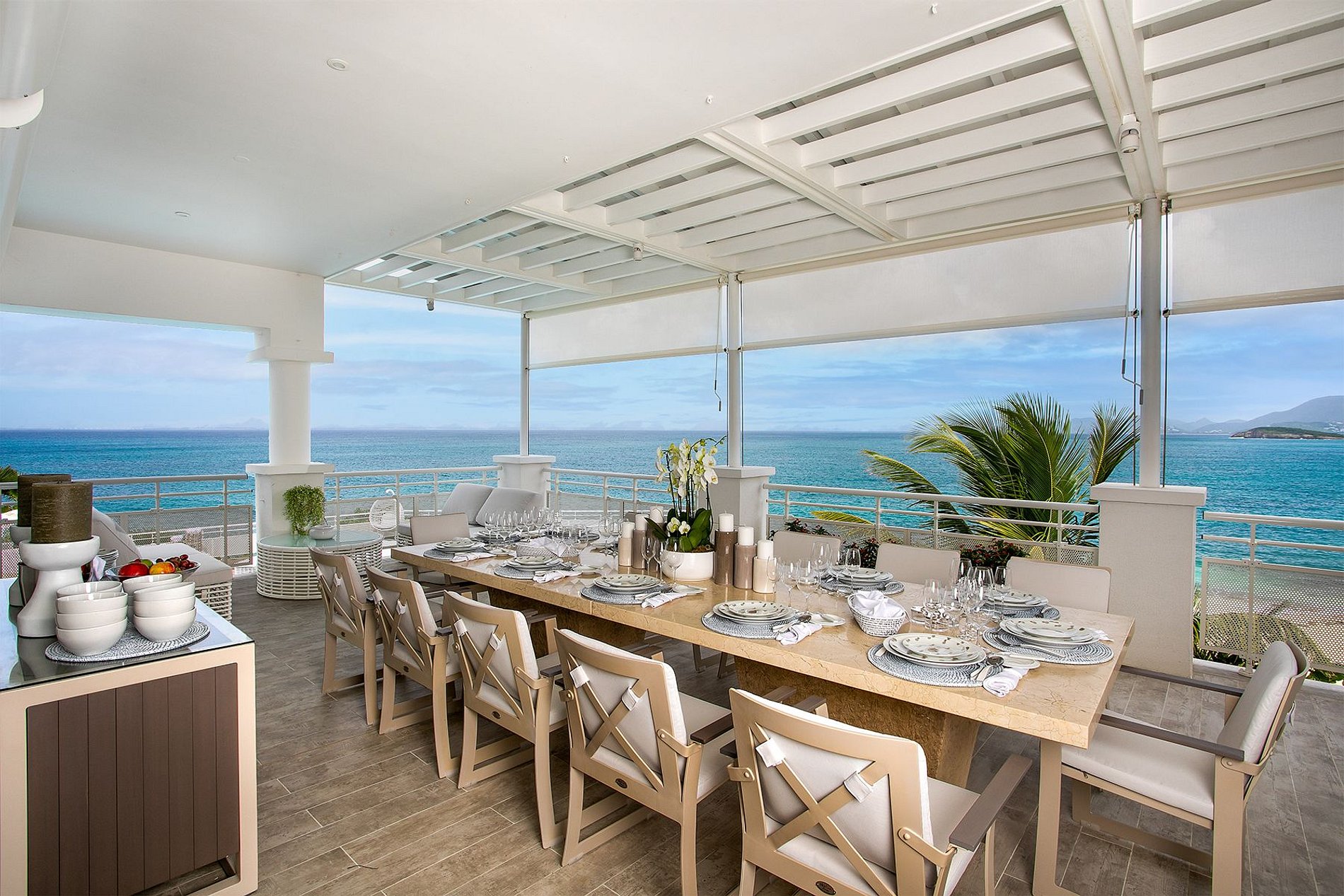 L’entrée principale s’ouvre sur un hall voûté et un espace lumineux avec de hauts plafonds, un sol en pierre naturelle et des baies vitrées offrant une vue imprenable sur l’océan. Le plan ouvert relie harmonieusement les espaces repas intérieurs et extérieurs, un salon TV et une cuisine gastronomique avec équipements professionnels et vue mer. Une grande terrasse mène à une piscine asymétrique suspendue au-dessus de la mer, tandis qu’une seconde piscine avec lits intégrés et gazebo est installée juste au bord de la plage.