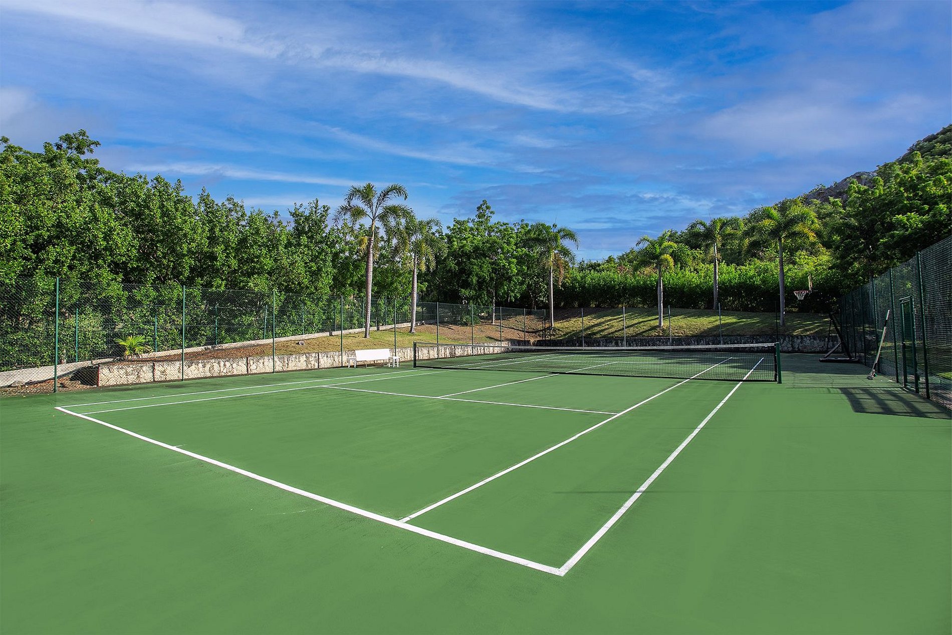 À l’extérieur, vous trouverez une piscine chauffée à débordement, un jacuzzi, une cabane en bord de plage et un accès direct au sable. La villa comprend également un spa privé, une salle de sport et un court de tennis. Avec service de chef, ménage quotidien et concierge, cette maison avec personnel complet garantit une expérience luxueuse et sans effort, à seulement 20 minutes de l’aéroport.