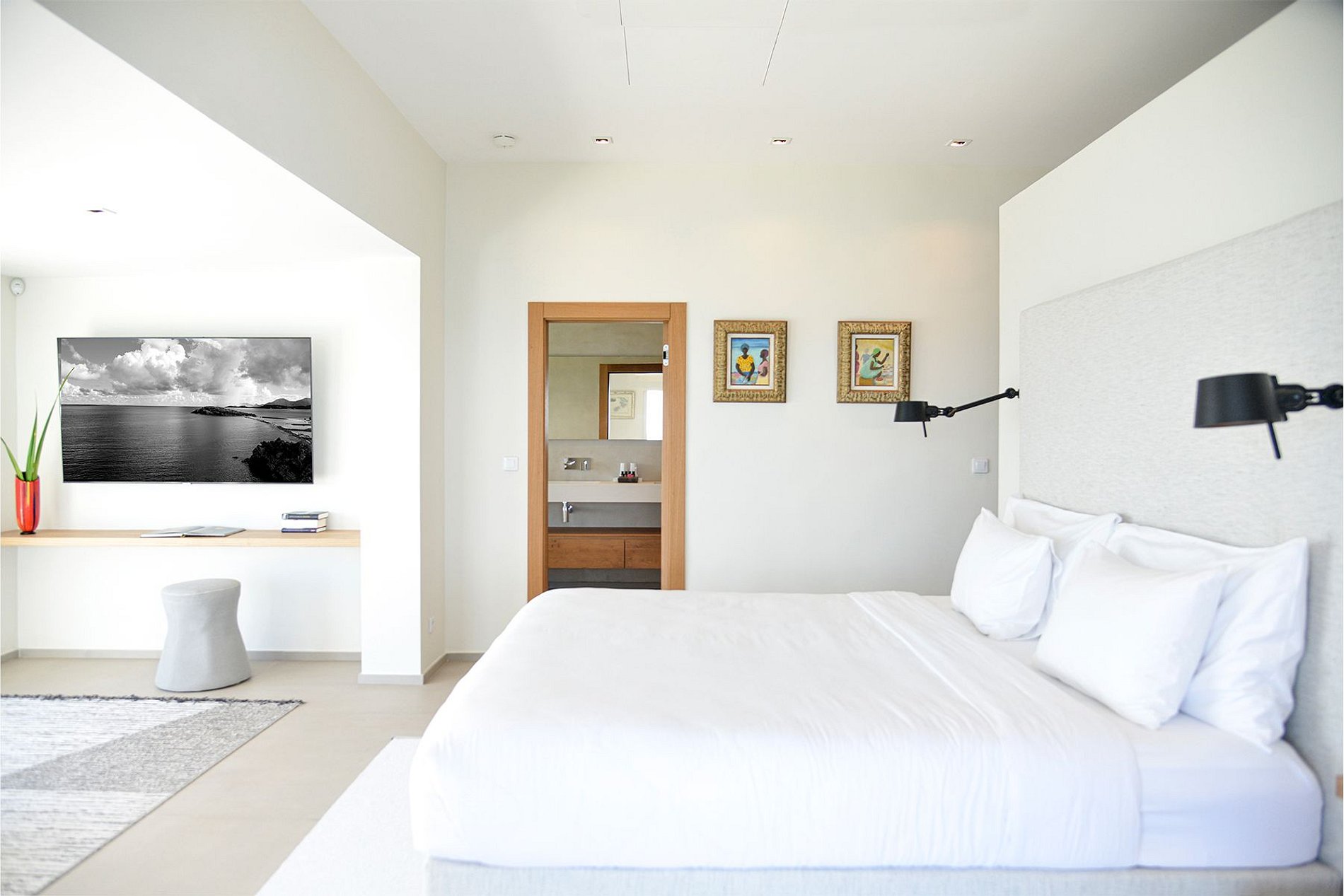 Chaque chambre dispose d’un lit king-size, d’une salle de bain privative avec double vasque, douche à effet pluie et dressing. Trois chambres se trouvent à l’étage supérieur, deux près du jardin et de la piscine. Toutes offrent un accès extérieur, une vue sur la mer et une atmosphère paisible.