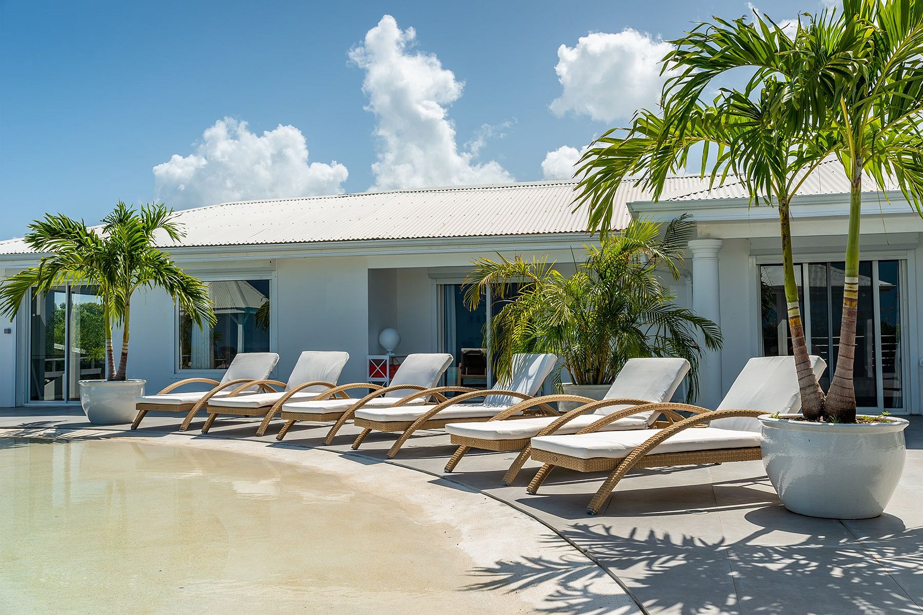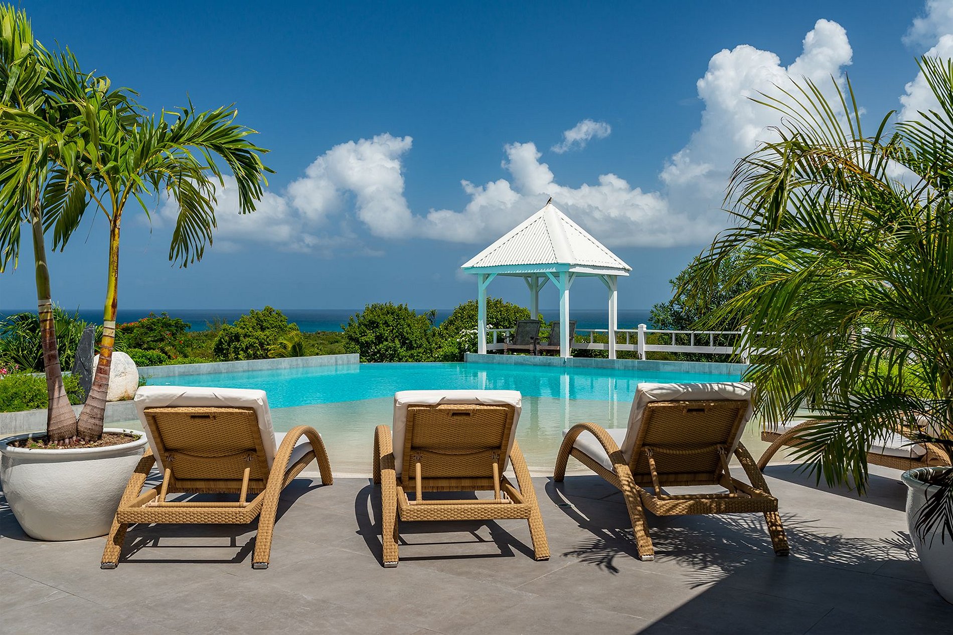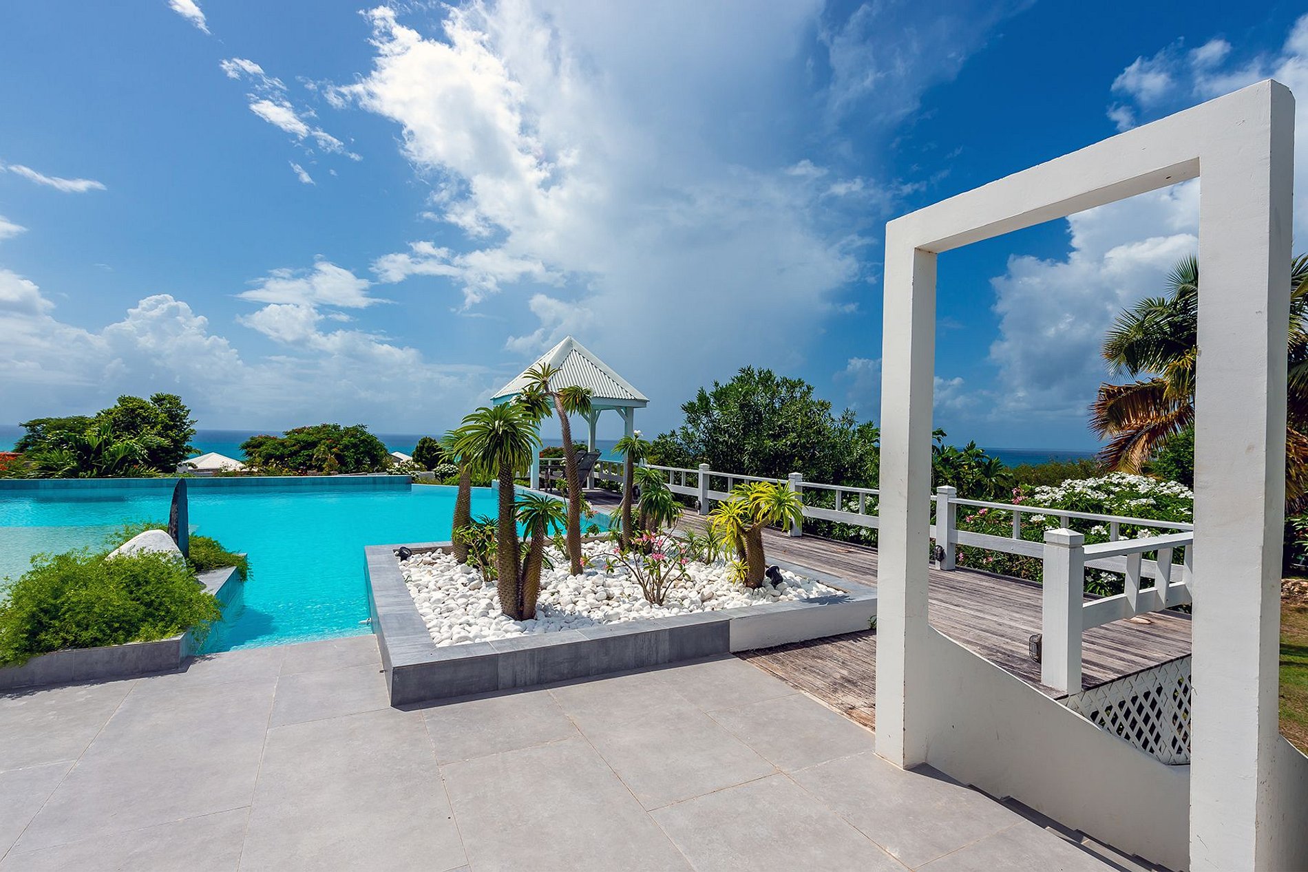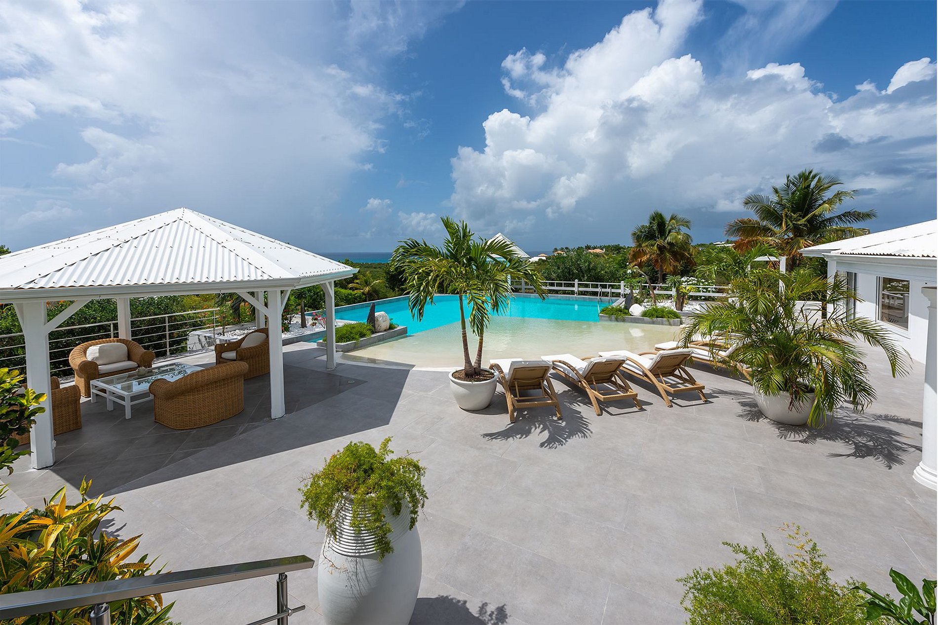 Les terrasses prolongent les espaces de vie, avec des coins ombragés pour se détendre ou dîner face à la mer. Un escalier descend vers la piscine en forme de L, entourée de jardins de cactus et de palmiers. La piscine dispose d’une entrée en pente douce de type plage et d’un gazebo hexagonal avec coin salon supplémentaire.