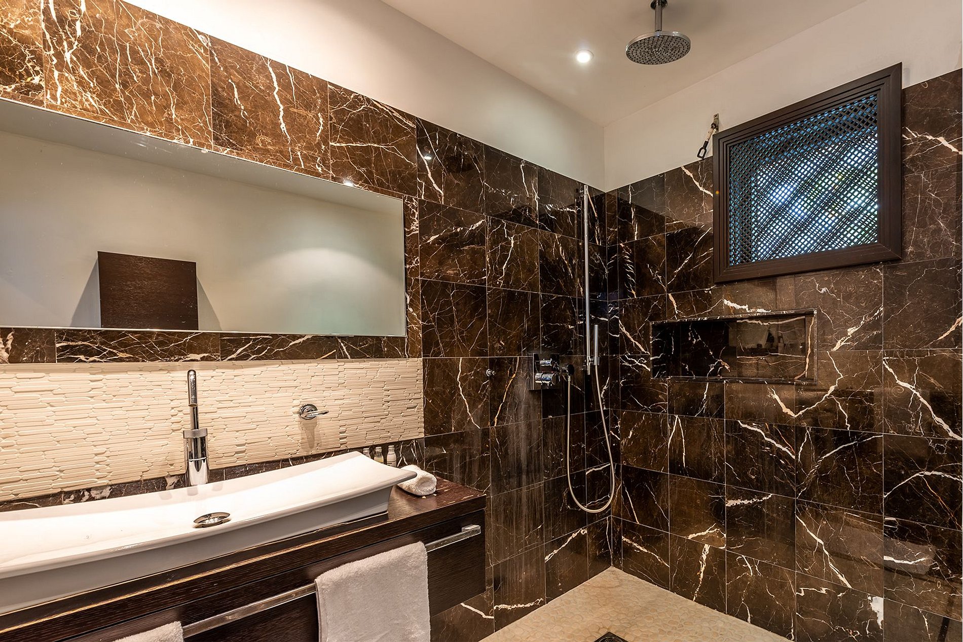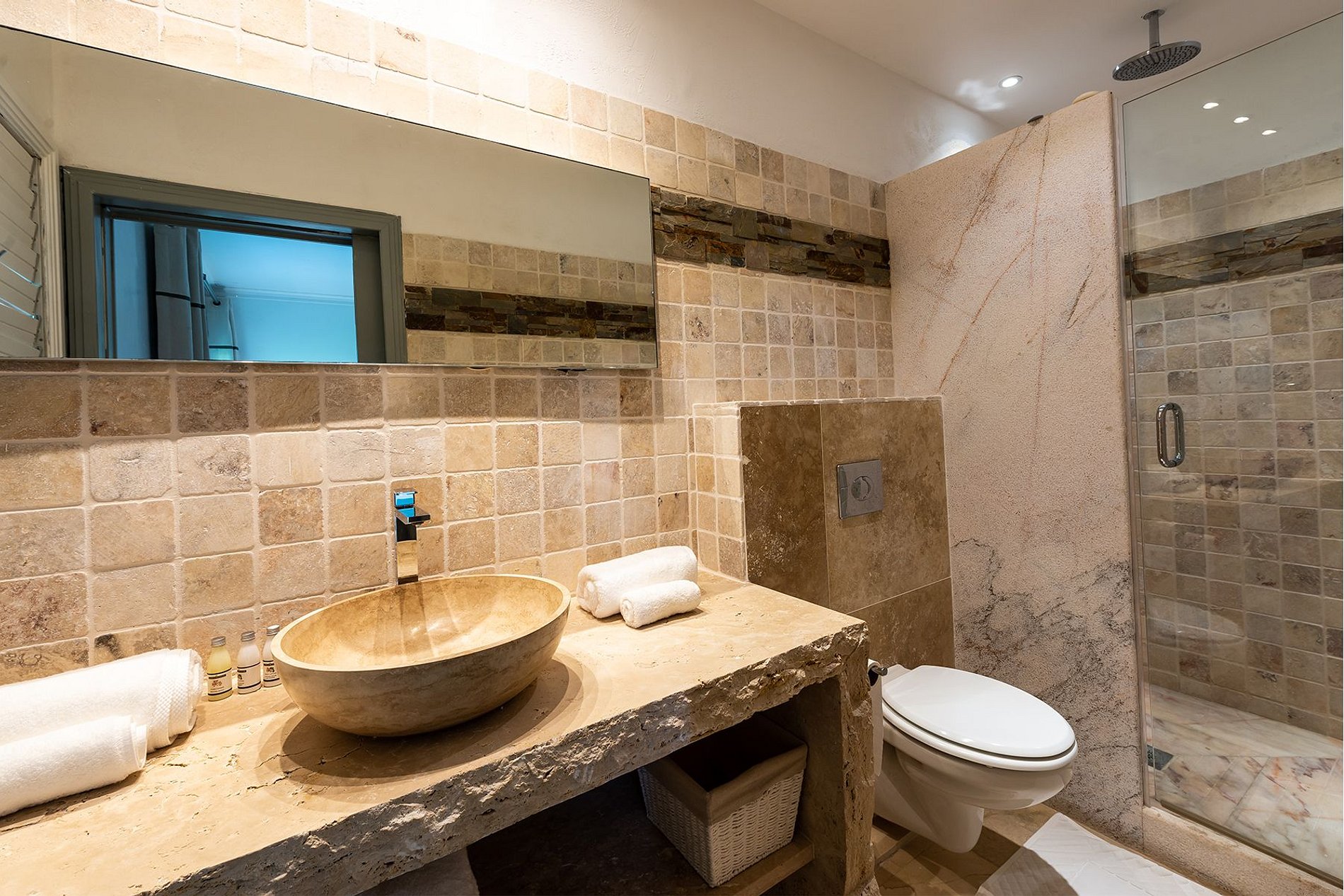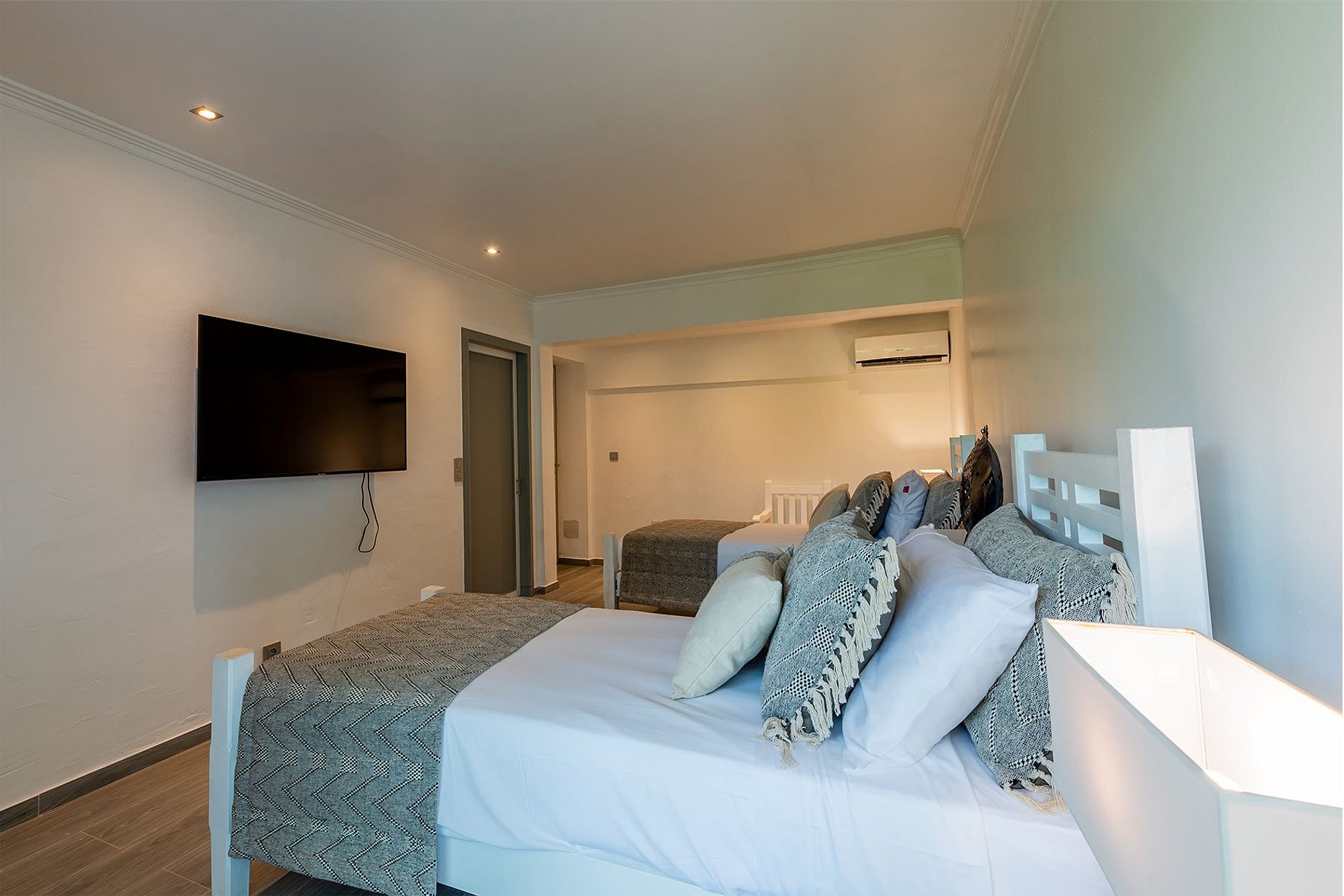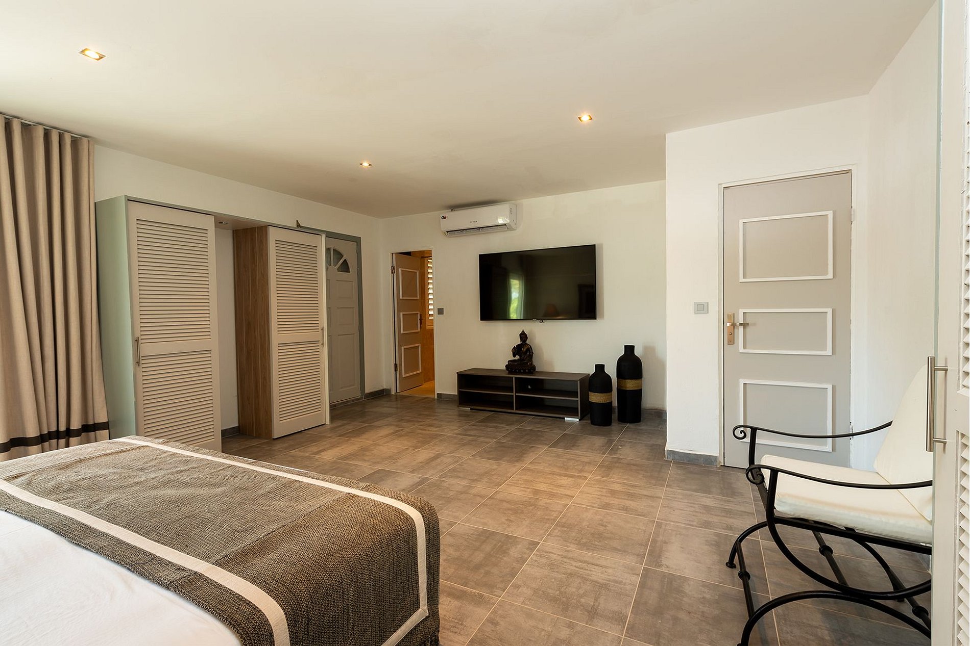 Chacune des cinq chambres dispose d’une salle de bain privée, d’un design sobre, d’une Smart TV et de la climatisation. La suite principale comprend également un dressing. Toutes les chambres sont accessibles de l’intérieur, certaines donnant directement sur la terrasse de la piscine.