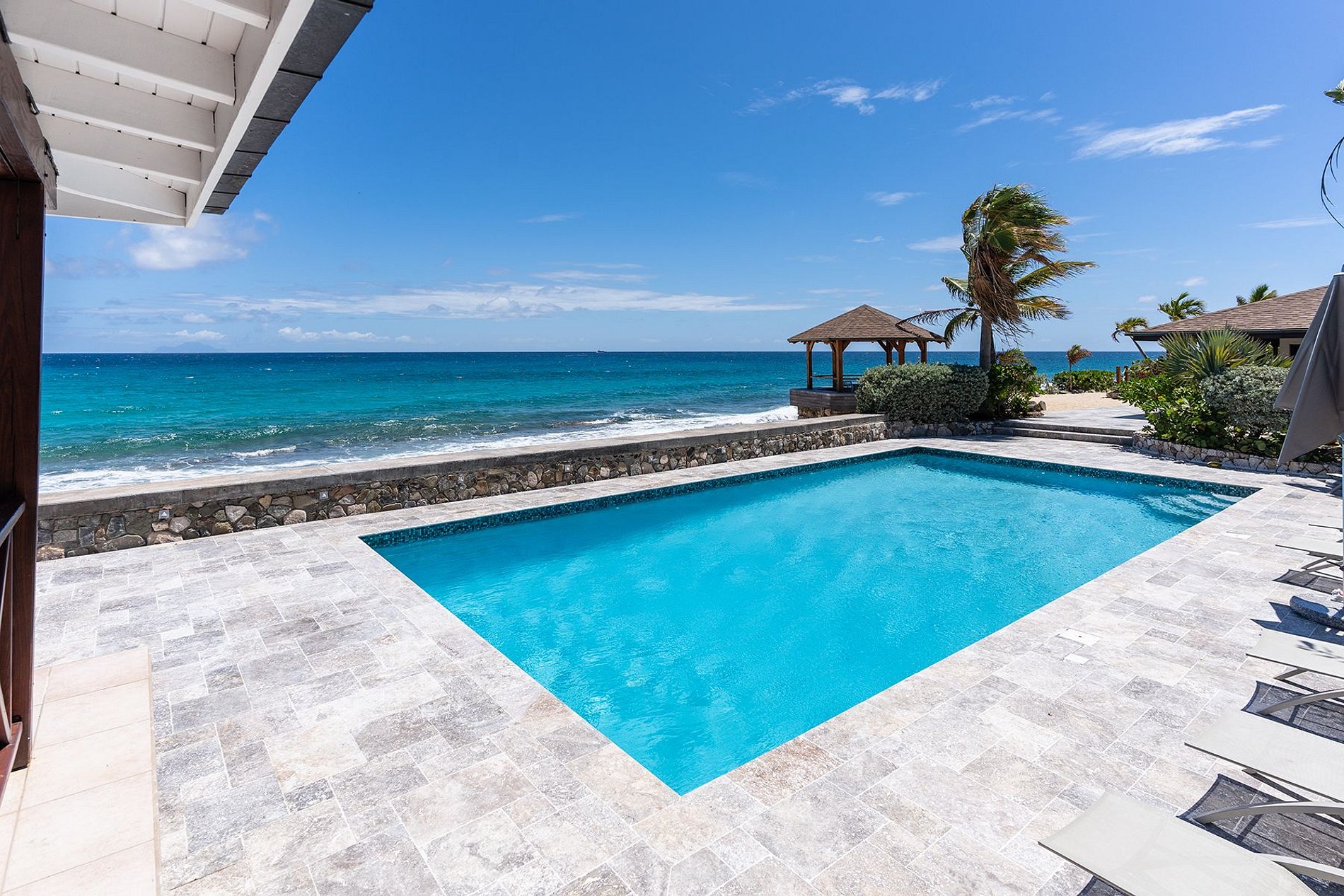 La propriété se compose de deux ailes entourant une piscine sur une grande terrasse en travertin. D’un côté, une annexe de deux chambres avec vue sur la mer, patio privé et kitchenette dans l’une des suites. De l’autre, une vaste pièce à vivre avec mobilier en rotin et teck, tons tropicaux, et une cuisine moderne ouverte sur la terrasse. Des vérandas couvertes prolongent l’espace avec coin repas et salon extérieur.