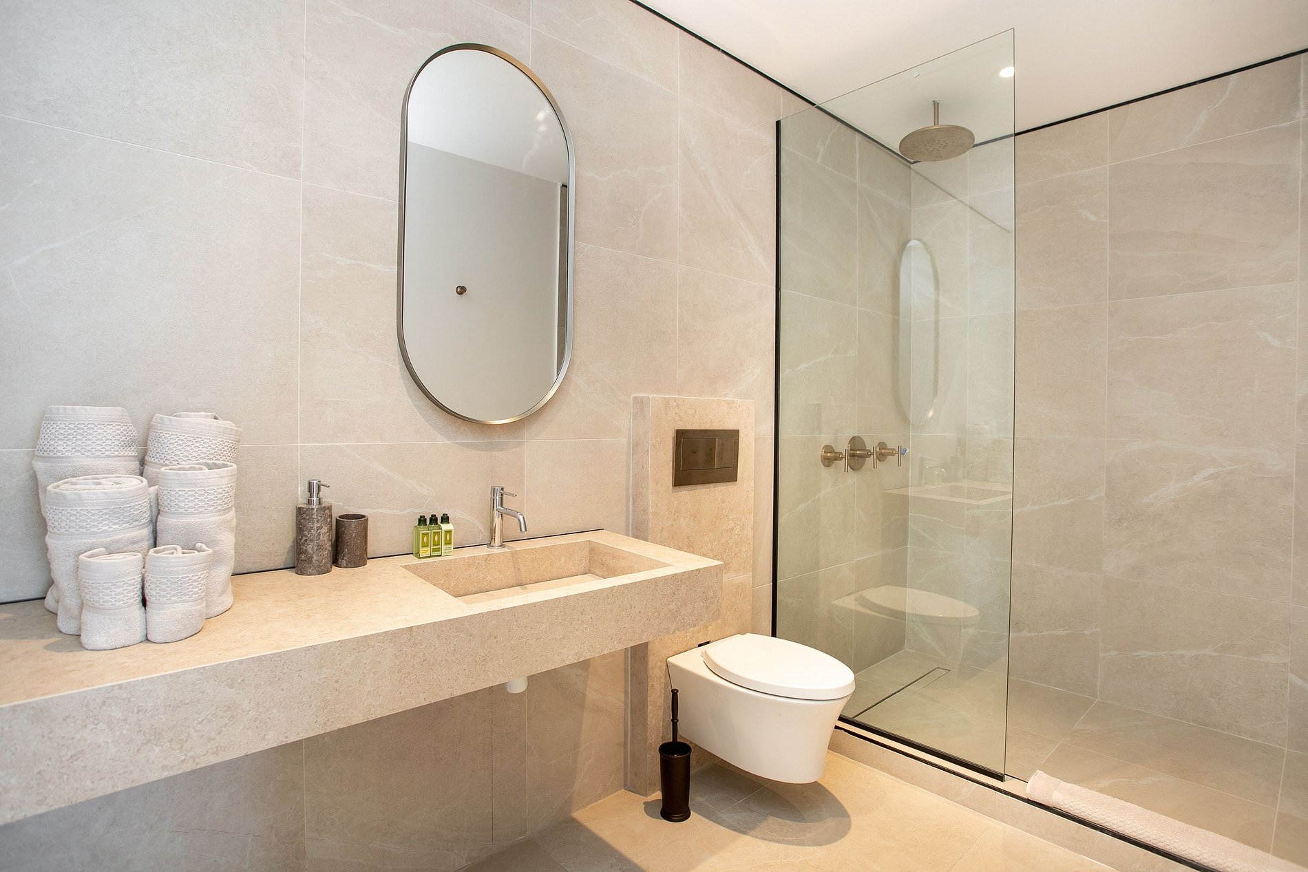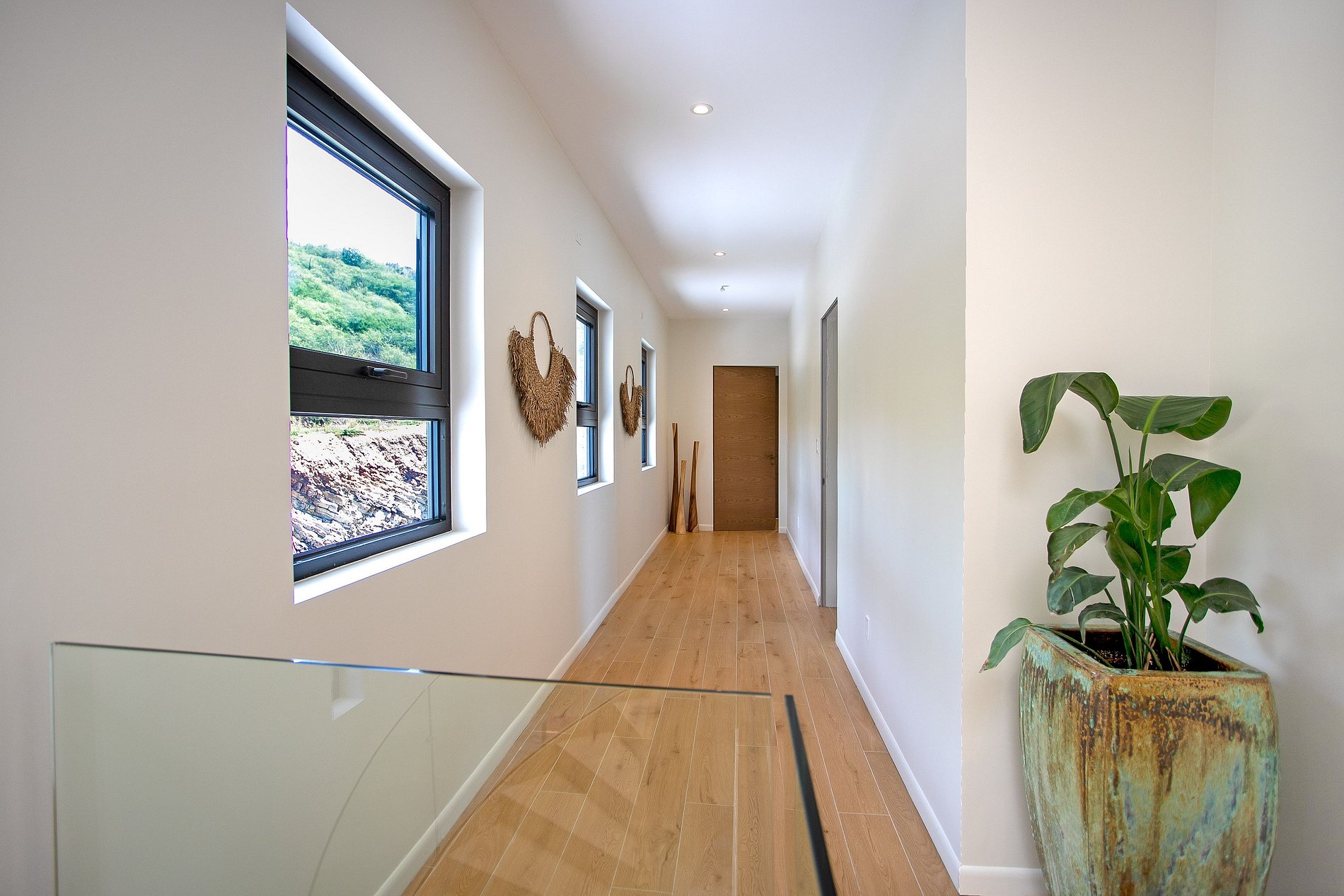 Le niveau principal comprend un grand salon avec plafond cathédrale et vue panoramique sur la mer, donnant sur une terrasse avec piscine à débordement et espace repas couvert équipé d’un barbecue à gaz. La cuisine, moderne et entièrement équipée, s’intègre parfaitement au plan ouvert. Une salle de sport privée est également à disposition pour les hôtes souhaitant rester actifs pendant leur séjour.
