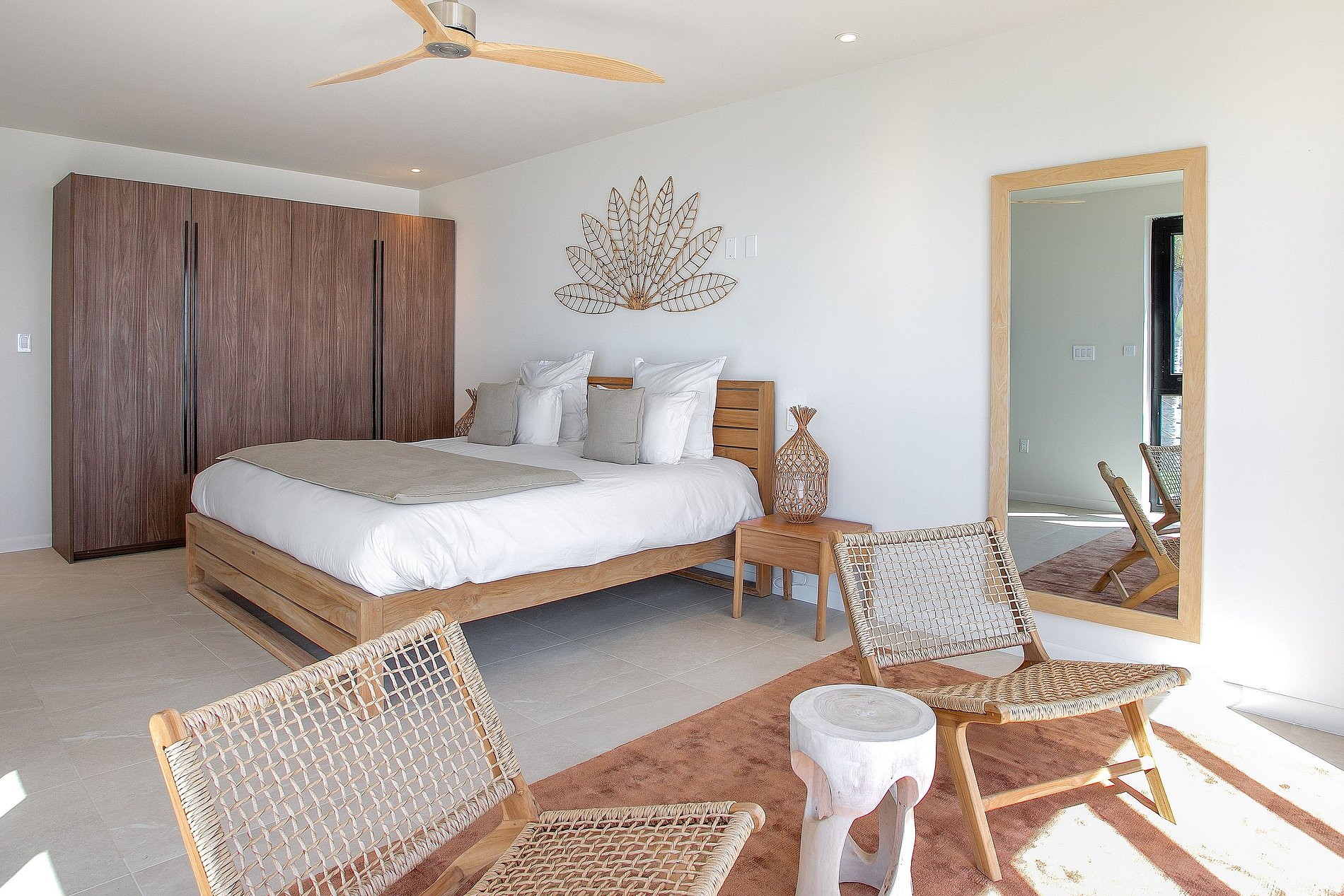 Les six chambres sont réparties sur trois étages et disposent toutes d’une salle de bain attenante, de douches à l’italienne, de la climatisation et d’un accès direct aux espaces extérieurs. La suite parentale comprend également une baignoire et une superbe vue sur la mer. La villa allie intimité, confort moderne et prestations haut de gamme dans l’un des coins les plus paisibles de l’île.
