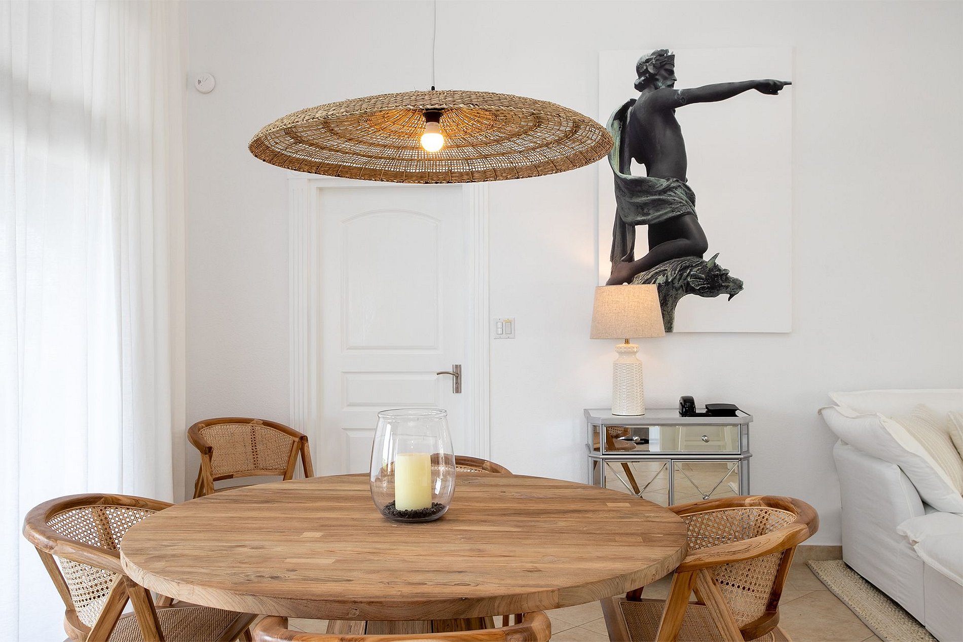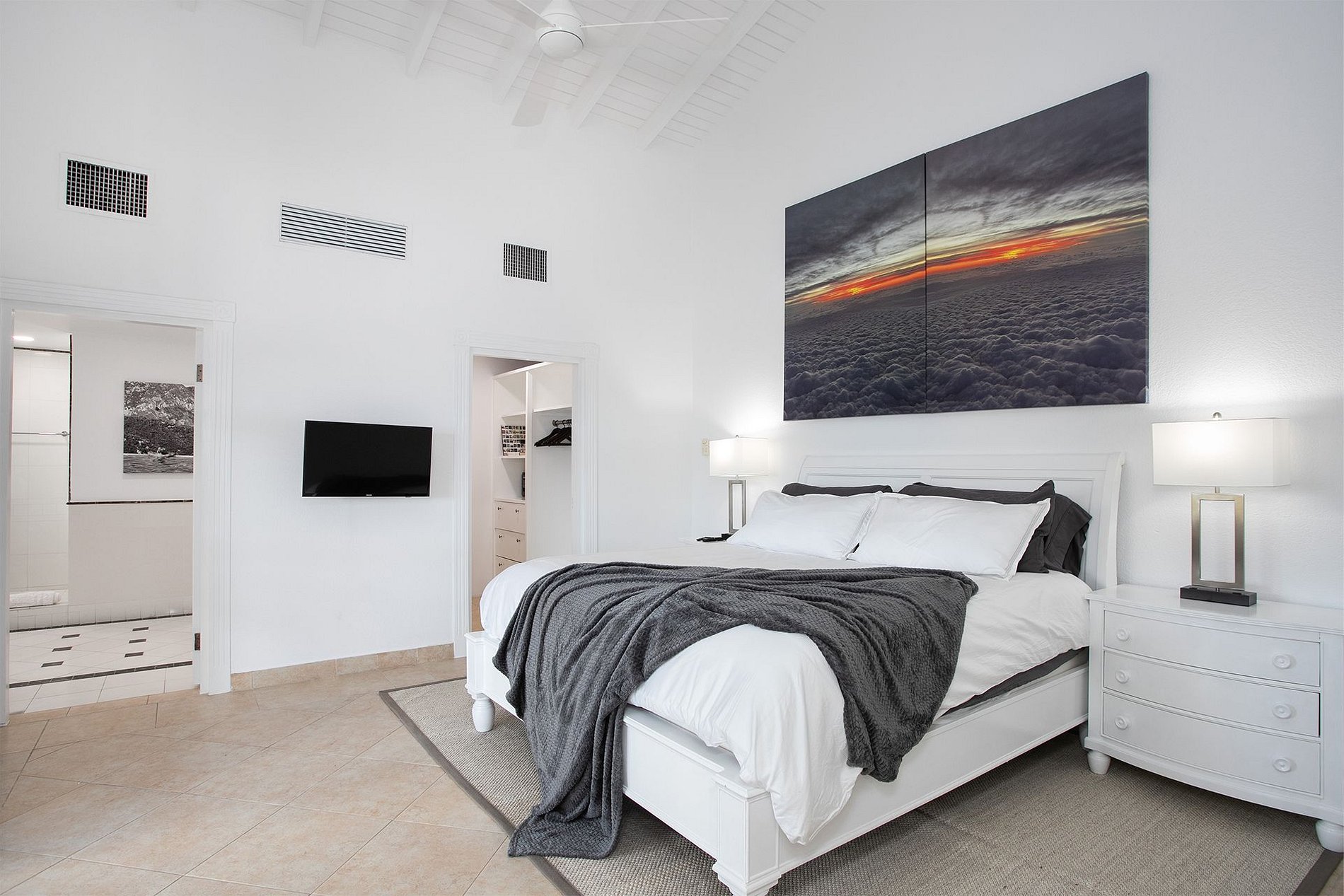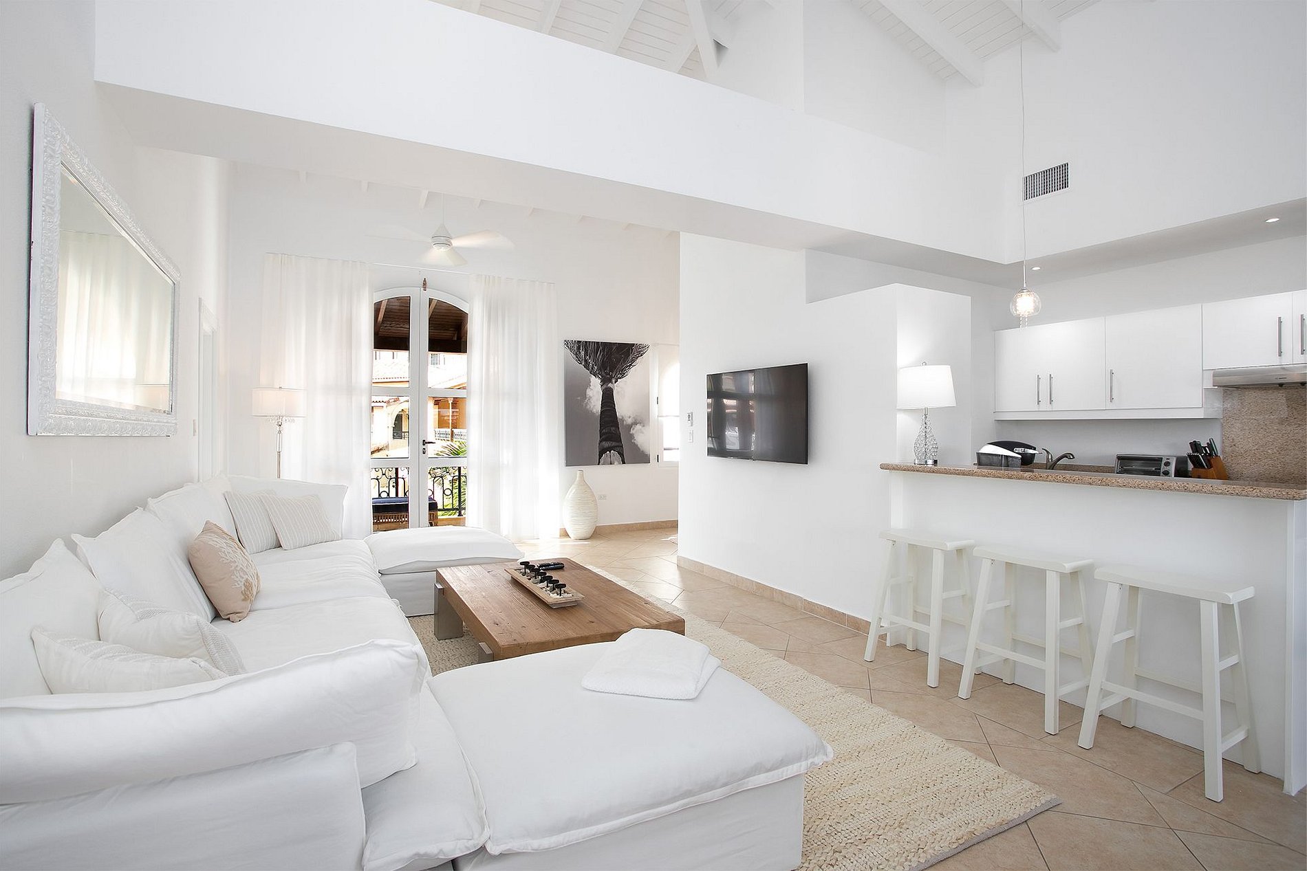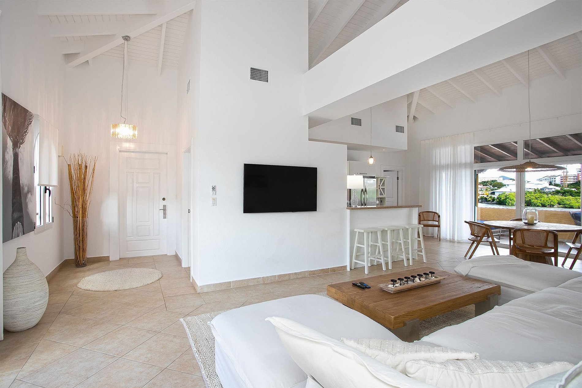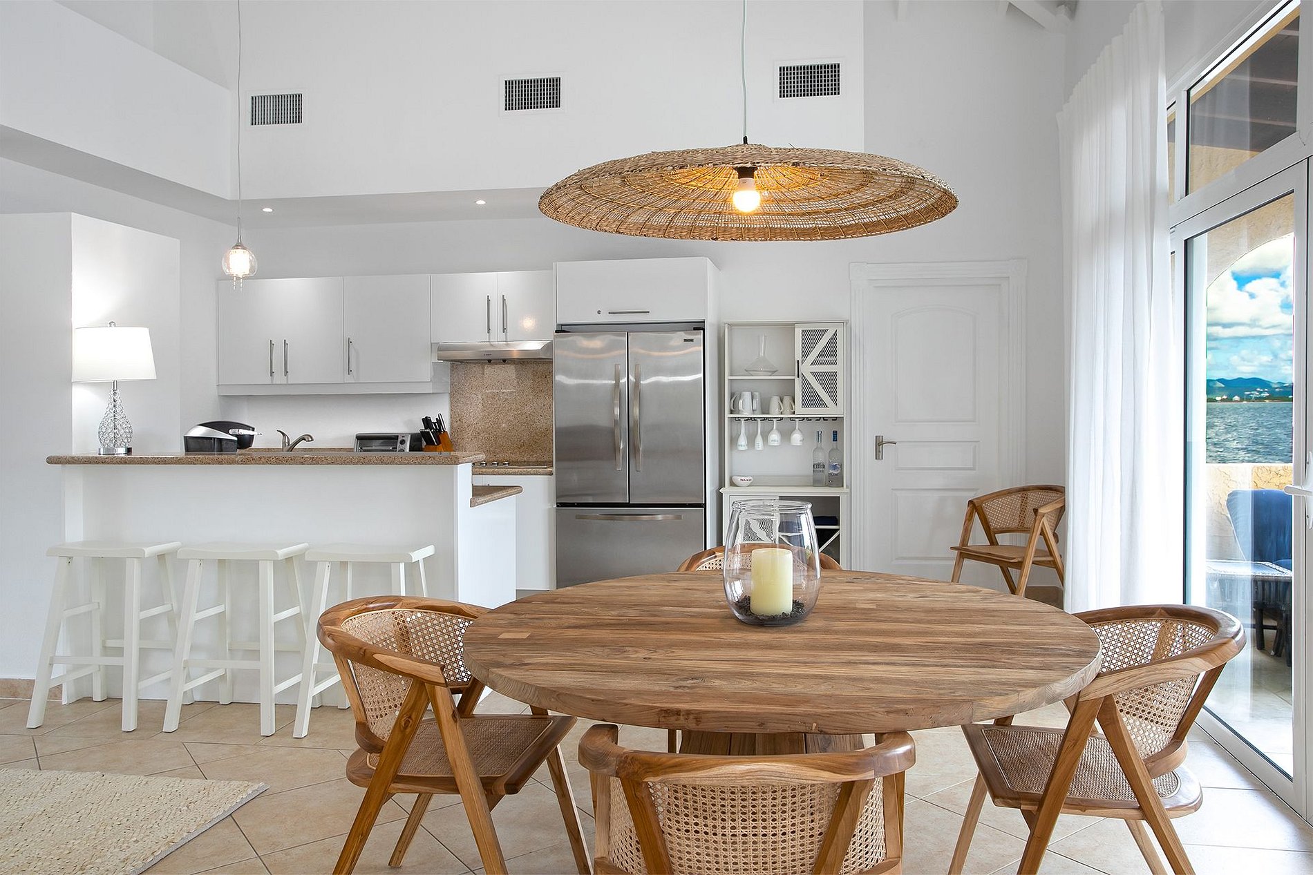 Les intérieurs comprennent un plafond cathédrale, une cuisine entièrement équipée avec des appareils Viking et un espace salon-salle à manger ouvert donnant sur la terrasse principale—parfait pour un café le matin ou un apéritif au coucher du soleil. Les deux chambres disposent de lits king-size, de dressings, de salles de bain en marbre avec double vasque et de Smart TV. Elles sont bien séparées, idéales pour deux couples ou une petite famille.