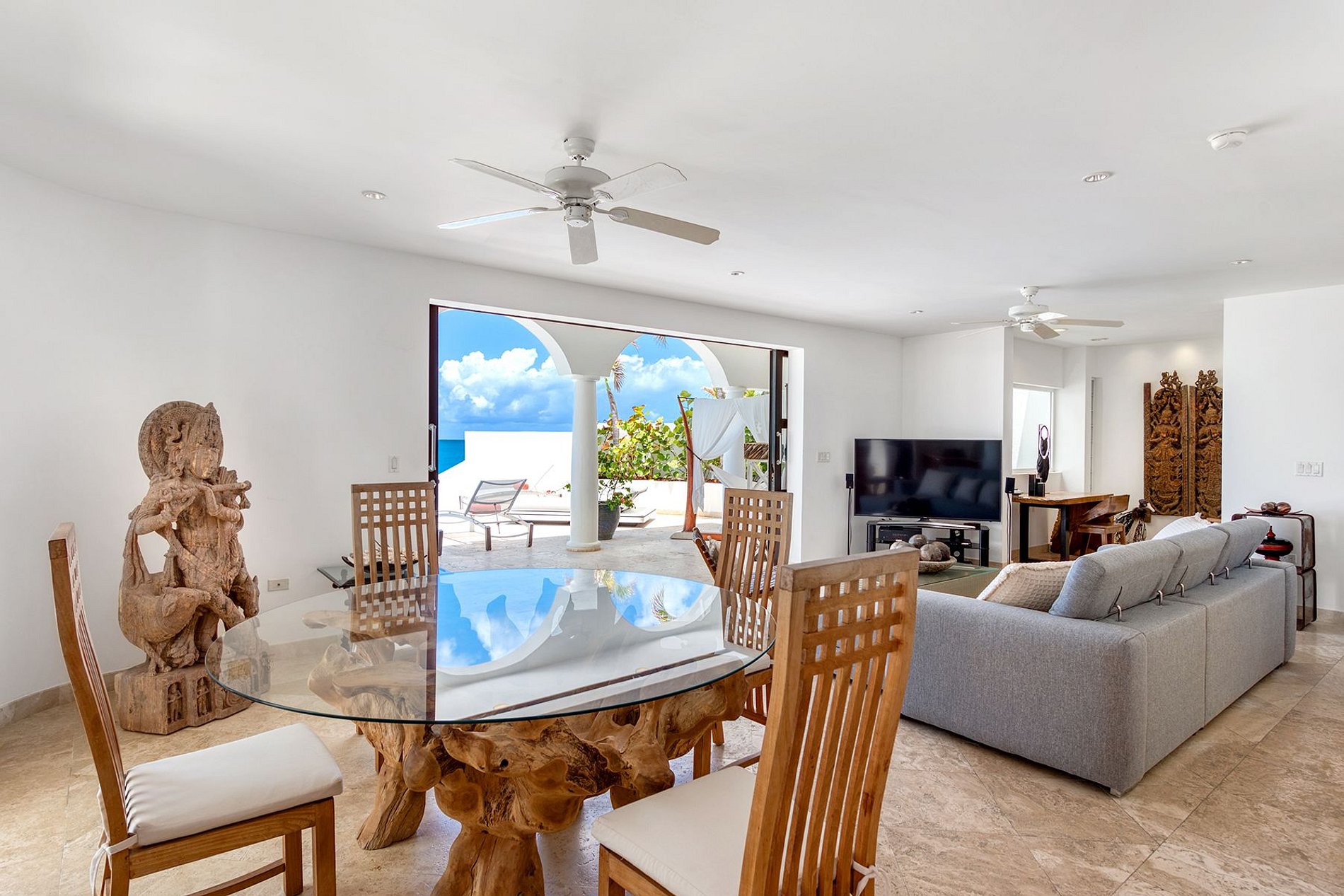 L’espace de vie intérieur se prolonge harmonieusement vers la terrasse couverte, la piscine à débordement et l’accès privé à la plage. Les intérieurs présentent des tons neutres et des textures naturelles, avec des accents asiatiques et africains. Le plan ouvert comprend une cuisine entièrement équipée avec des appareils haut de gamme, une salle à manger avec une table en verre et bois flotté, un salon multimédia et un coin détente extérieur avec hamac couvert.