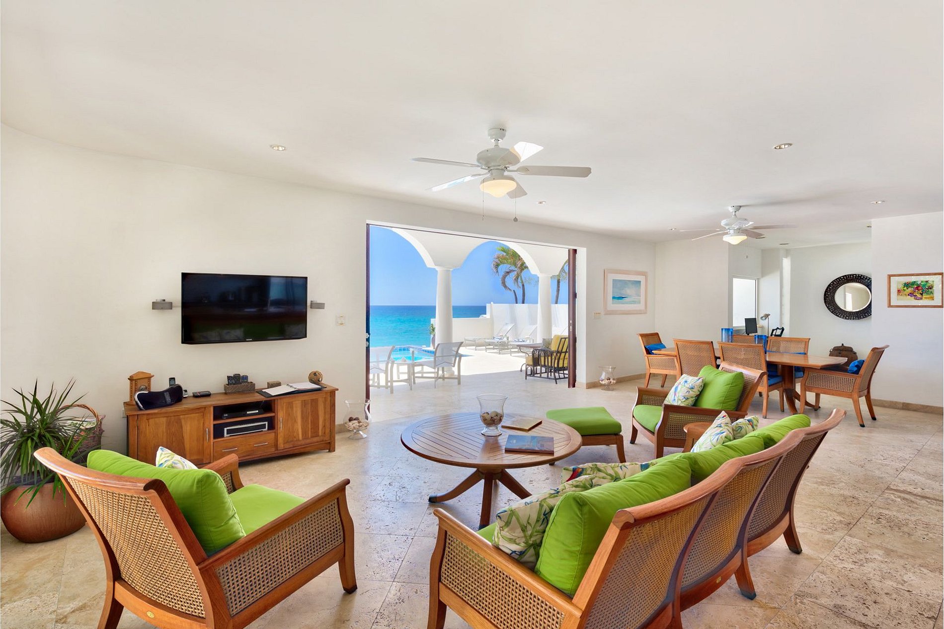 Le séjour principal s’ouvre sur une grande terrasse couverte, parfaite pour les repas en plein air ou pour se détendre face aux vagues. L’intérieur décloisonné comprend une cuisine entièrement équipée avec des appareils haut de gamme, une salle à manger intérieure et un salon confortable face à l’océan. La terrasse est idéale pour admirer les célèbres couchers de soleil de Cupecoy, souvent accompagnés du rare “flash vert”.