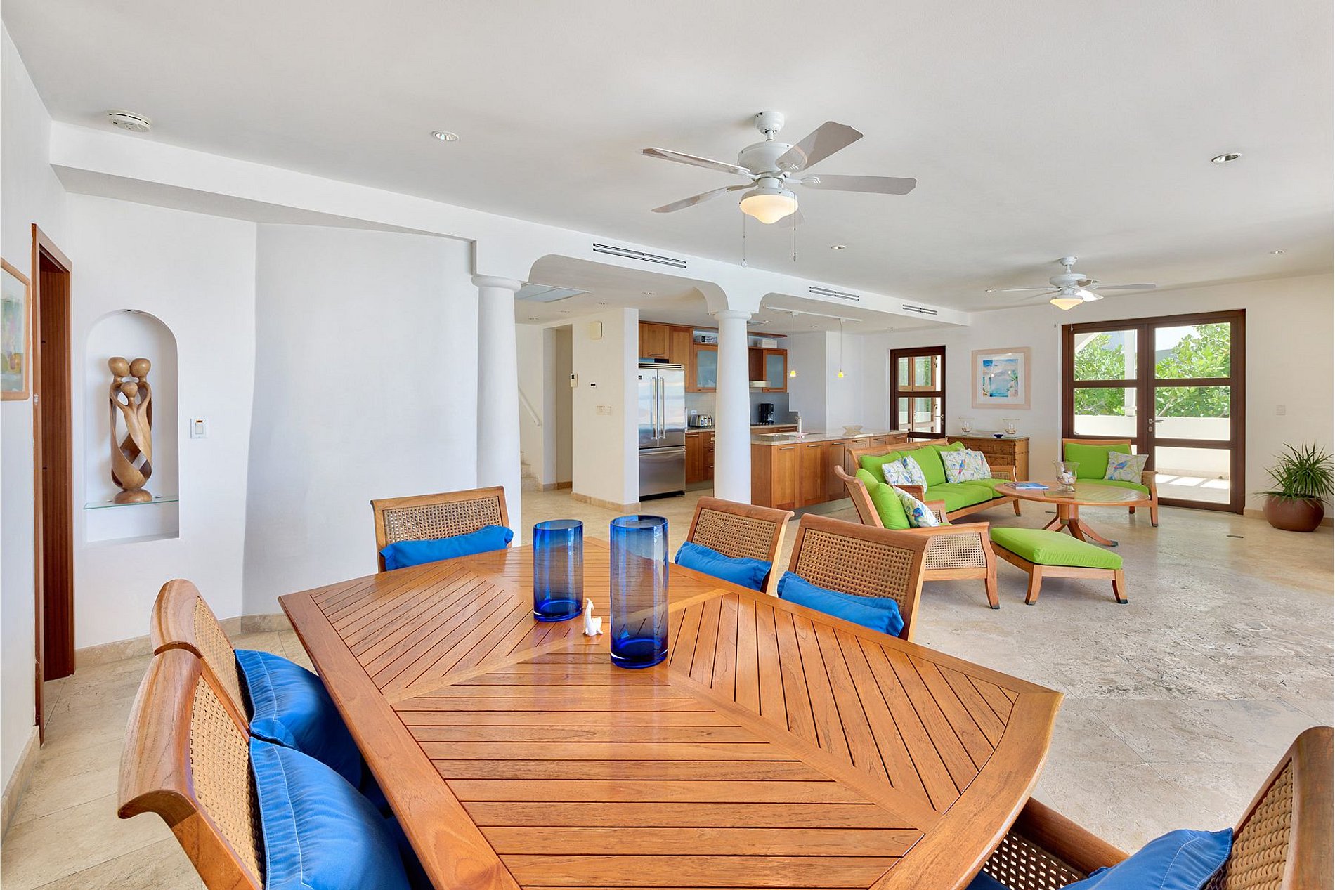 Le séjour principal s’ouvre sur une grande terrasse couverte, parfaite pour les repas en plein air ou pour se détendre face aux vagues. L’intérieur décloisonné comprend une cuisine entièrement équipée avec des appareils haut de gamme, une salle à manger intérieure et un salon confortable face à l’océan. La terrasse est idéale pour admirer les célèbres couchers de soleil de Cupecoy, souvent accompagnés du rare “flash vert”.