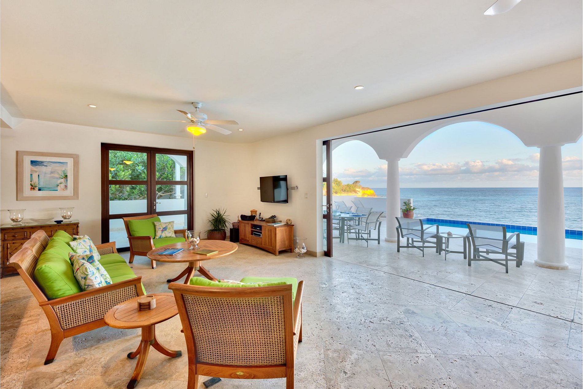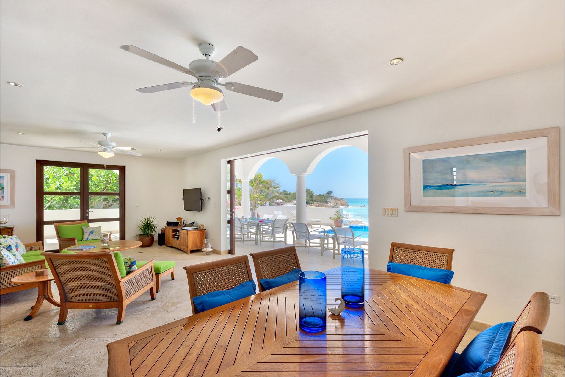 Le séjour principal s’ouvre sur une grande terrasse couverte, parfaite pour les repas en plein air ou pour se détendre face aux vagues. L’intérieur décloisonné comprend une cuisine entièrement équipée avec des appareils haut de gamme, une salle à manger intérieure et un salon confortable face à l’océan. La terrasse est idéale pour admirer les célèbres couchers de soleil de Cupecoy, souvent accompagnés du rare “flash vert”.