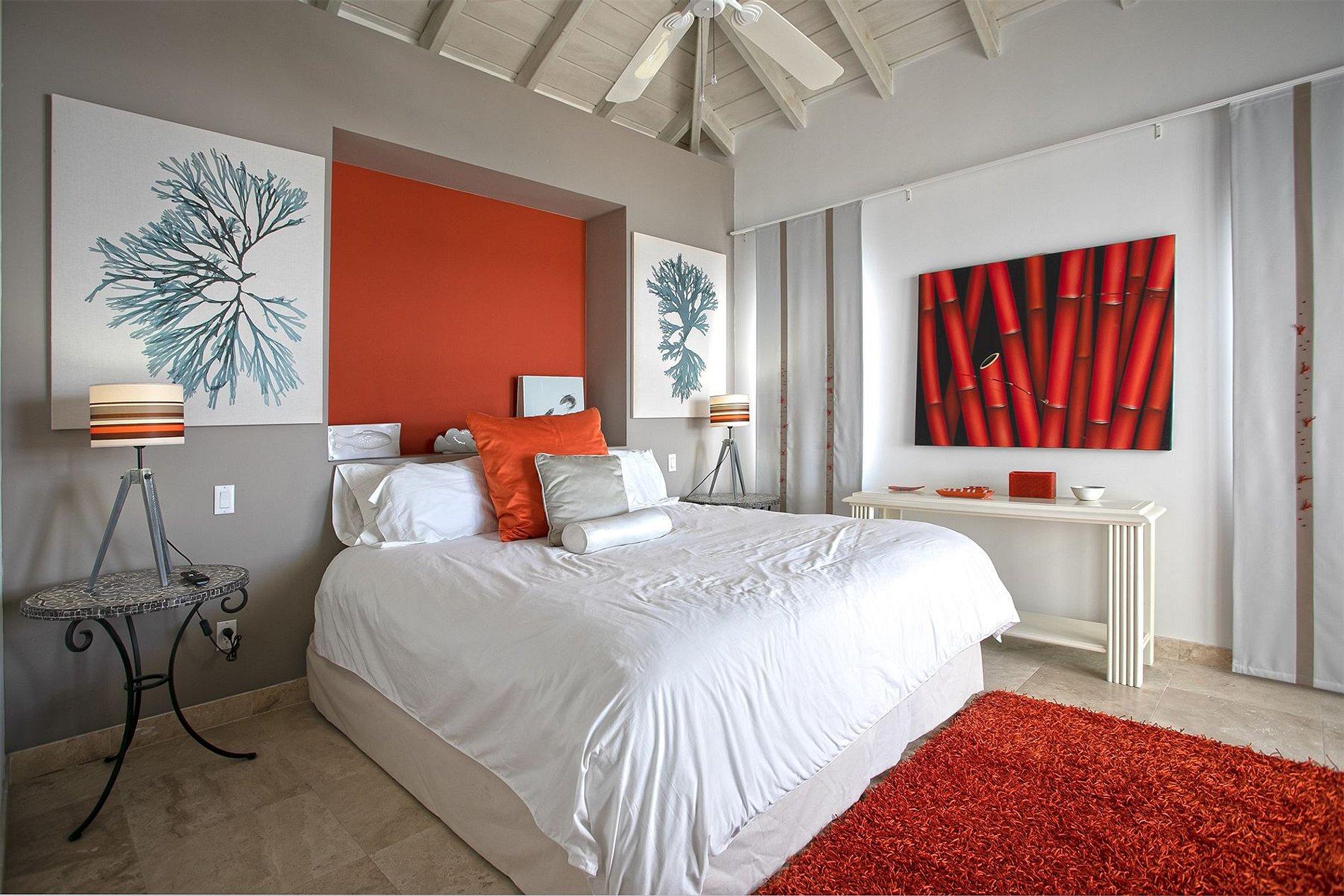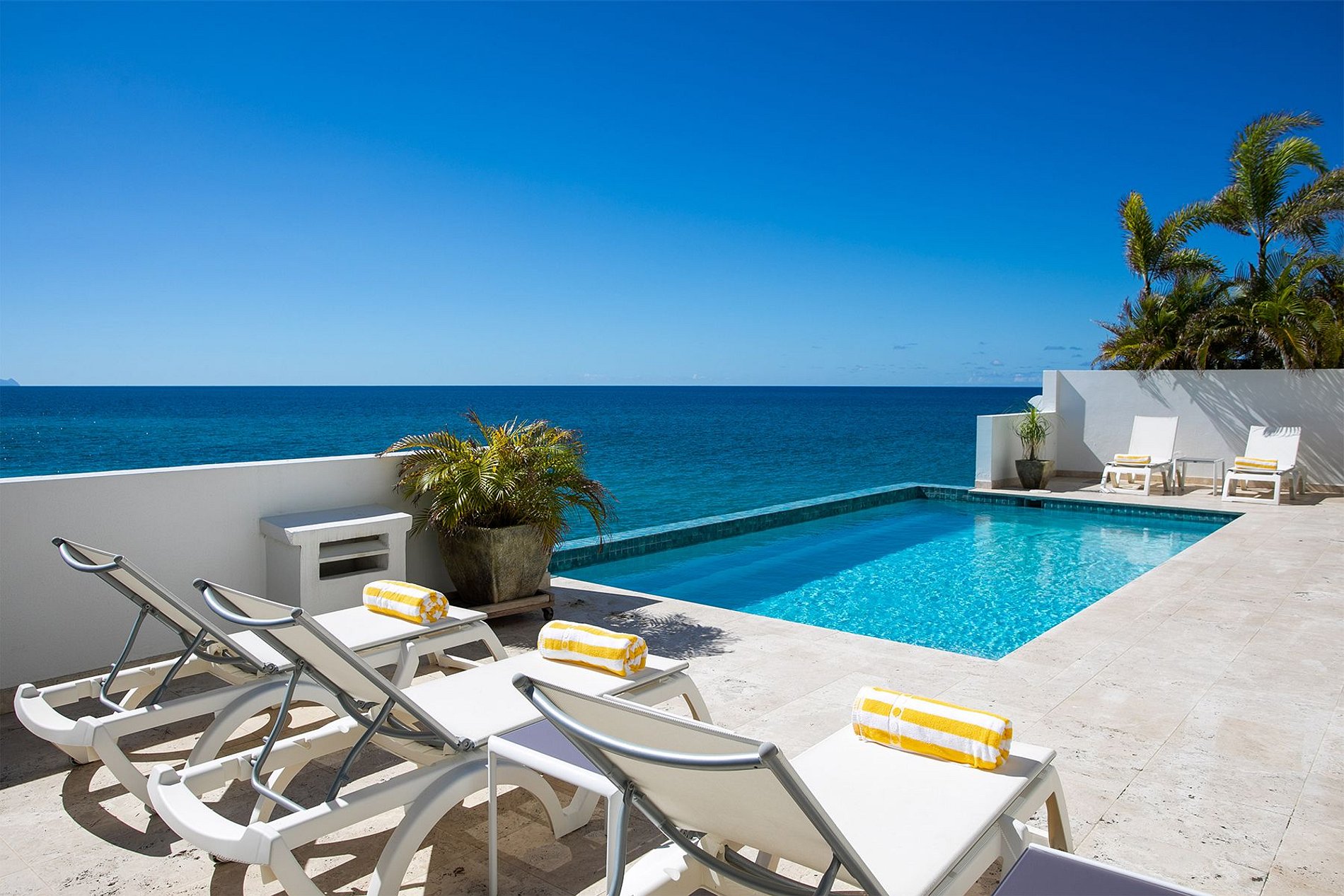 Une chambre se trouve au rez-de-chaussée, et les trois autres, dont la suite principale, sont à l’étage. Toutes disposent d’un lit king-size, d’une salle de bain privée et d’un accès aux terrasses extérieures. Les intérieurs, de style caribéen moderne, mêlent lignes épurées et tons doux pour une atmosphère chaleureuse et relaxante.