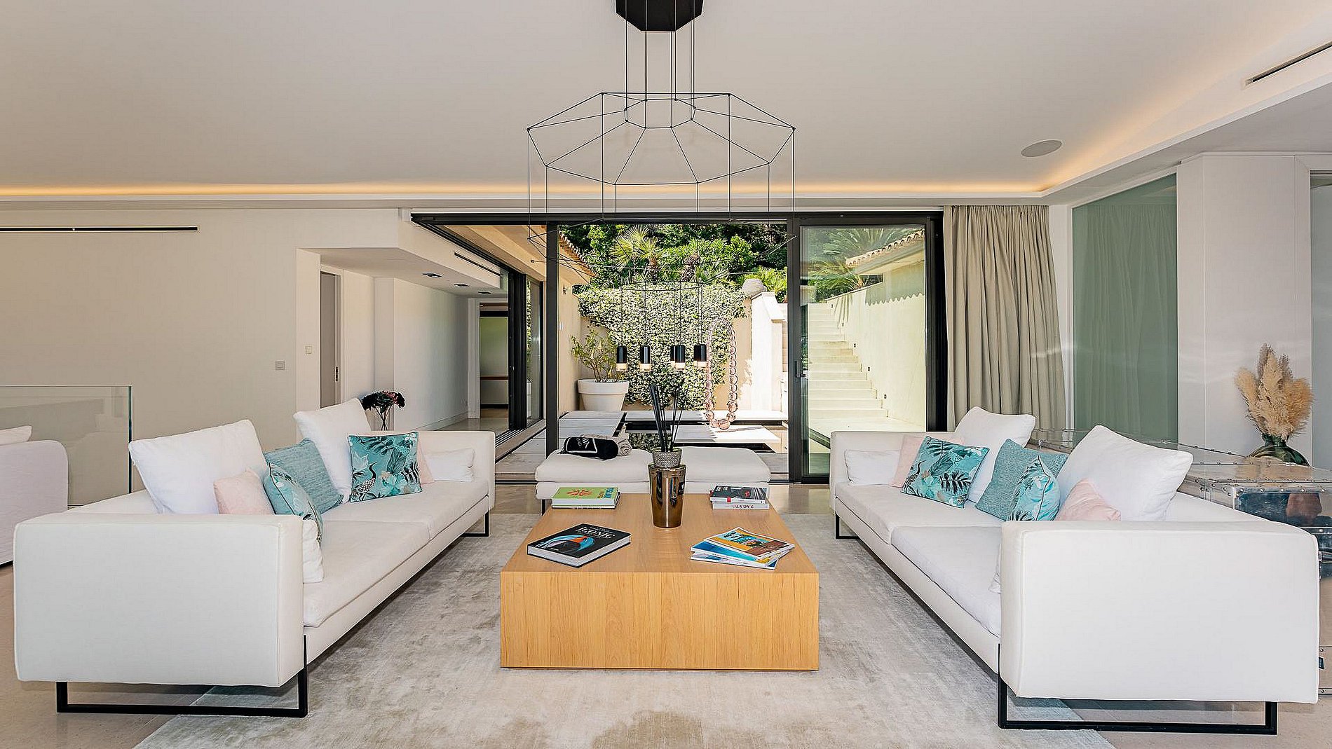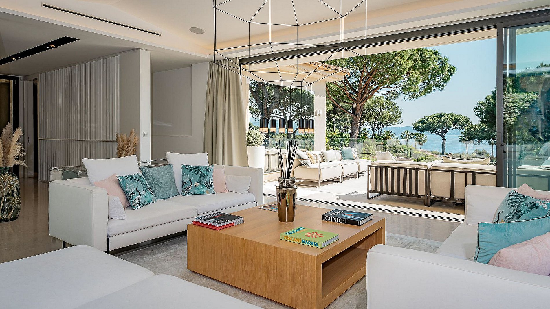 La villa s’ouvre sur une entrée principale accueillante menant à un vaste salon lumineux baigné de lumière naturelle grâce à ses grandes baies vitrées offrant une vue imprenable sur la baie de Pampelonne et la piscine extérieure. Une cuisine professionnelle entièrement équipée, réalisée avec des matériaux haut de gamme, complète harmonieusement cet espace de vie.