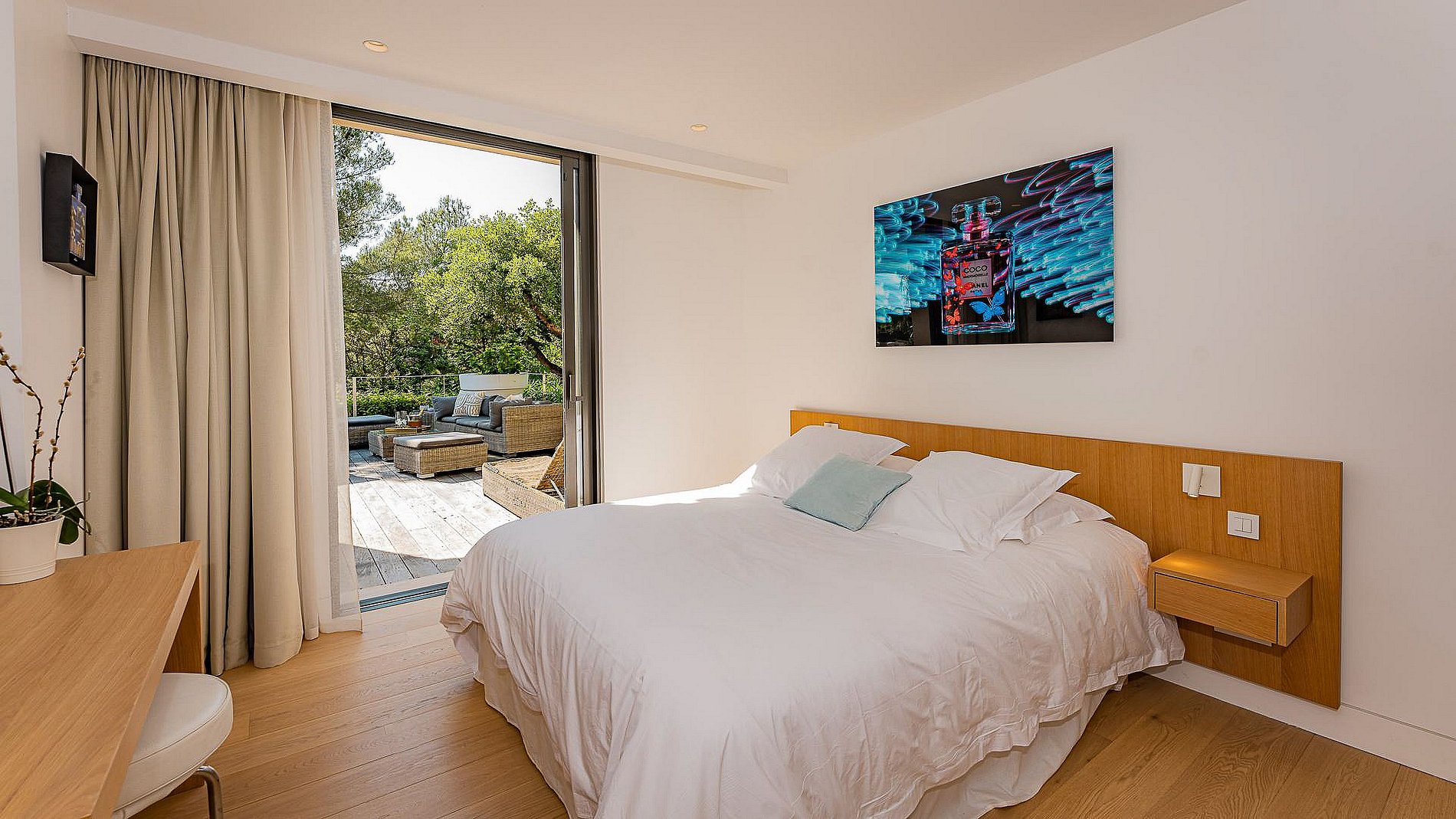 - Chambre n°2 (Master) : lit double (200cm), salle de bain/douche, WC, dressing spacieux, terrasse avec vue piscine et mer.