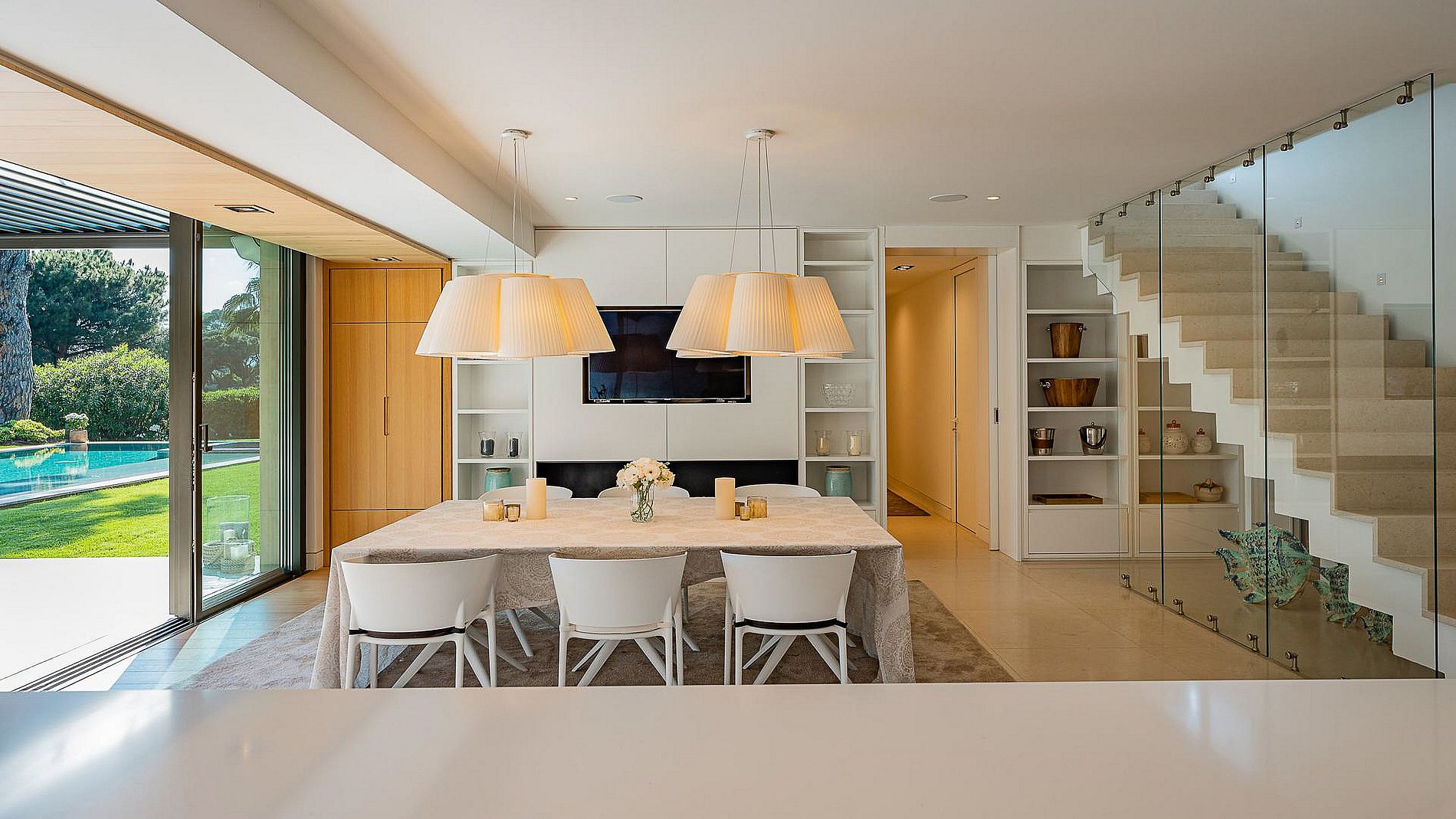 La villa s’ouvre sur une entrée principale accueillante menant à un vaste salon lumineux baigné de lumière naturelle grâce à ses grandes baies vitrées offrant une vue imprenable sur la baie de Pampelonne et la piscine extérieure. Une cuisine professionnelle entièrement équipée, réalisée avec des matériaux haut de gamme, complète harmonieusement cet espace de vie.