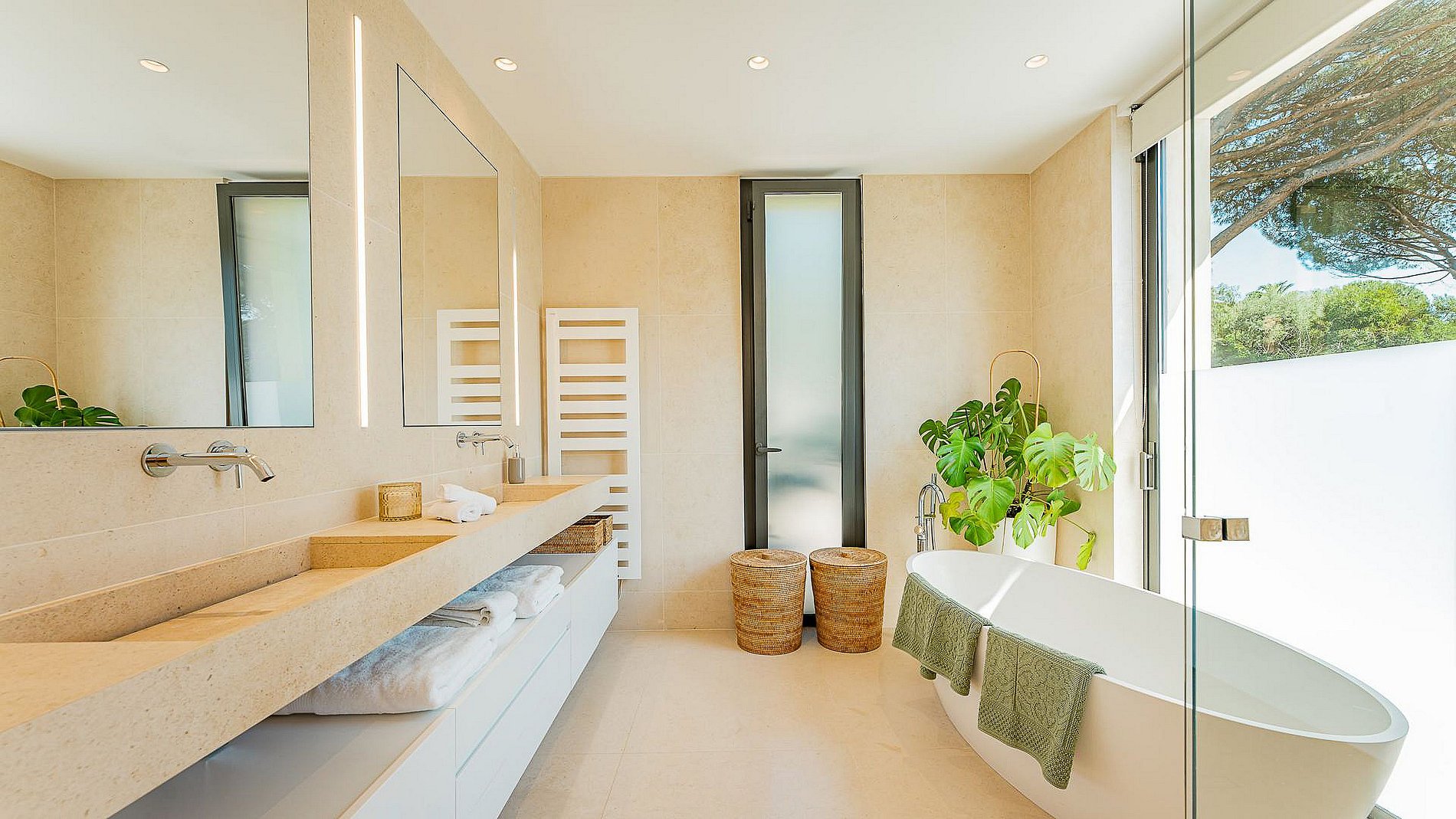 - Chambre n°2 (Master) : lit double (200cm), salle de bain/douche, WC, dressing spacieux, terrasse avec vue piscine et mer.