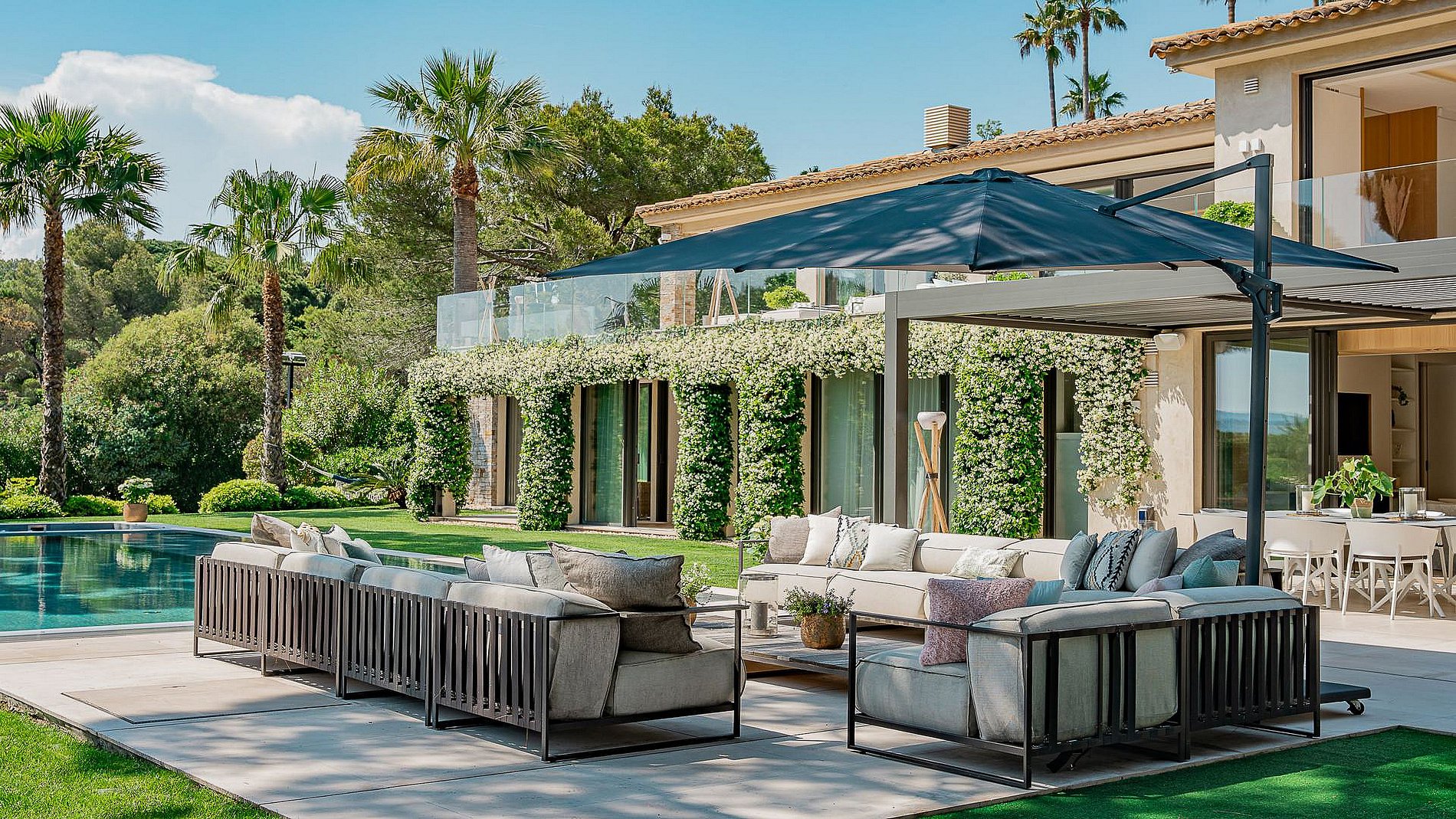 Profitez pleinement de l'extérieur grâce à une superbe piscine face à la baie de Pampelonne, accompagnée d’un pool house équipé avec kitchenette, WC et douches extérieures. Vous disposerez également d’un barbecue professionnel Big Green Egg, d’un élégant salon d’été, de bains de soleil et de spacieuses terrasses pour des moments de détente privilégiés.