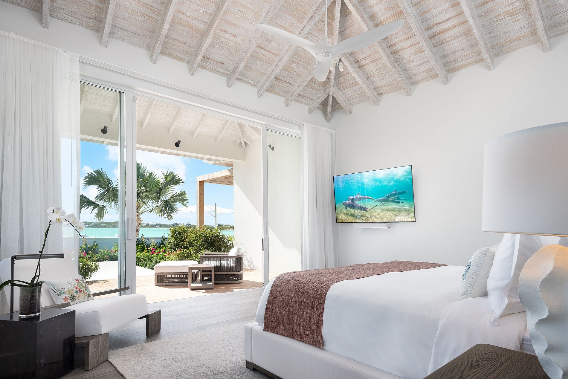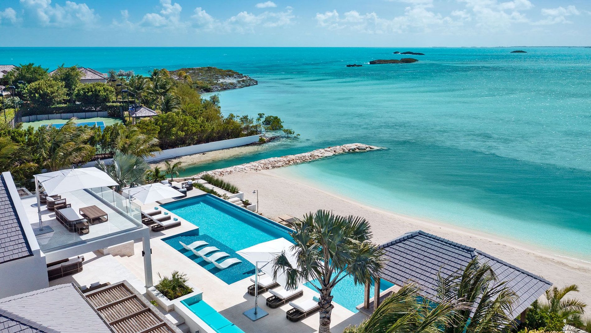 Les intérieurs sont épurés et minimalistes, mêlant bois naturel et pierre dans une parfaite harmonie. Parmi les équipements figurent une salle à manger intérieure/extérieure sous auvent, un vaste salon, une salle de sport privée et une piscine chauffée. Les huit chambres disposent toutes d’une salle de bain privée avec douche intérieure et extérieure, et offrent une combinaison de lits king-size et lits simples répartis entre la maison principale et les pavillons. La villa comprend également une plage privée, un service complet avec majordome et chef, les transferts aéroport aller-retour, ainsi que des sports nautiques non motorisés pour une escapade insulaire inoubliable.