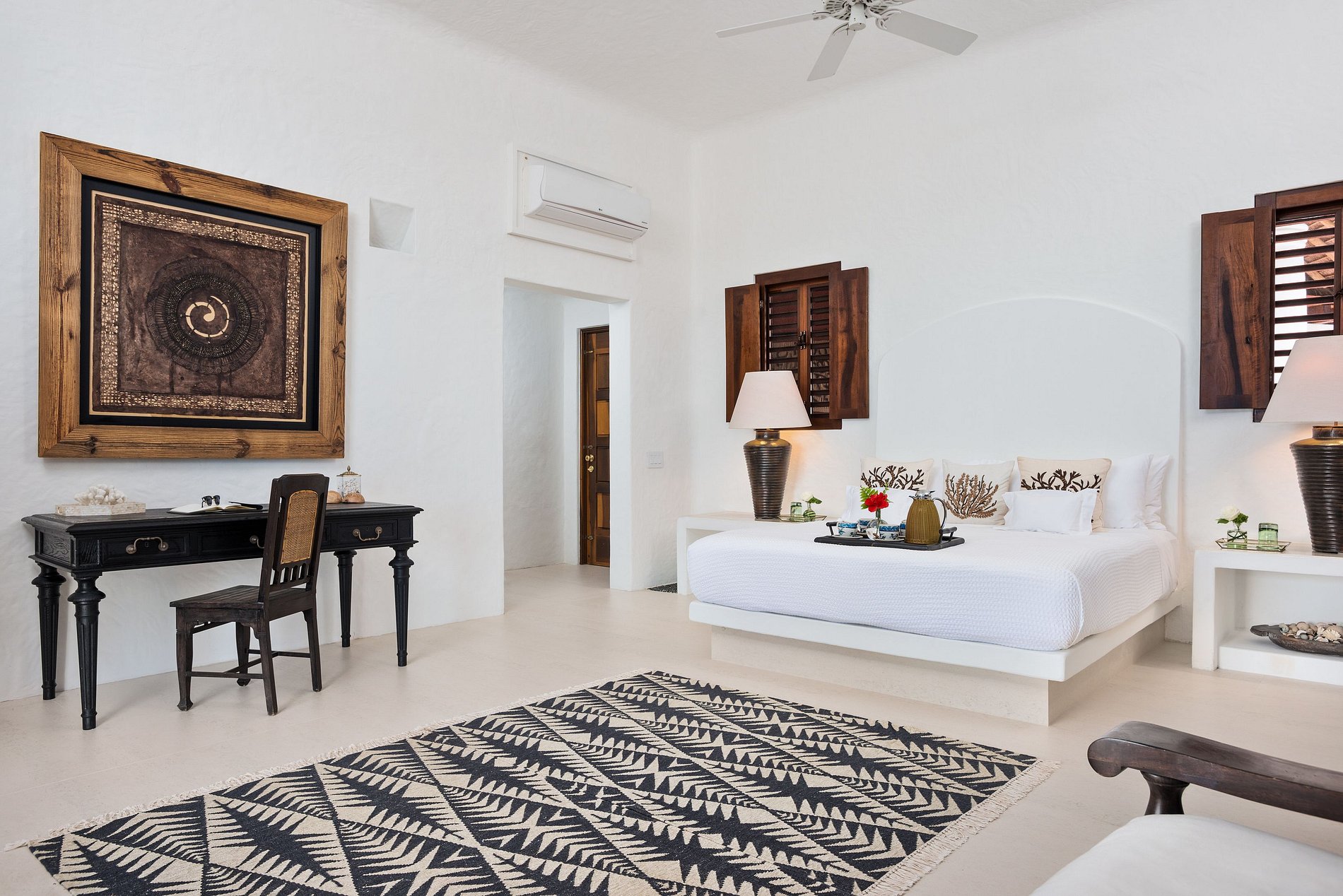 Des matériaux naturels comme la pierre, le bois et le chaume se fondent harmonieusement dans l’environnement. L’agencement privilégie la vie en plein air avec de grandes terrasses, une piscine à débordement impressionnante et des espaces repas et salon face à la mer. Chaque chambre dispose d’une salle de bain privative et d’une terrasse avec vue sur l’océan. Parmi les points forts : une salle de cinéma, une salle de sport, un jacuzzi et un bureau, pour un séjour privé, confortable et haut de gamme sur l’île.