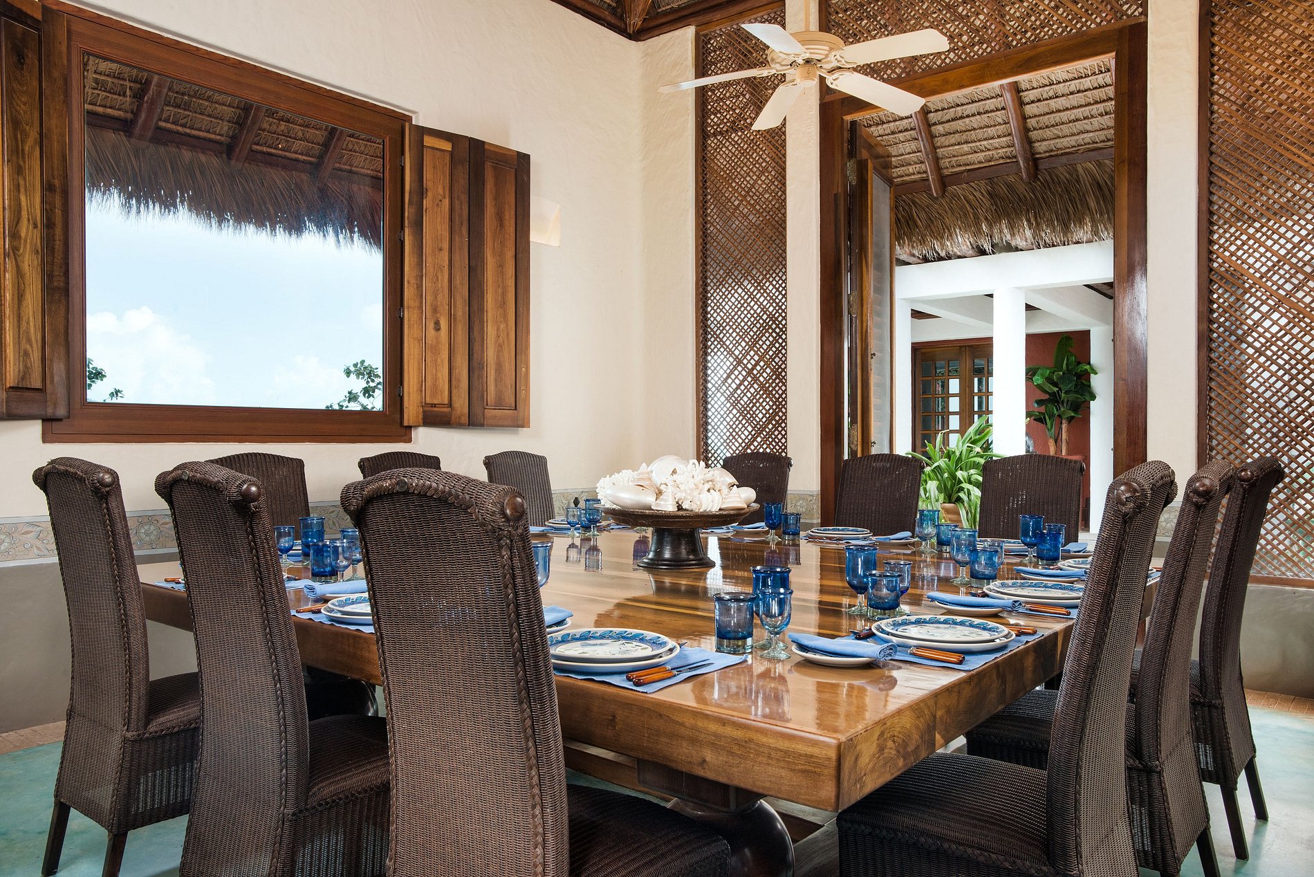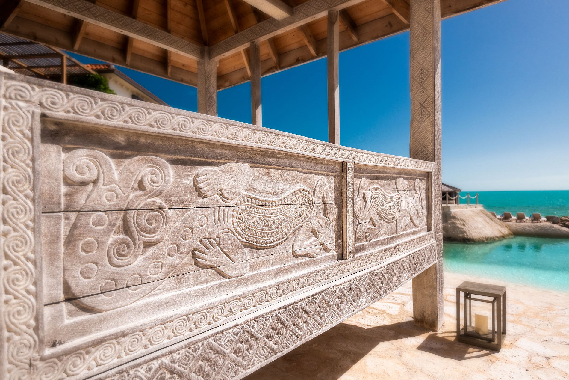 Des matériaux naturels comme la pierre, le bois et le chaume se fondent harmonieusement dans l’environnement. L’agencement privilégie la vie en plein air avec de grandes terrasses, une piscine à débordement impressionnante et des espaces repas et salon face à la mer. Chaque chambre dispose d’une salle de bain privative et d’une terrasse avec vue sur l’océan. Parmi les points forts : une salle de cinéma, une salle de sport, un jacuzzi et un bureau, pour un séjour privé, confortable et haut de gamme sur l’île.