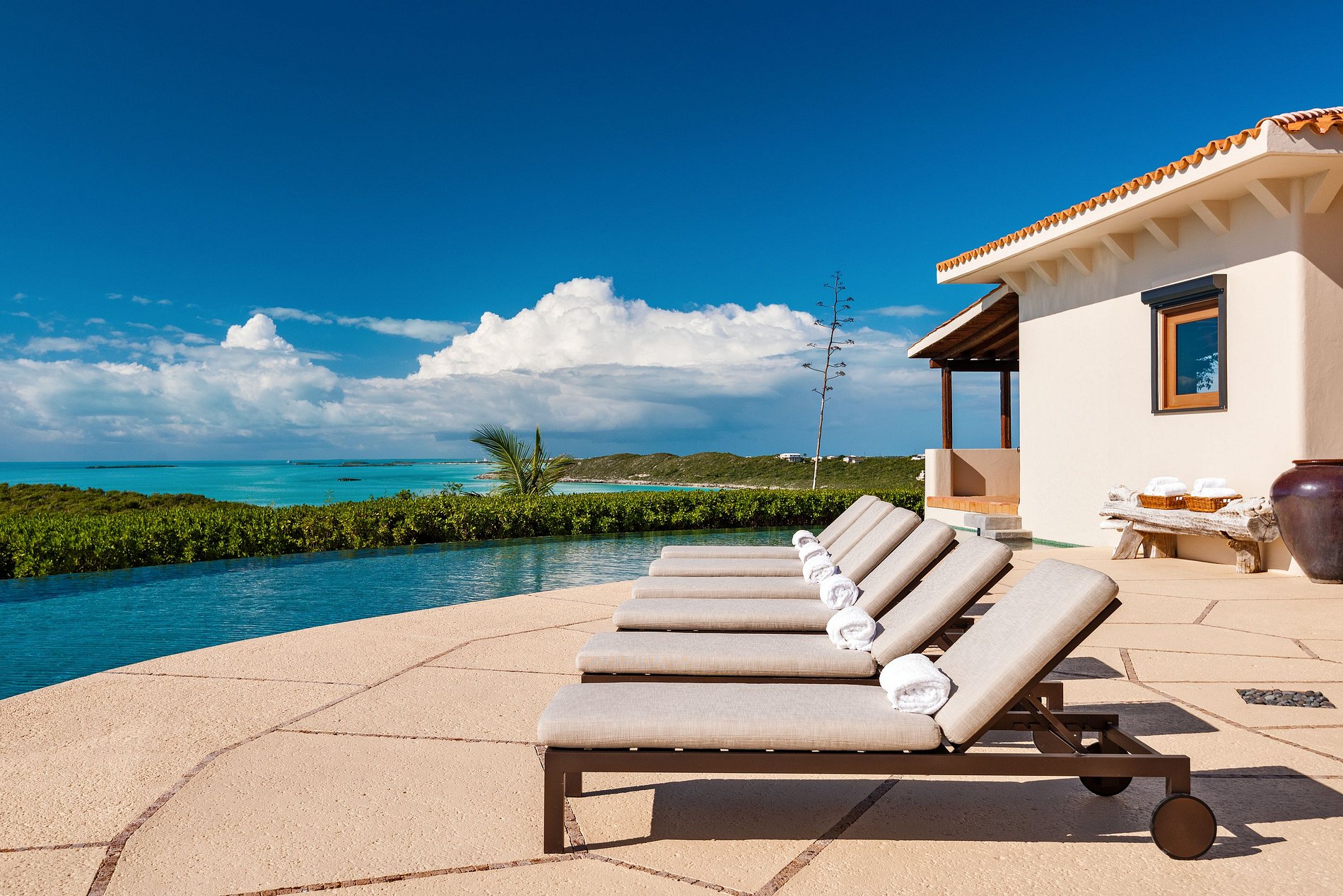 Des matériaux naturels comme la pierre, le bois et le chaume se fondent harmonieusement dans l’environnement. L’agencement privilégie la vie en plein air avec de grandes terrasses, une piscine à débordement impressionnante et des espaces repas et salon face à la mer. Chaque chambre dispose d’une salle de bain privative et d’une terrasse avec vue sur l’océan. Parmi les points forts : une salle de cinéma, une salle de sport, un jacuzzi et un bureau, pour un séjour privé, confortable et haut de gamme sur l’île.
