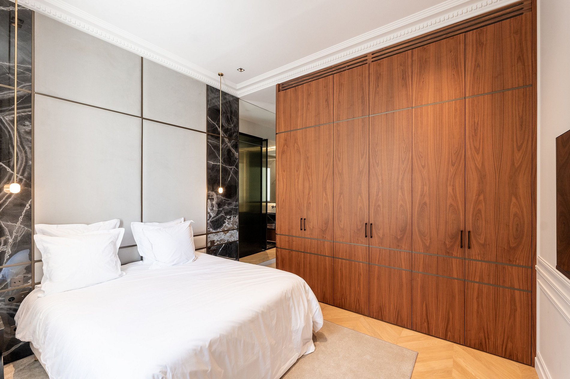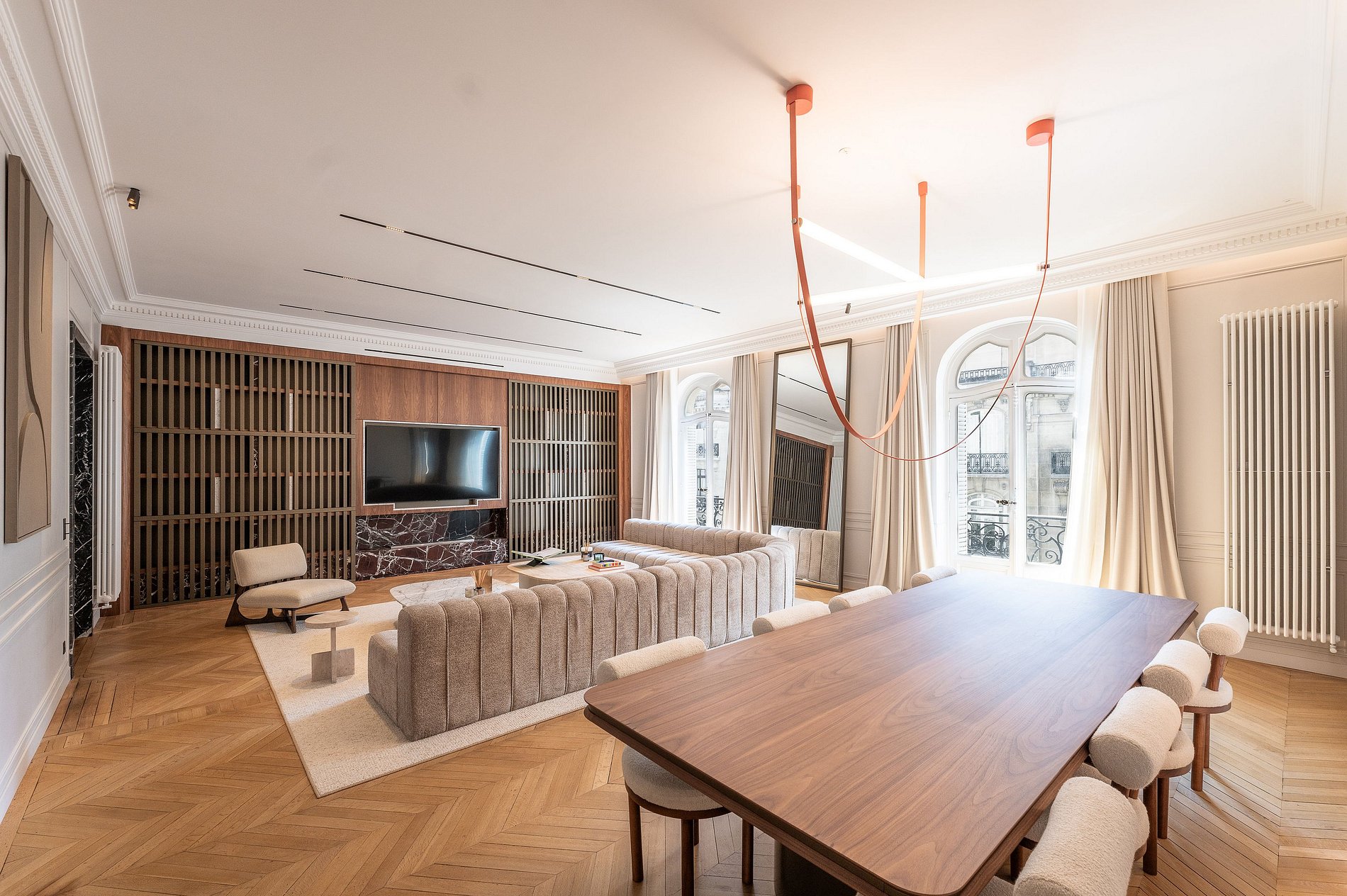Installé dans un immeuble bourgeois Haussmannien aux prestations raffinées, cet appartement se distingue par un remarquable travail architectural, comme en témoigne son couloir au plafond spectaculaire, conçu en forme de vague en miroir, une véritable prouesse esthétique.