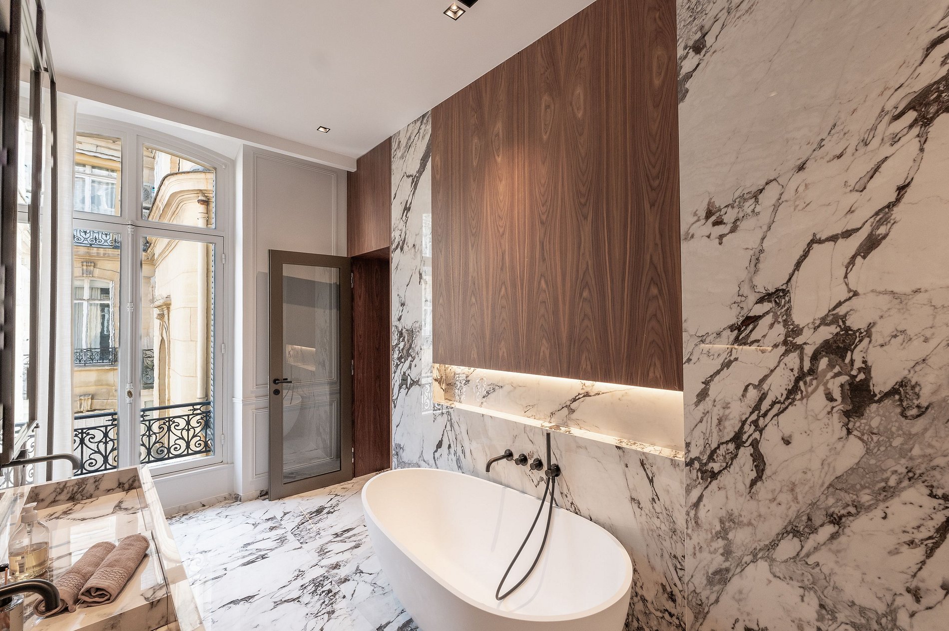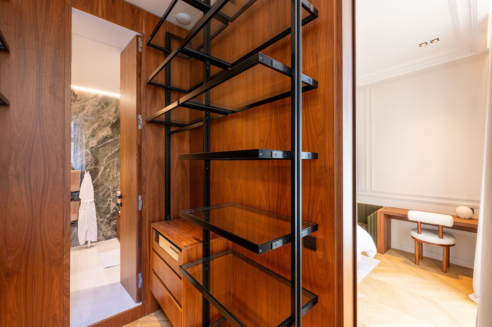 Installé dans un immeuble bourgeois Haussmannien aux prestations raffinées, cet appartement se distingue par un remarquable travail architectural, comme en témoigne son couloir au plafond spectaculaire, conçu en forme de vague en miroir, une véritable prouesse esthétique.