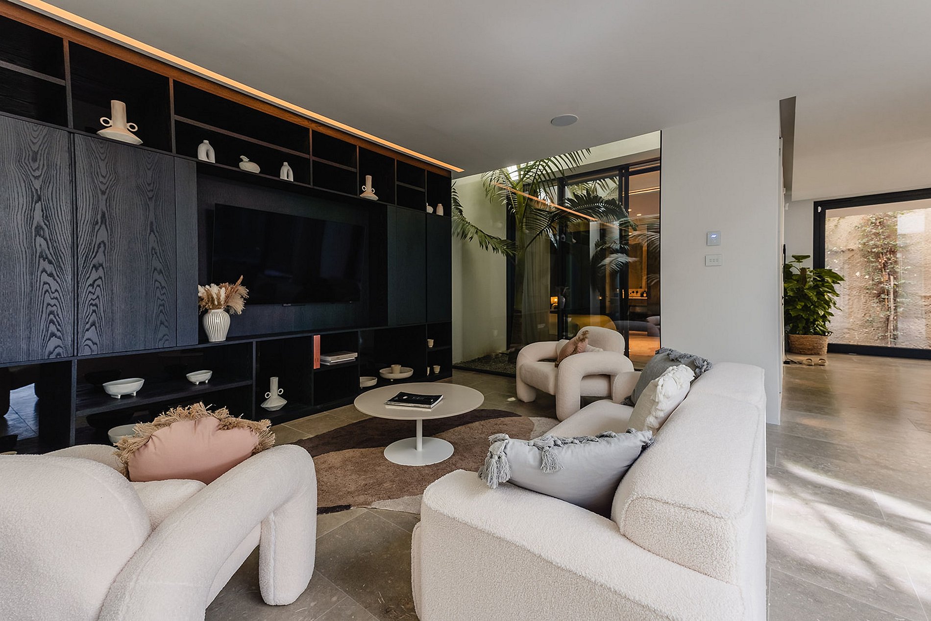 Les espaces à vivre sont pensés pour recevoir avec style ou se détendre en toute sérénité. Le salon design s’ouvre sur une vaste terrasse avec coin repas, idéale pour les déjeuners face à la mer ou les cocktails au coucher du soleil.