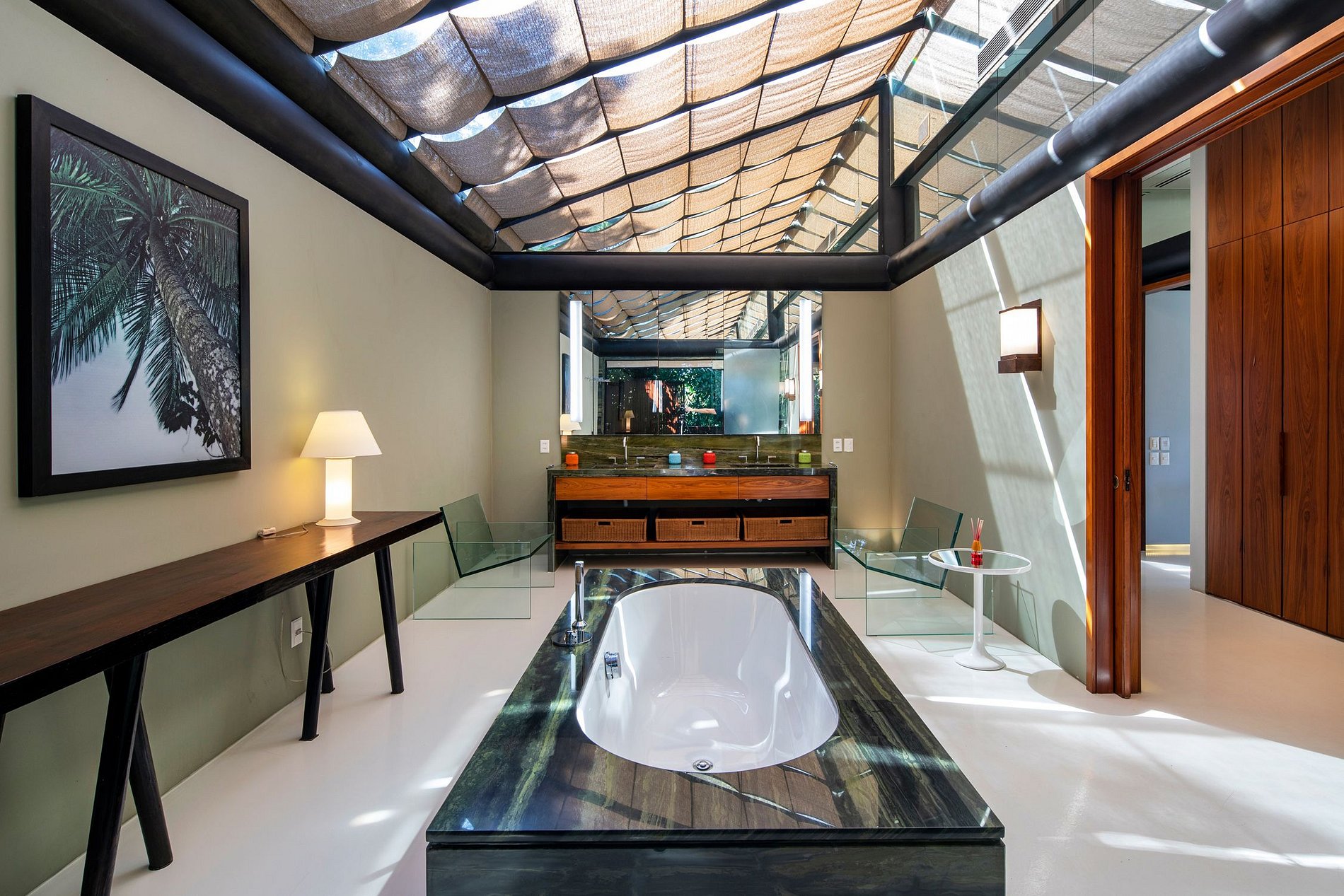 Le salon a un beau design, la villa ayant à la fois ce salon intérieur, ainsi qu'un très grand espace de vie extérieur couvert, qui donne l'impression que la vie en plein air de Rio et des tropiques est entrée dans votre villa. La villa entière se concentre sur l'espace extérieur - avec une magnifique et grande terrasse encadrant la belle piscine à débordement, finie avec le carrelage noir et blanc astucieux - un clin d'œil à la célèbre promenade de Copacabana.