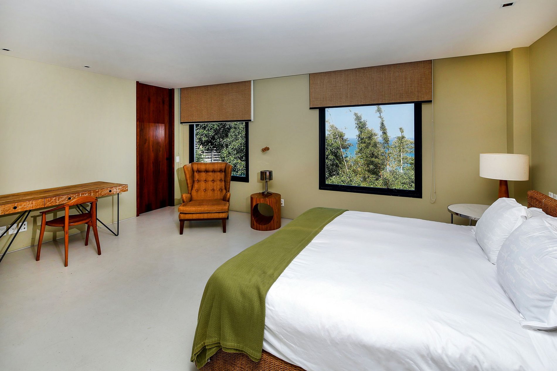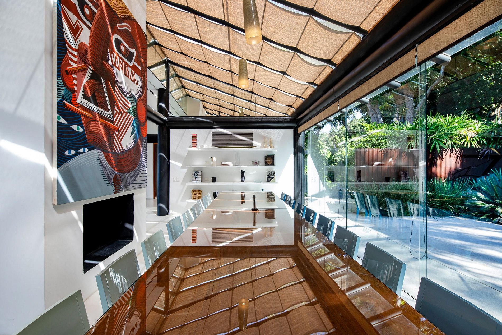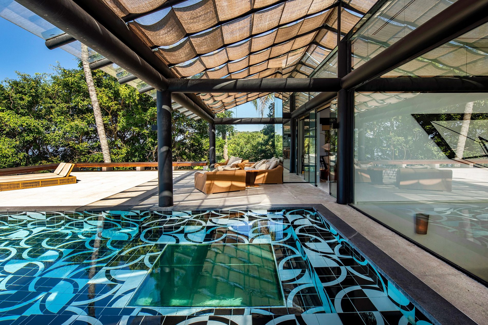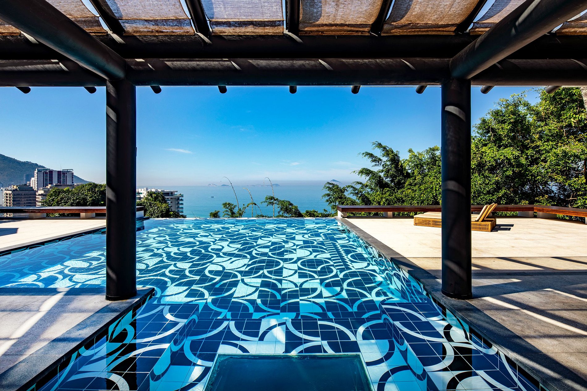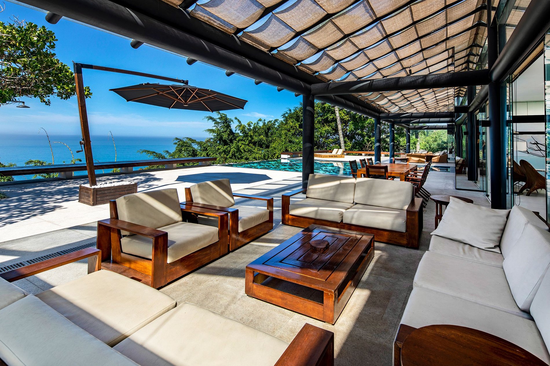 Le salon a un beau design, la villa ayant à la fois ce salon intérieur, ainsi qu'un très grand espace de vie extérieur couvert, qui donne l'impression que la vie en plein air de Rio et des tropiques est entrée dans votre villa. La villa entière se concentre sur l'espace extérieur - avec une magnifique et grande terrasse encadrant la belle piscine à débordement, finie avec le carrelage noir et blanc astucieux - un clin d'œil à la célèbre promenade de Copacabana.
