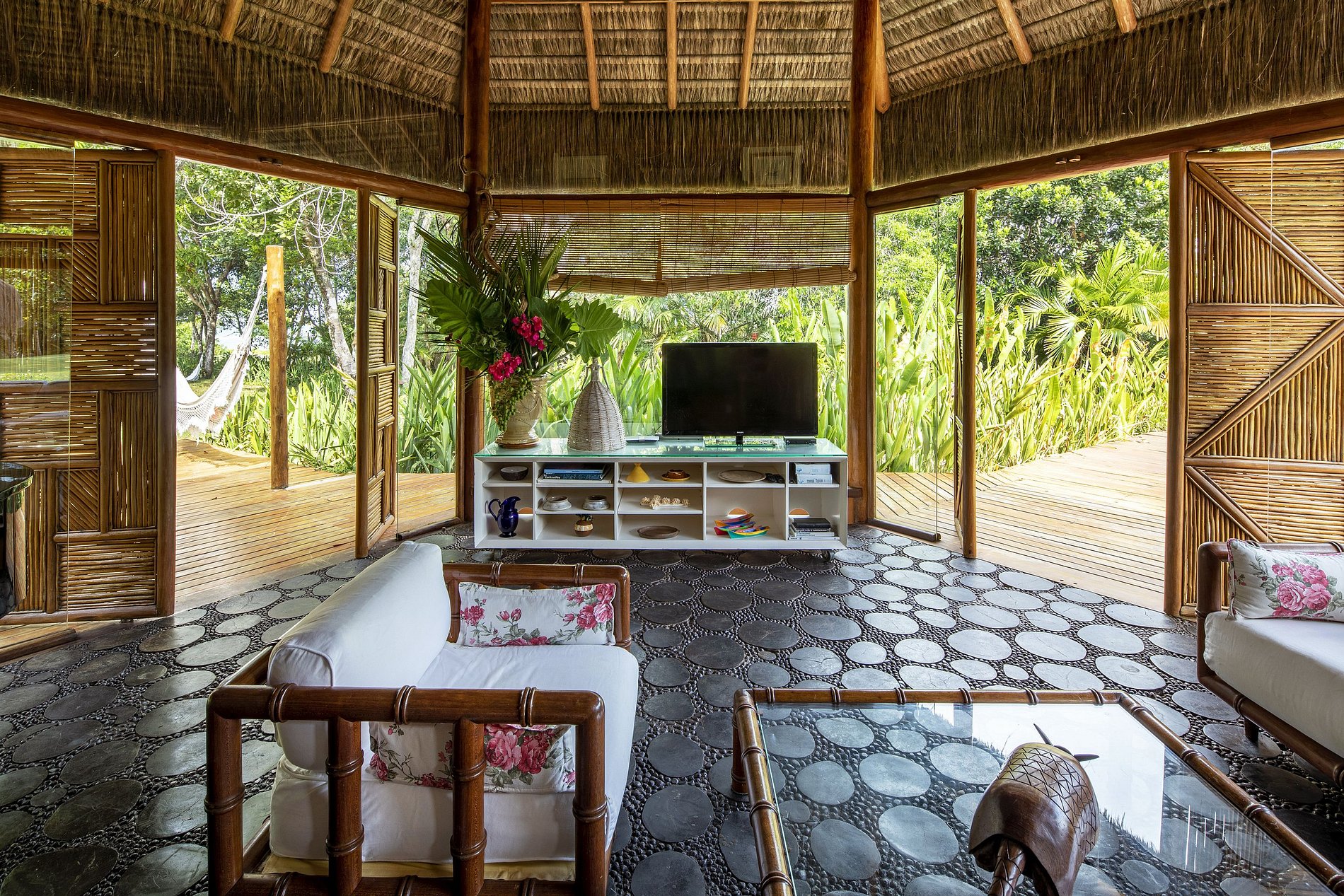 Le bar-salon dans le toit de palme tressée est l'endroit idéal pour profiter d'une caipirinha sur commande tout en ayant des conversations avec vos invités. Le personnel bien formé, compris dans le prix de la location, saura satisfaire tous vos désirs. La propriété dispose également d'une immense salle de 200m2 avec un mobilier confortable et un équipement moderne.