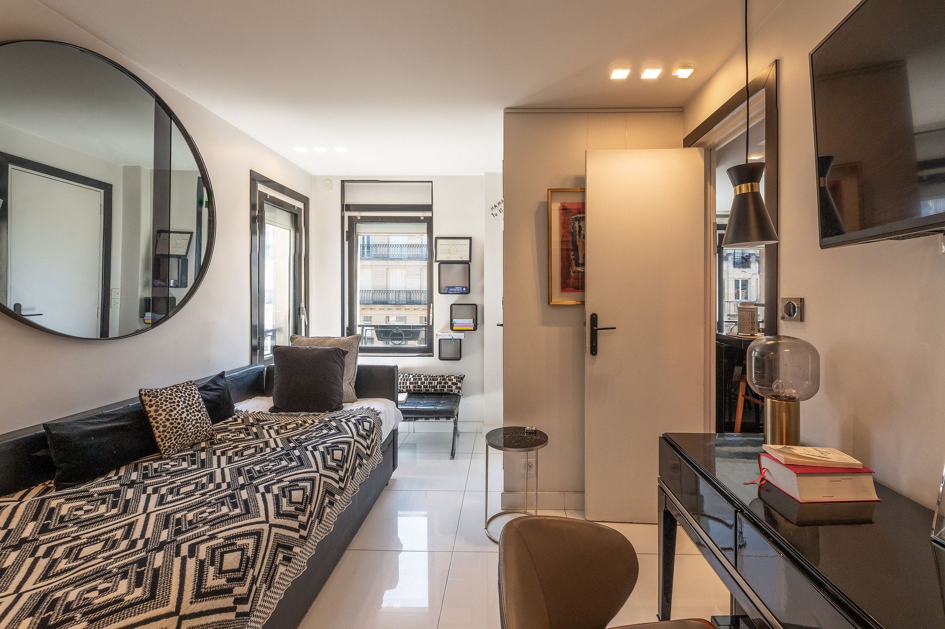 À l’étage supérieur, une cinquième chambre modulable avec canapé-lit double donne accès à une immense terrasse panoramique, un véritable havre de paix en plein cœur de Paris.