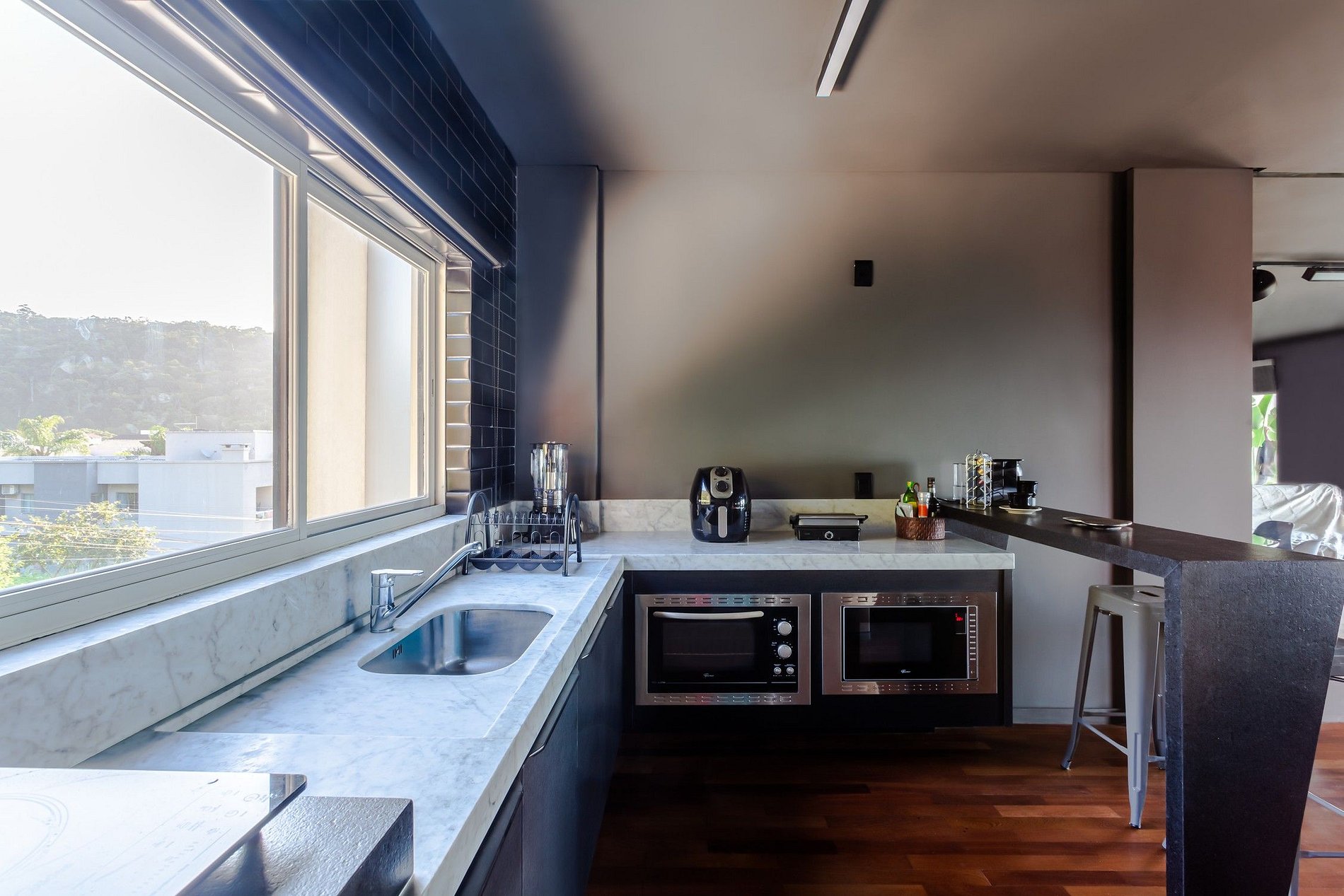 La cuisine a un design minimaliste et l'espace a été optimisé avec des emplacements prédéfinis pour le congélateur, la cuisinière, le four et le lave-vaisselle, bien équipée avec tous les éléments essentiels pour la préparation d'excellents repas. À côté de la cuisine se trouve la zone de service contenant une machine à laver, un sèche-linge, un fer à repasser et d'autres articles.