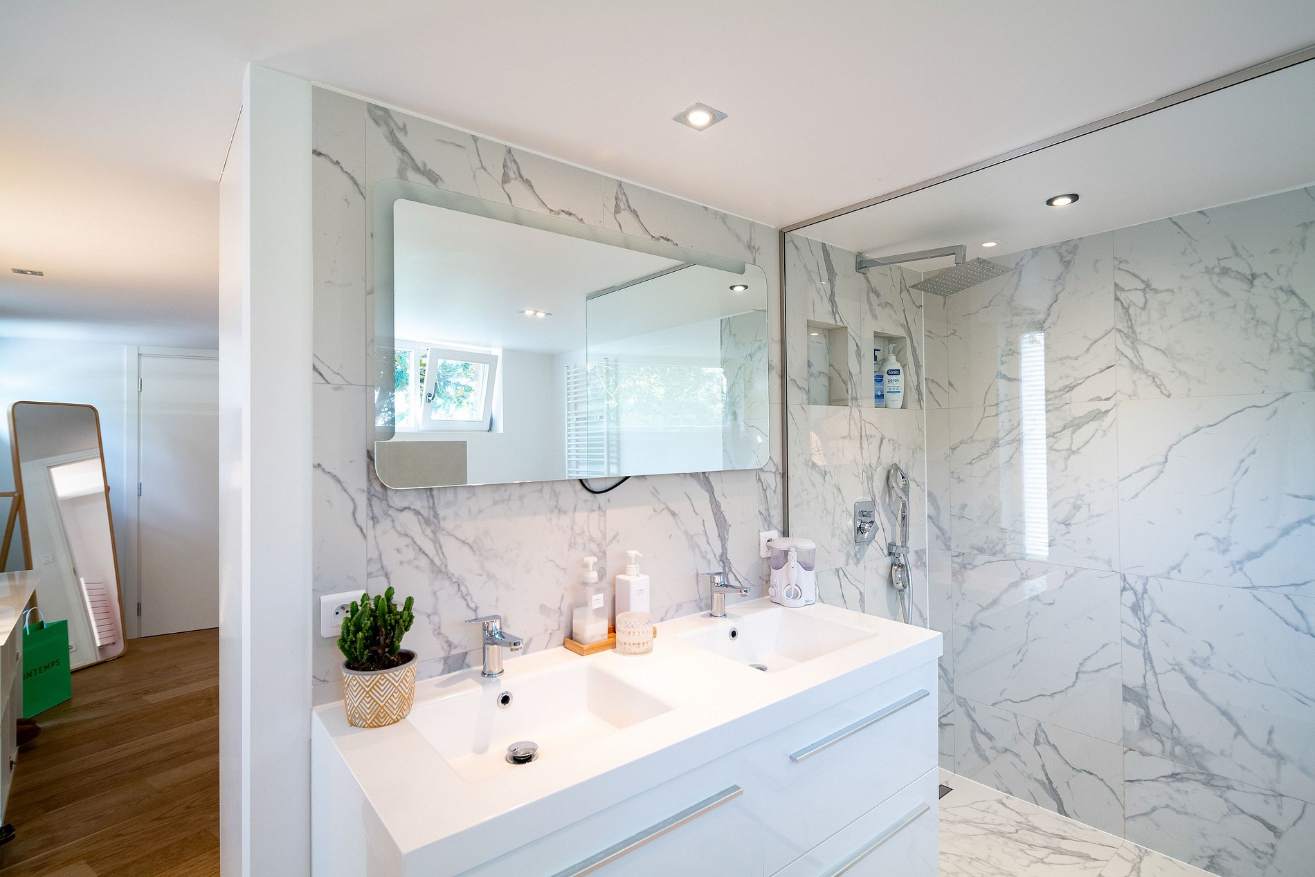 La propriété dispose de 4 chambres, chacune avec sa propre salle de bain, offrant un espace intime et confortable pour vos invités. De plus, un bureau convertible en chambre, un home cinéma et une vaste salle de sport avec sauna et salle de jeux sont à votre disposition, vous permettant de vous détendre et de vous divertir en toute élégance.