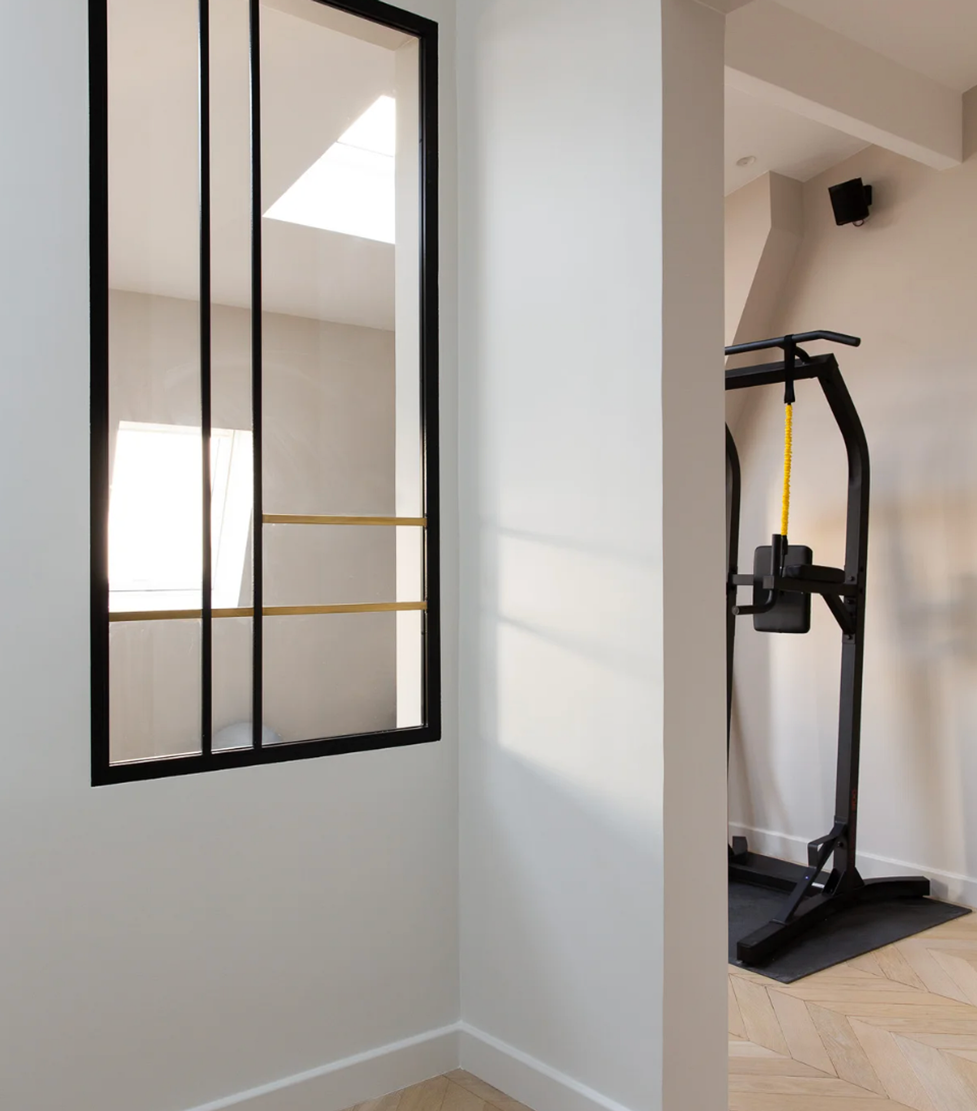 À l'étage se trouvent une salle de sport, ainsi qu'une terrasse reliée à la chambre principale.