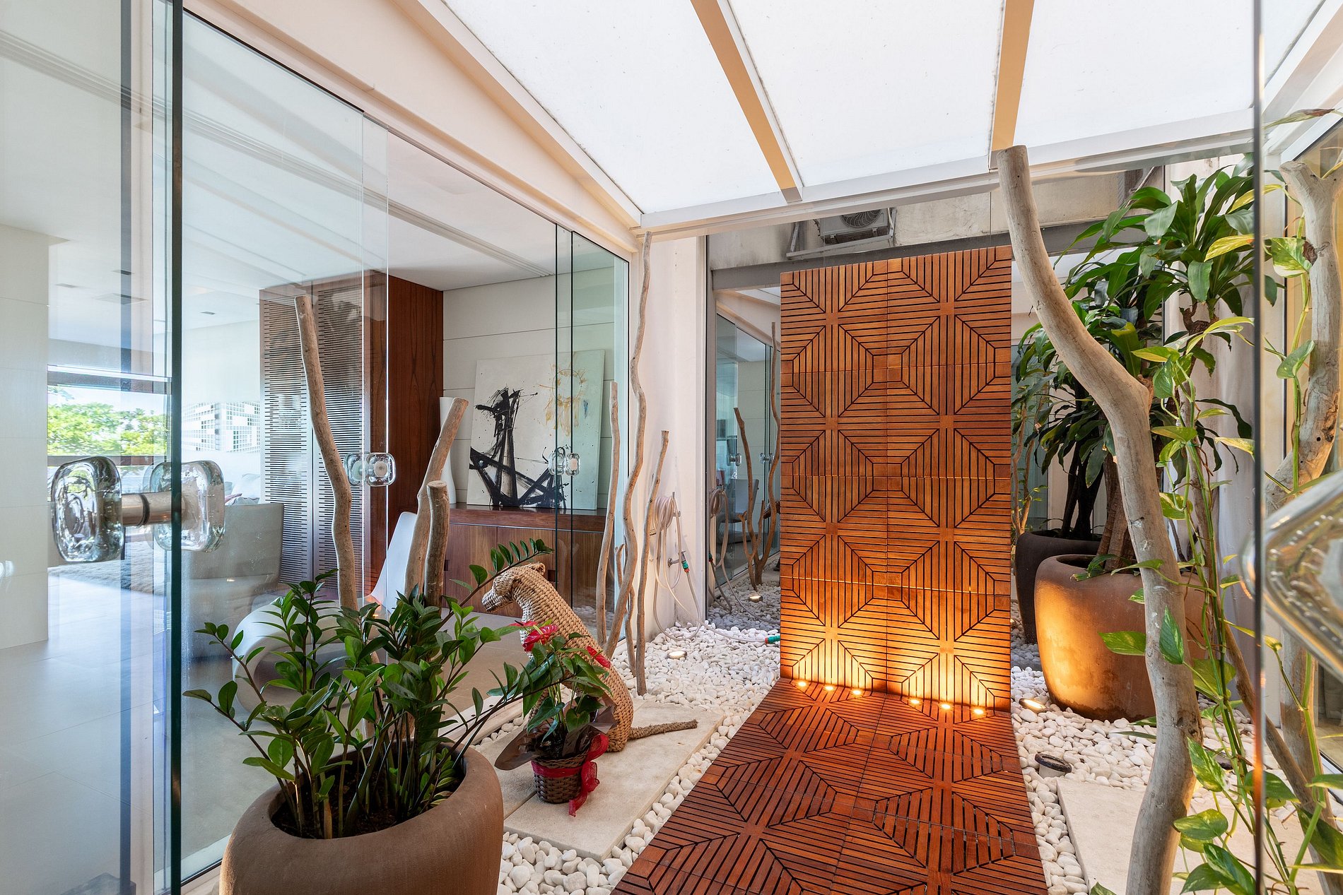 Le salon, spacieux et contemporain, est divisé en deux espaces intégrés, dont l’un peut être aménagé en bureau. La liaison fluide avec la salle à manger met en valeur la luminosité naturelle et encadre la vue sur la mer. Au cœur du plan, un charmant jardin d’hiver décoré apporte une touche de chaleur et d’exclusivité à l’ensemble.