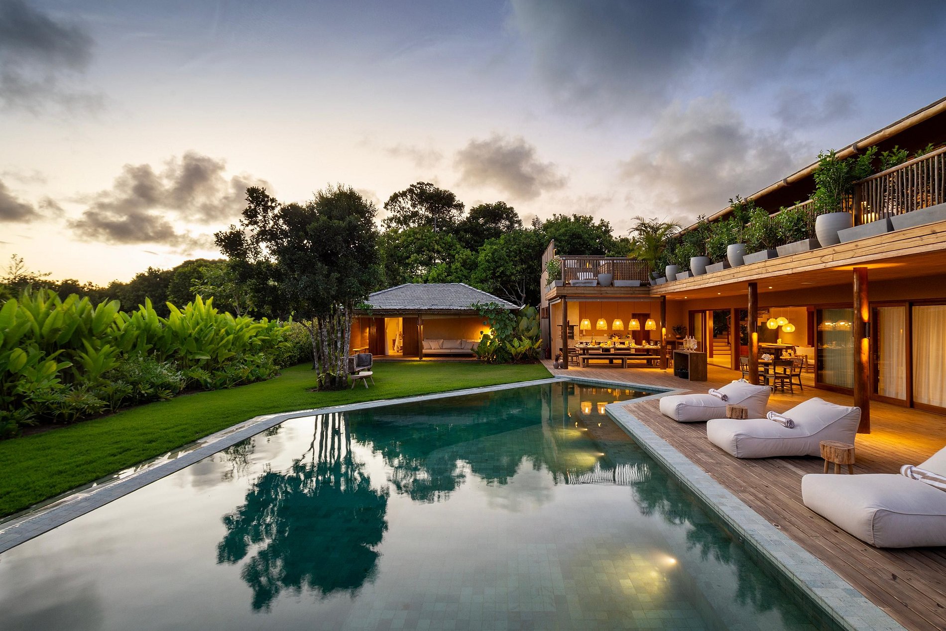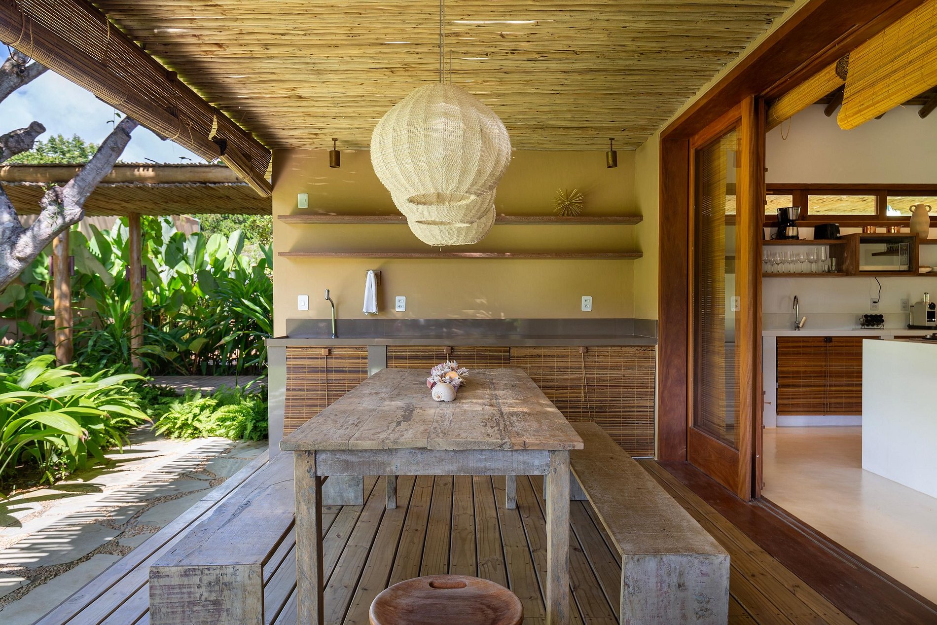 La maison principale comprend un grand salon-salle à manger, une cuisine, une salle de télévision et une suite au rez-de-chaussée. L'étage supérieur comprend trois suites, un solarium, un jacuzzi et un hamac de massage. On y trouve également un espace détente et un balcon avec une piscine à fond vert. La cuisine extérieure est équipée d'un plan de travail avec un évier profond, un congélateur, un congélateur horizontal et une cuisinière industrielle. Un espace gourmand est également disponible avec un barbecue et des glacières à bière. Serviettes de plage et de piscine fournies.