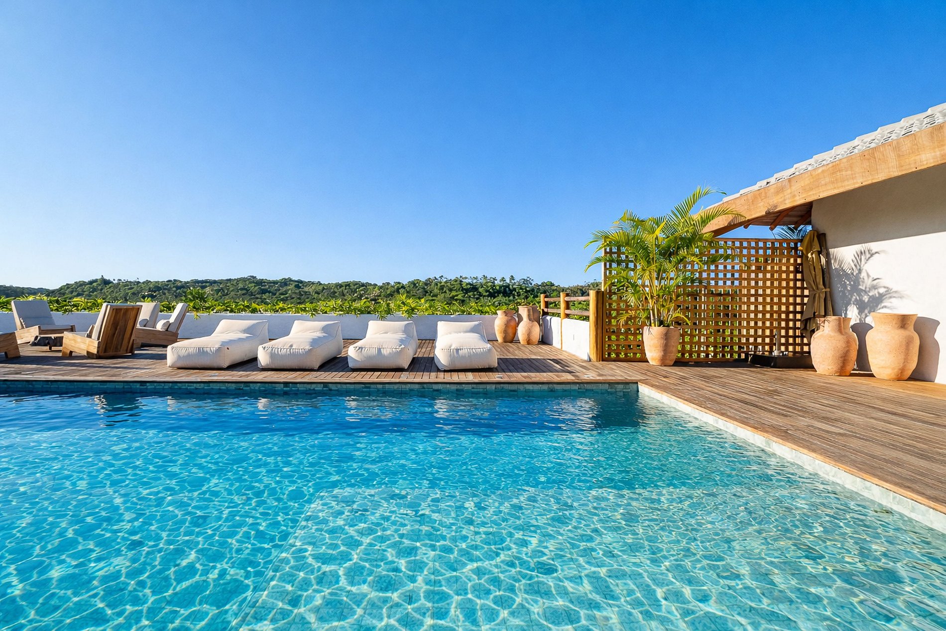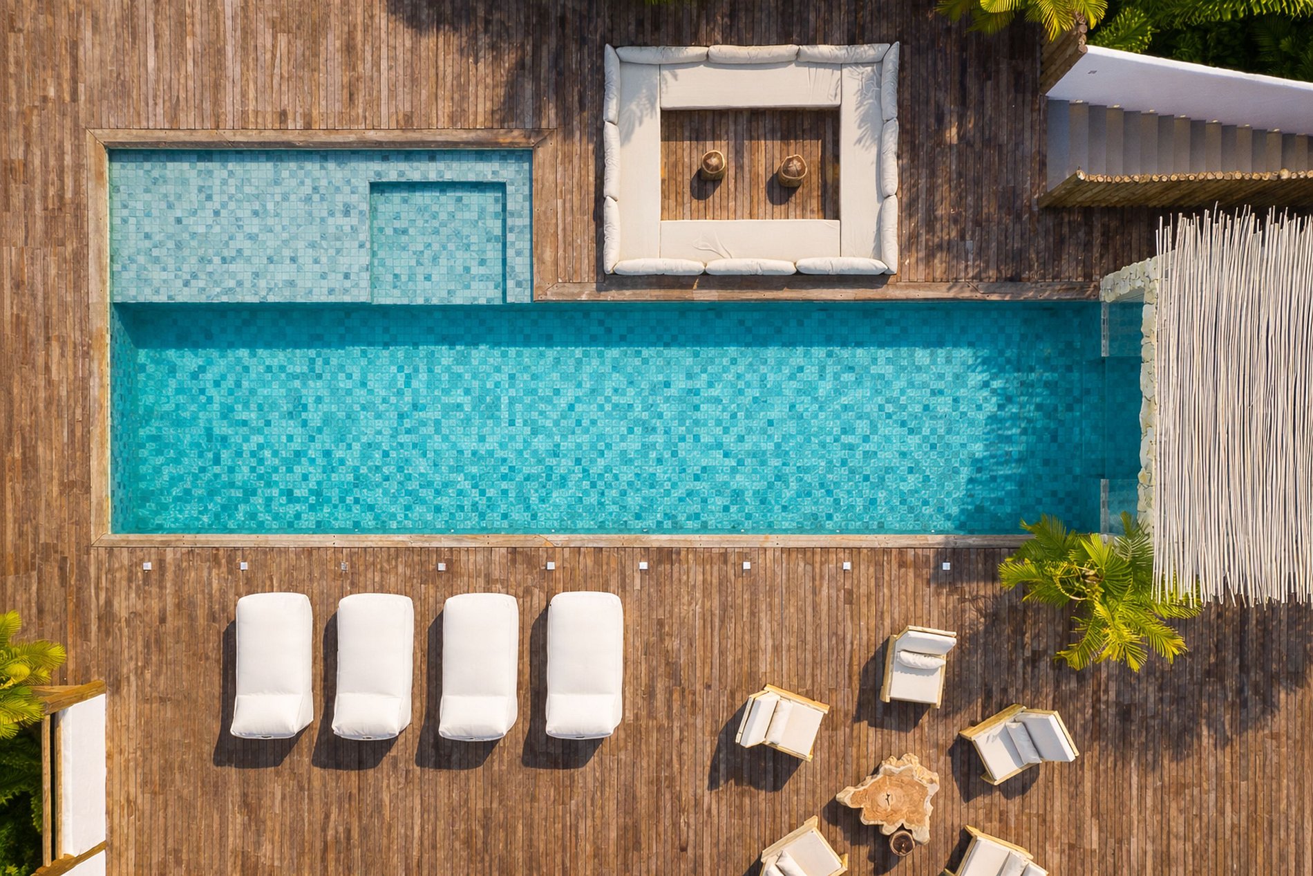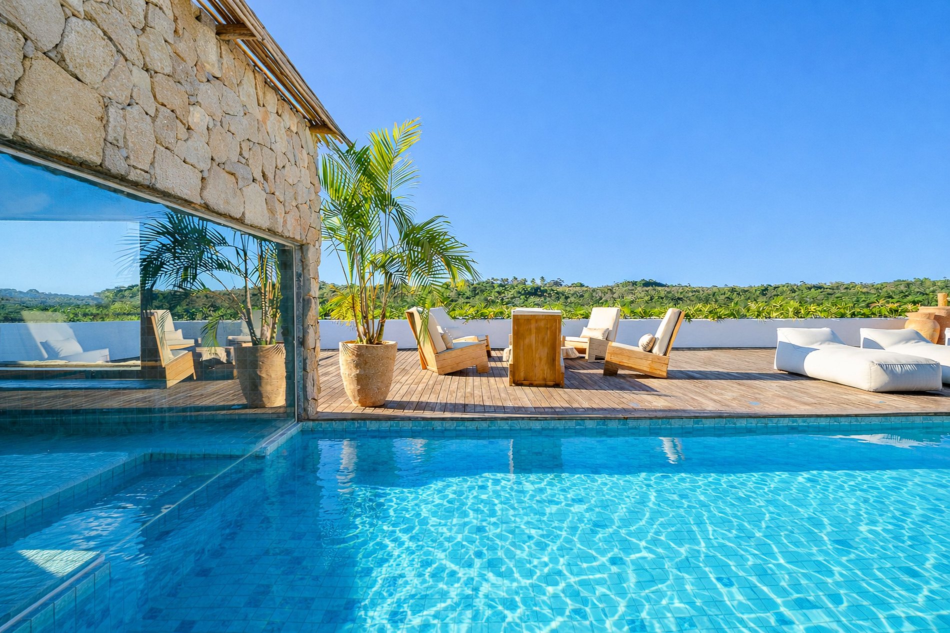Sur la terrasse du balcon, des canapés sont installés au niveau de la piscine. Celle-ci dispose d'un bain à remous dans la partie peu profonde et d'un couloir de nage de 20 mètres menant au sauna. Le hammam, doté d'une paroi vitrée, offre un accès direct à la piscine.