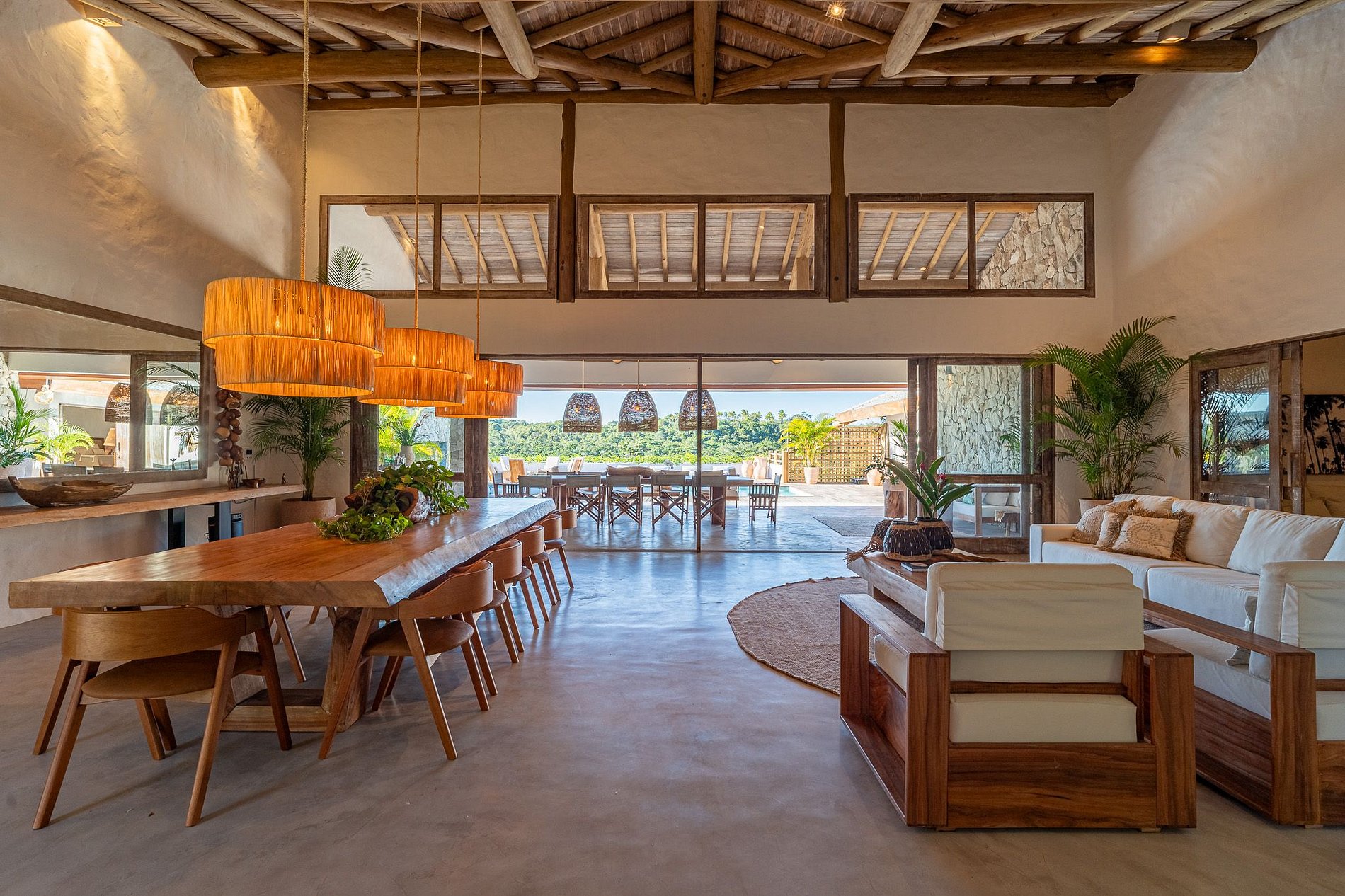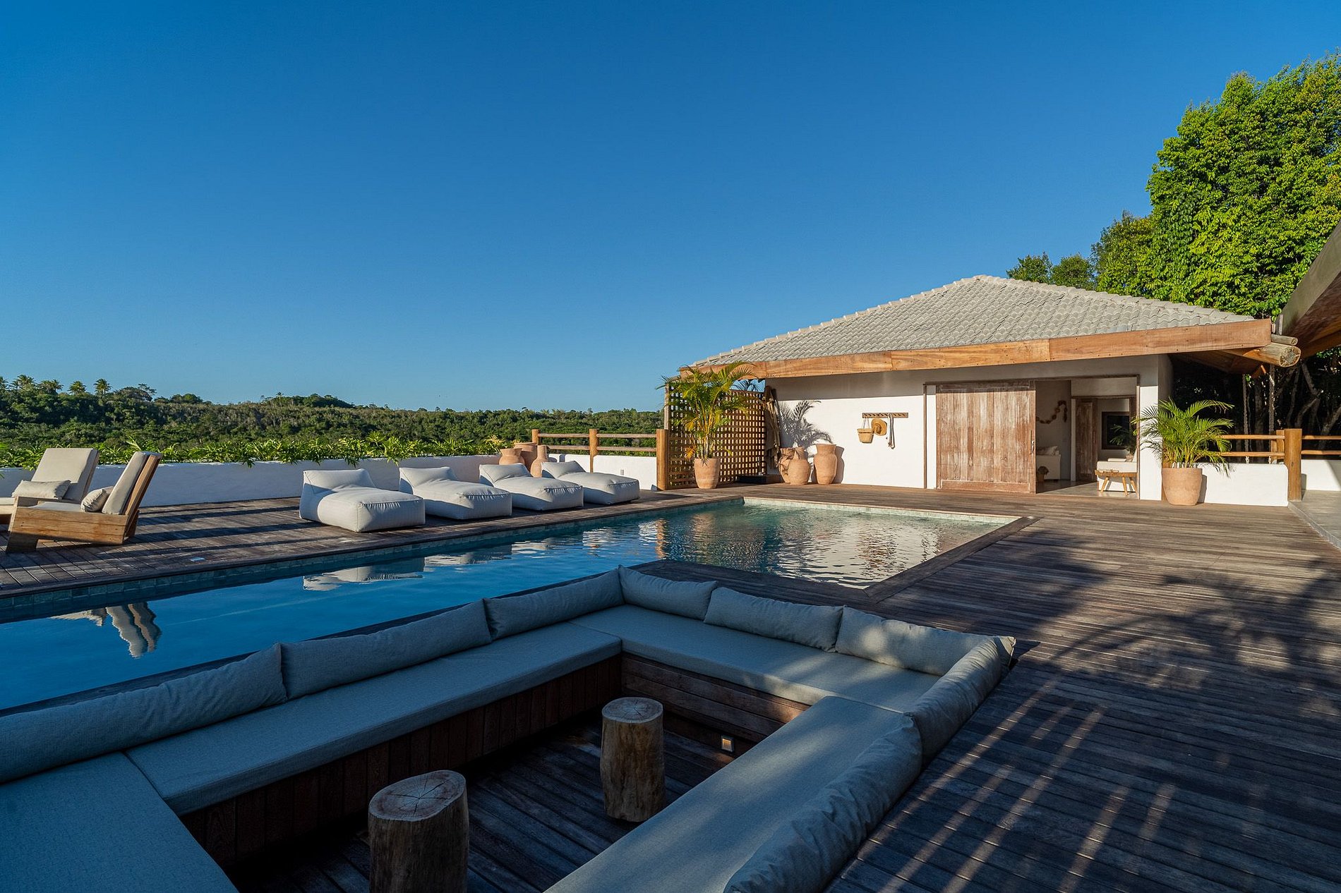 En entrant dans la maison, vous découvrirez un spacieux salon et une salle à manger avec une table pour 12 personnes. Juste à côté se trouve le salon TV climatisé, équipé d'un home cinéma, d'un téléviseur 75 pouces et de canapés confortables. Le balcon, avec ses chaises longues et ses canapés, dispose d'une autre table à manger pour 12 personnes. La cuisine gastronomique est équipée d'un grill électrique, d'une machine à glaçons, d'un refroidisseur à bière, de deux réfrigérateurs et d'un plan de travail avec plaque de cuisson.