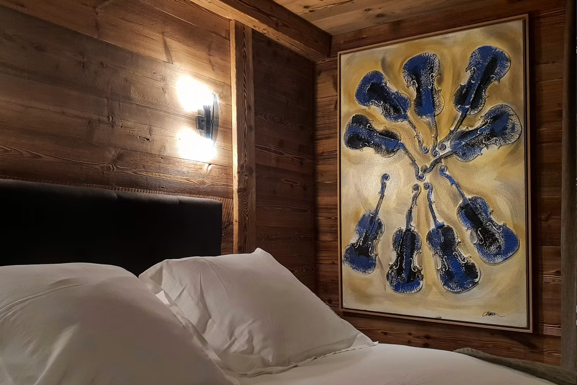 Dans ce lieu où se côtoient en harmonie la chaleur du vieux bois, le confort de la modernité et la beauté de l’art, omniprésent. Le Chalet s’étend sur trois étages, de plain-pied l’espace à vivre (avec son salon, son bar, sa cuisine, sa salle à manger autour de la cheminée) s’ouvre sur le jardin,