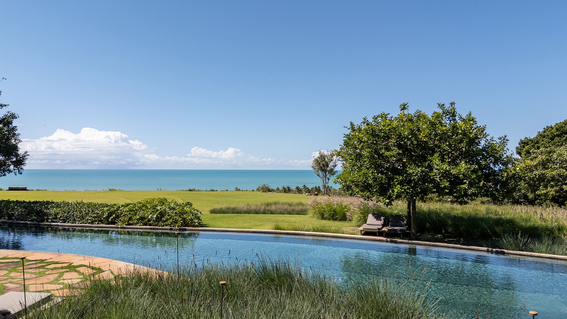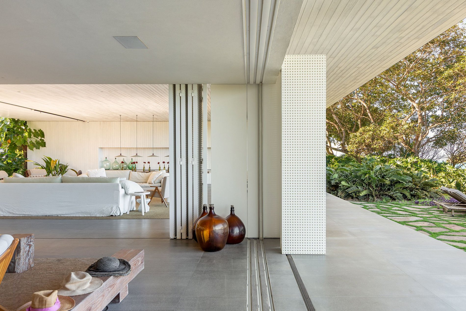 Nichée au sommet d’une falaise de près de 20 mètres de haut, la villa repose sur de solides poutres d’acier qui la protègent des vents marins, donnant l’impression qu’elle flotte délicatement au-dessus du sol. Le résultat est un refuge qui allie grandeur et légèreté, en dialogue constant avec la mer et la nature environnante. Dès l’entrée, les visiteurs découvrent un vaste séjour ouvert de plus de 170 m², où les espaces de réception et de repas s’étendent naturellement vers l’extérieur. Le mobilier, soigneusement sélectionné dans des antiquaires de São Paulo et retapissé dans des tons naturels, évoque une élégance intemporelle en contraste poétique avec le décor tropical. De grands panneaux mobiles en Viroc se replient comme des paravents, effaçant les frontières entre intérieur et extérieur et offrant une expérience sensorielle faite de transparences, de jeux de lumière et d’ombres changeantes. La villa dispose de quatre suites raffinées, toutes conçues pour sublimer la lumière naturelle et offrir des vues imprenables sur la mer. Les larges baies coulissantes s’ouvrent sur les jardins et l’horizon, prolongeant la vie intérieure dans une continuité fluide avec le paysage. À côté du séjour principal, un jardin tropical méticuleusement conçu projette des reflets et des ombres mouvantes à l’intérieur, créant une véritable scénographie visuelle. À la nuit tombée, un éclairage architectural révèle chaque détail et magnifie le paysage luxuriant. L’ensemble compose une atmosphère exclusive, subtile et d’une élégance intemporelle, faisant de cette propriété l’une des plus précieuses de Trancoso.