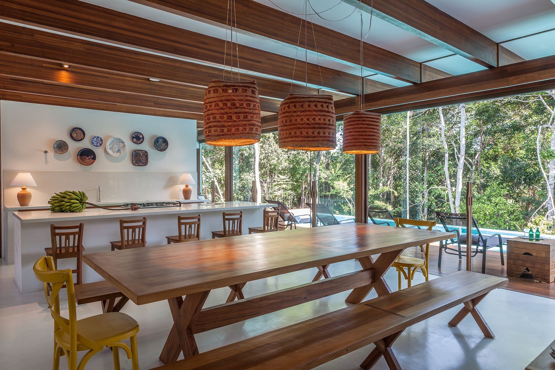 A espaçosa área social, com espaço de estar/TV, grande mesa de jantar e uma linda cozinha com bancada alta, fica aberto no deck e na piscina de borda infinita com vista para a copa das árvores.