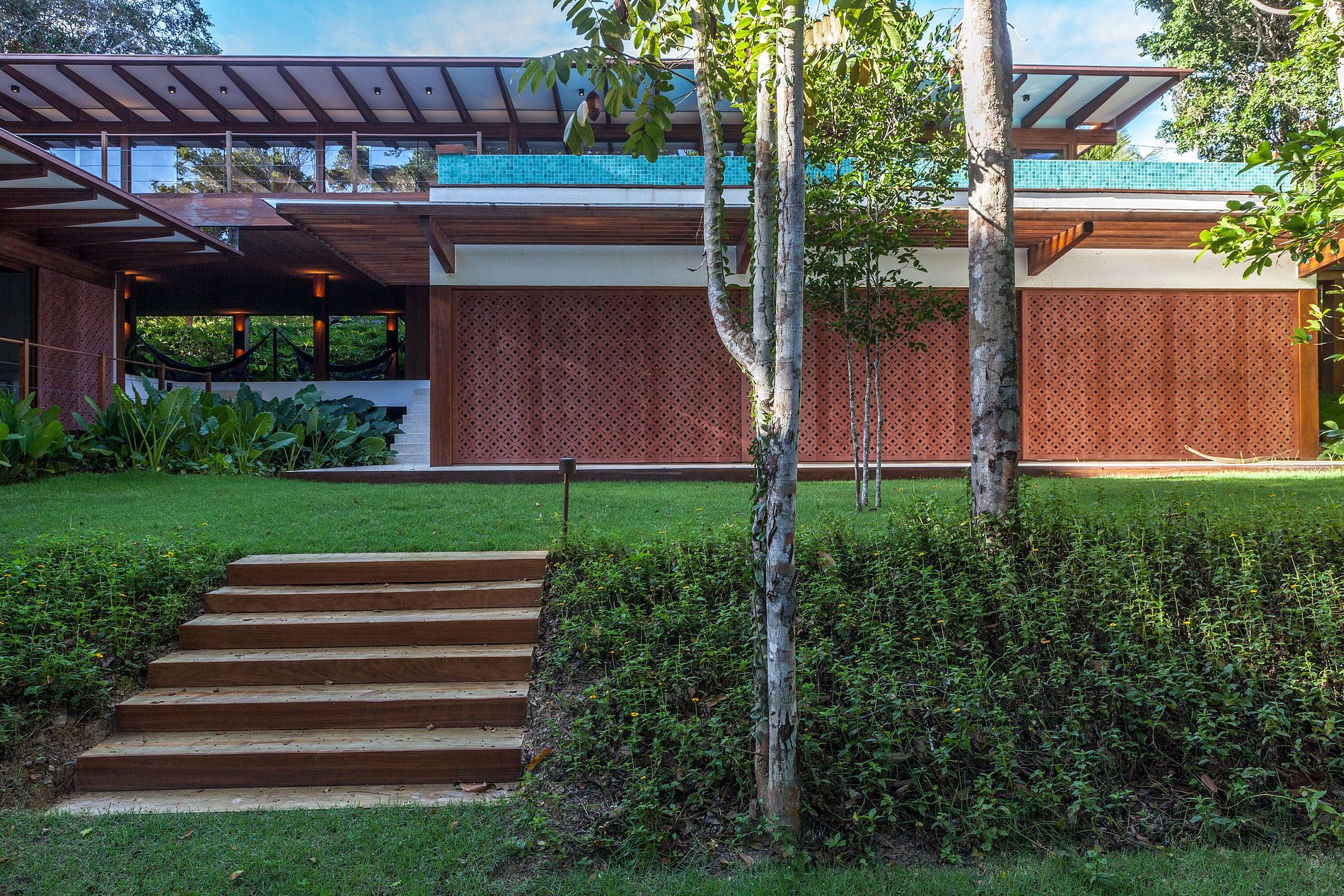 Descendo alguns degraus, você chegará numa área coberta, um redário para relaxamento e leitura com redes, esteiras e almofadas, ao lado de uma suíte de hóspedes.