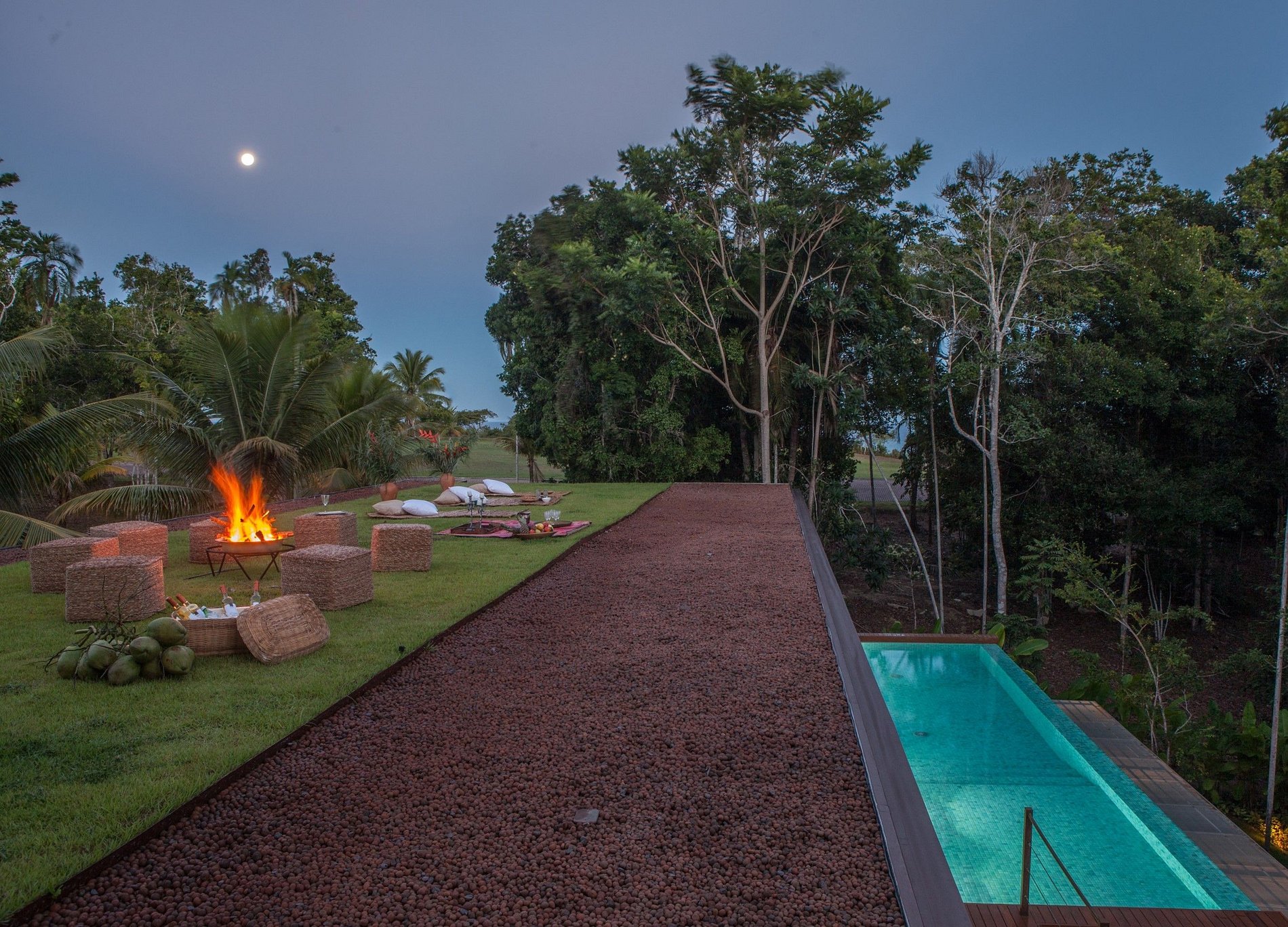 Descendo alguns degraus, você chegará numa área coberta, um redário para relaxamento e leitura com redes, esteiras e almofadas, ao lado de uma suíte de hóspedes.