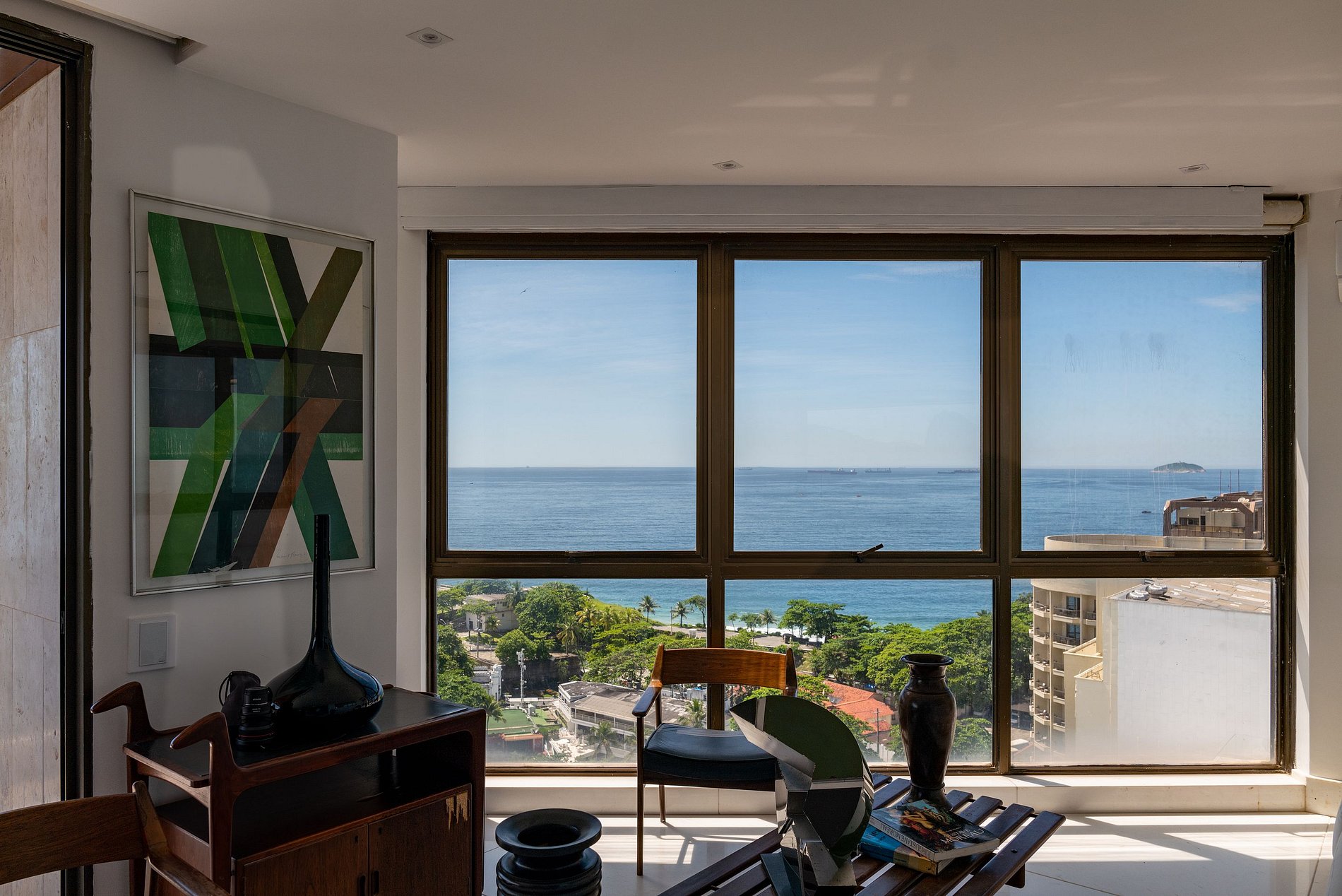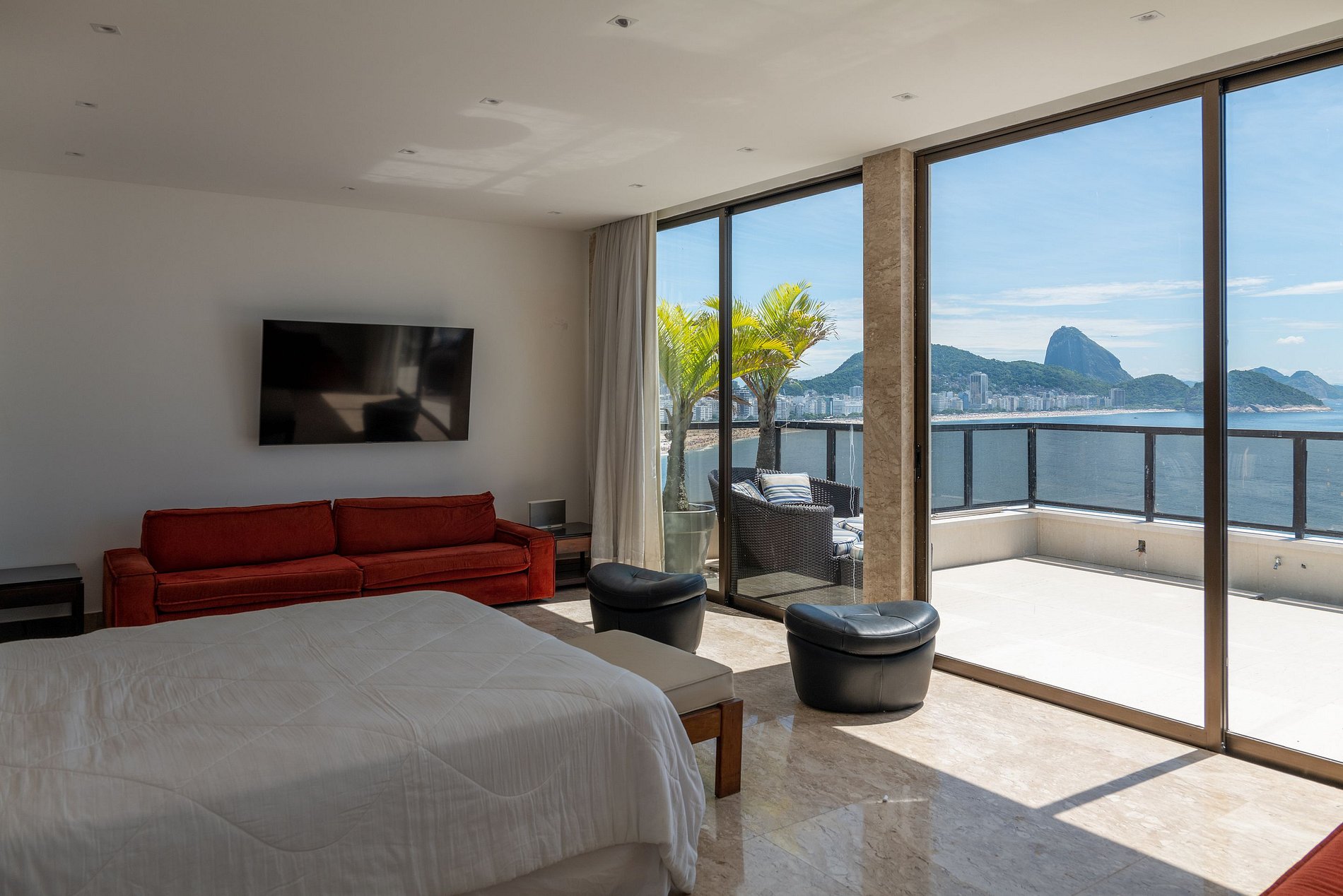 Uma luxuosa cobertura com ampla vista de toda a orla de Copacabana, do forte e ao longe as montanhas que cercam a cidade maravilhosa e oferece a todos uma excelente vista da natureza vibrante do Rio.