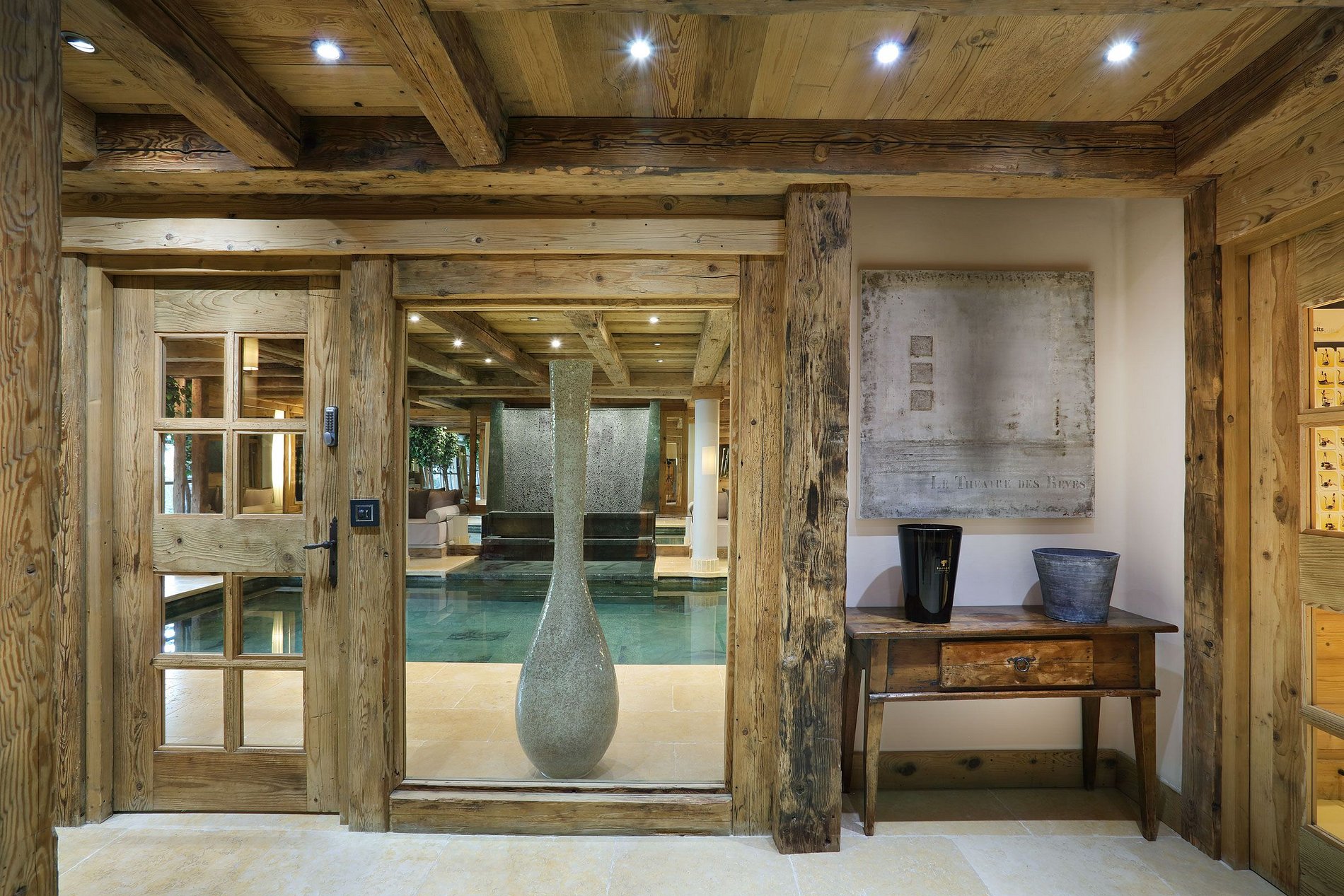 A área de spa privativa do refúgio oferece um mergulho na relaxação e bem-estar. Entregue-se ao encanto da grande piscina aquecida adornada com uma tranquila cascata, ou deixe-se envolver pelo vapor do hammam. Para aqueles que procuram um alívio ativo, a sala de fitness está pronta com equipamentos de ponta. O entretenimento é de suma importância no Chalet Alp002. Cada quarto é um santuário tecnológico com Apple TV e telas LCD, harmonizado com uma atmosfera de perfeição acústica através de um sistema de som BOSE. Além desses retiros pessoais, o chalé abriga uma sala de jogos e um cinema privativo, equipado com um projetor de vídeo de última geração e assentos luxuosos para a noite de cinema definitiva em casa.