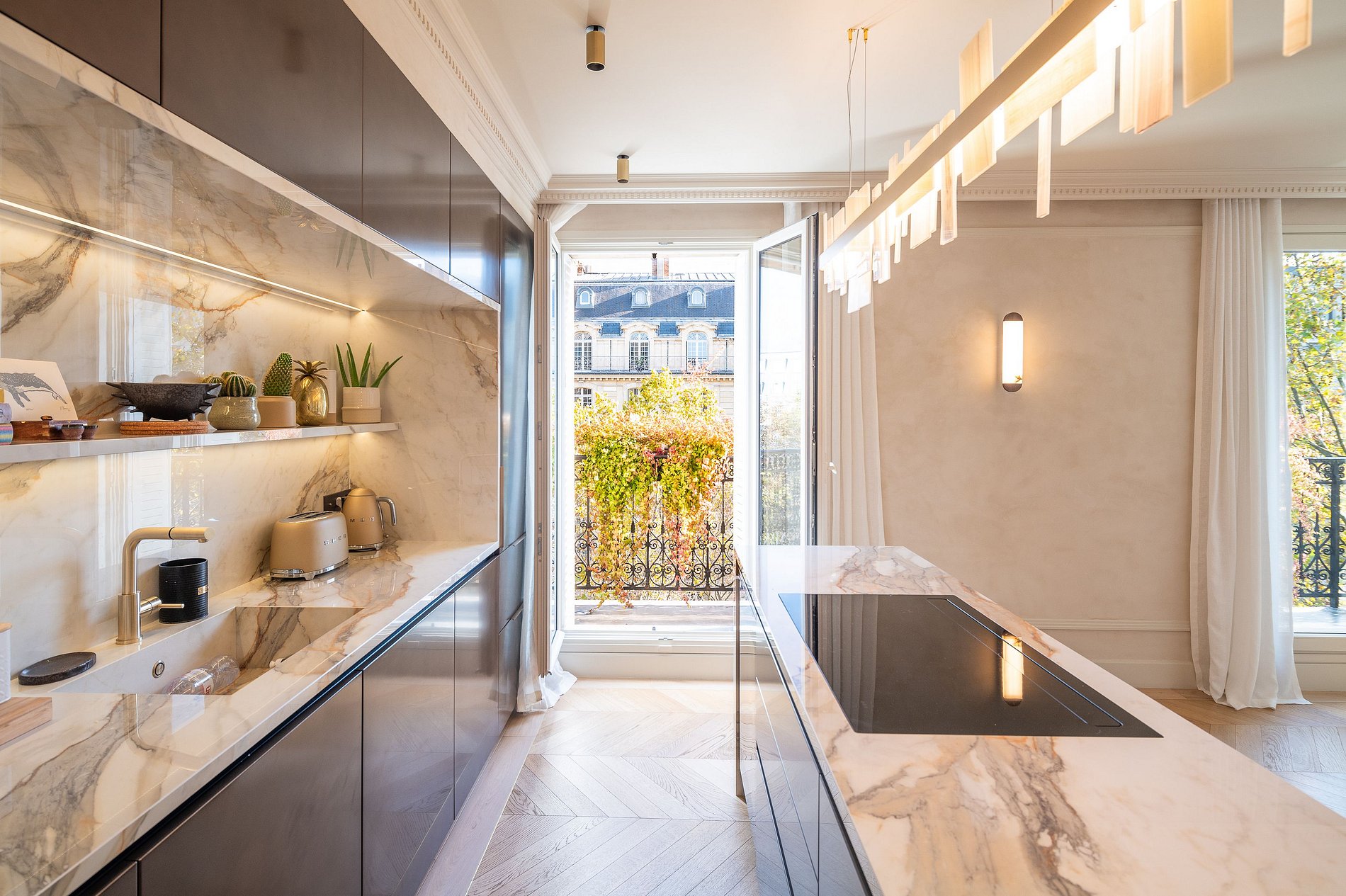 Cada ambiente oferece vistas deslumbrantes, enquadrando a linha do horizonte de Paris de maneira que cada olhar pelas janelas capture o encanto da cidade. A luz natural abundante banha o espaço, criando uma atmosfera arejada e convidativa ao longo do dia.