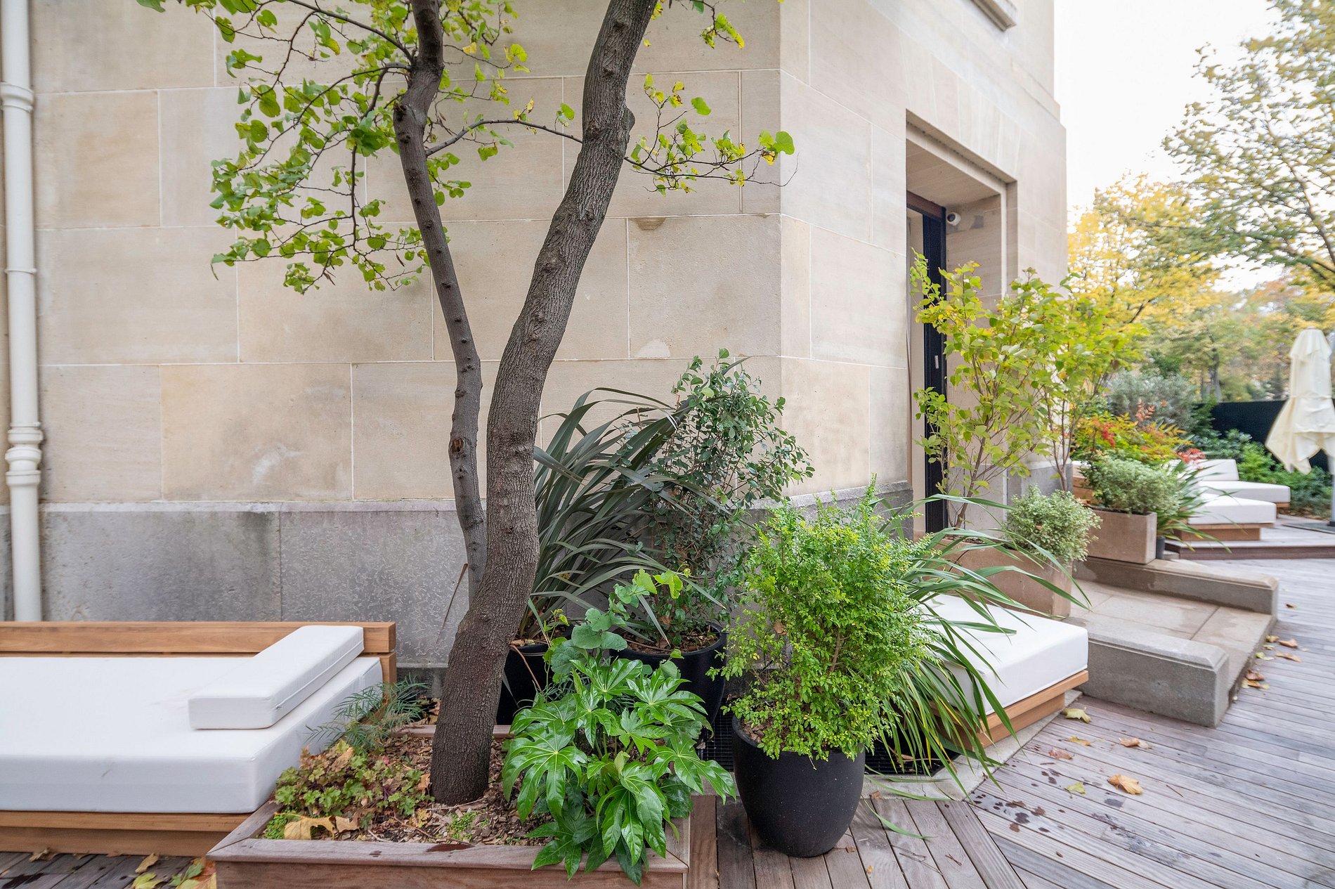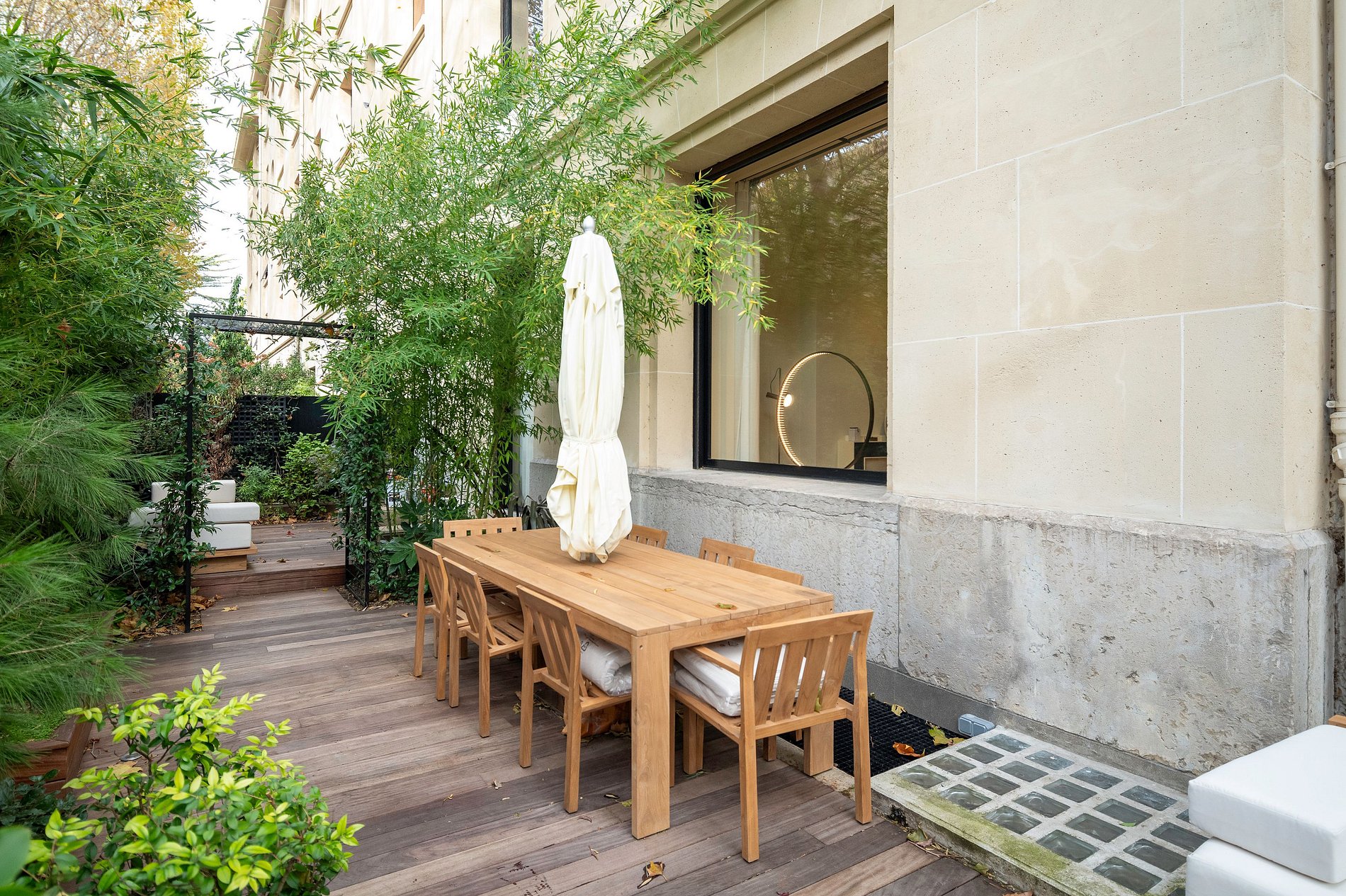 A varanda, por si só, é um destaque, oferecendo uma área de jantar onde os hóspedes podem desfrutar de refeições ao ar livre enquanto apreciam a vista da cidade. É um local ideal para um café da manhã ou um momento de relaxamento à noite, proporcionando um oásis de tranquilidade no coração de Paris.