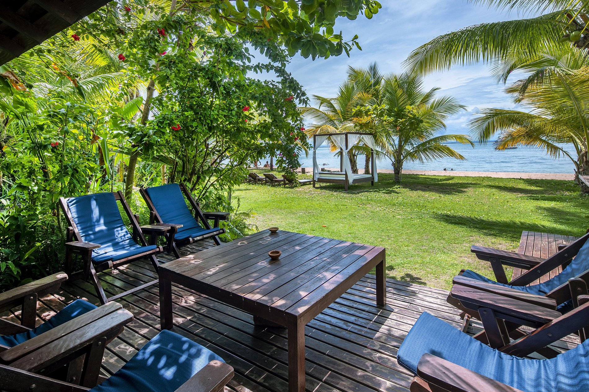 Área gourmet frente a baía com mesas, cadeiras, day-beds, espreguiçadeiras