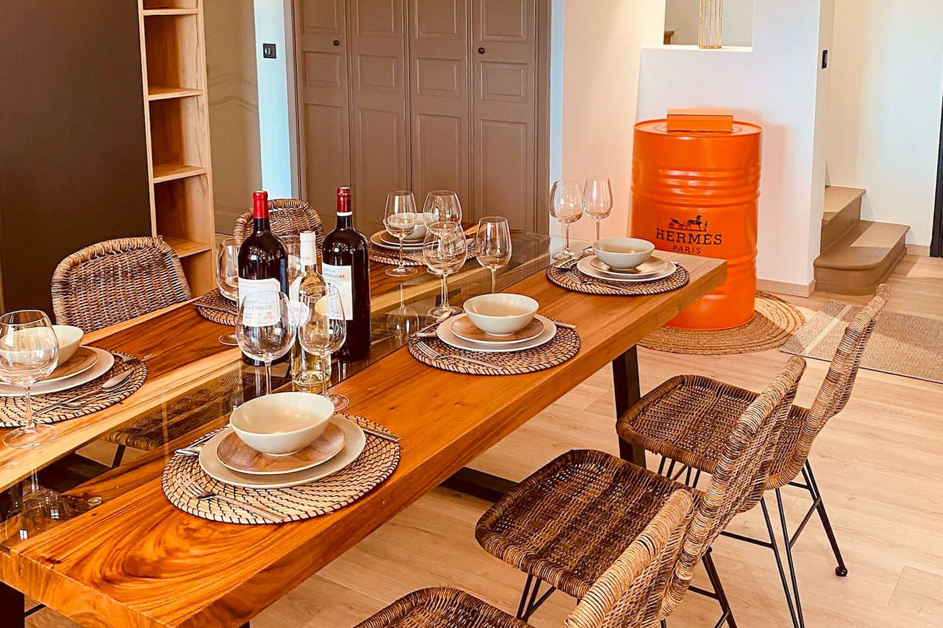 Uma grande mesa de madeira debaixo de sua árvore, à sombra dos canisses, também pode receber almoços e jantares, para variar a atmosfera, a menos que você prefira a sala de jantar coberta e o frescor do ar condicionado no meio do verão ou o calor da lareira no inverno.