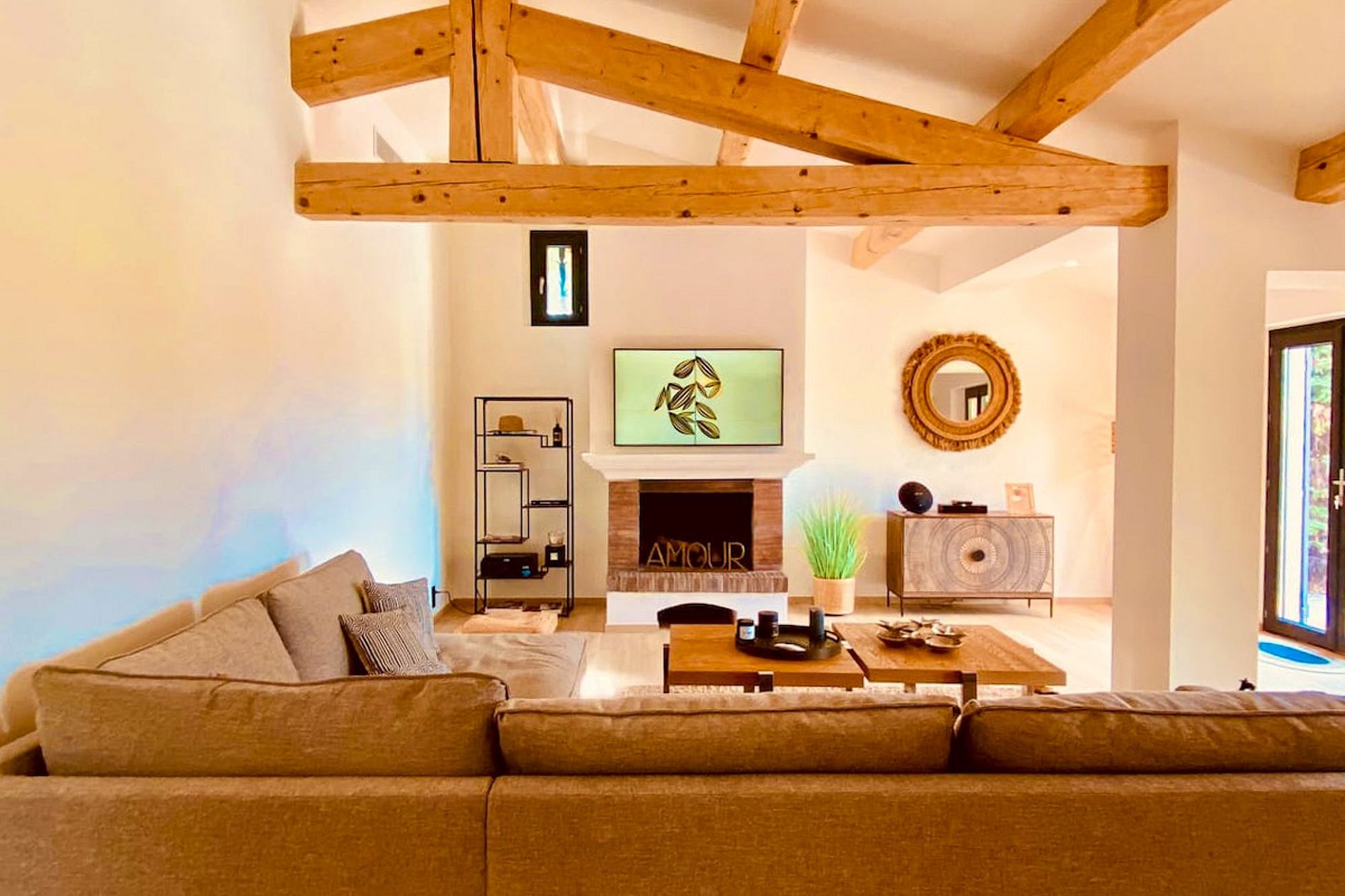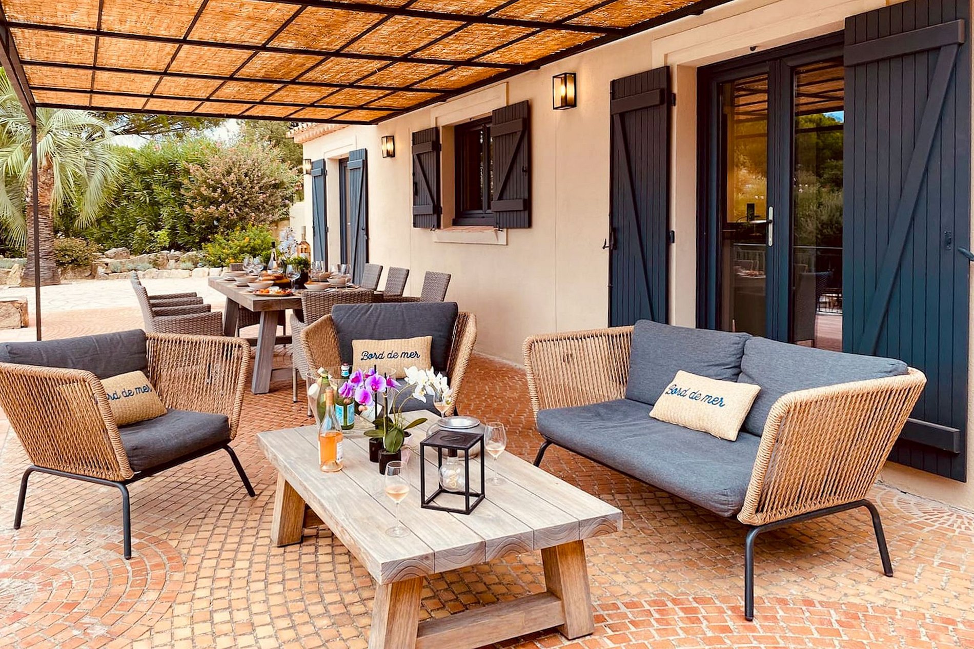 Além de uma agradável sala de estar interior, sob sua estrutura de madeira, a casa oferece 2 salas de estar exteriores para aperitivos com amigos.